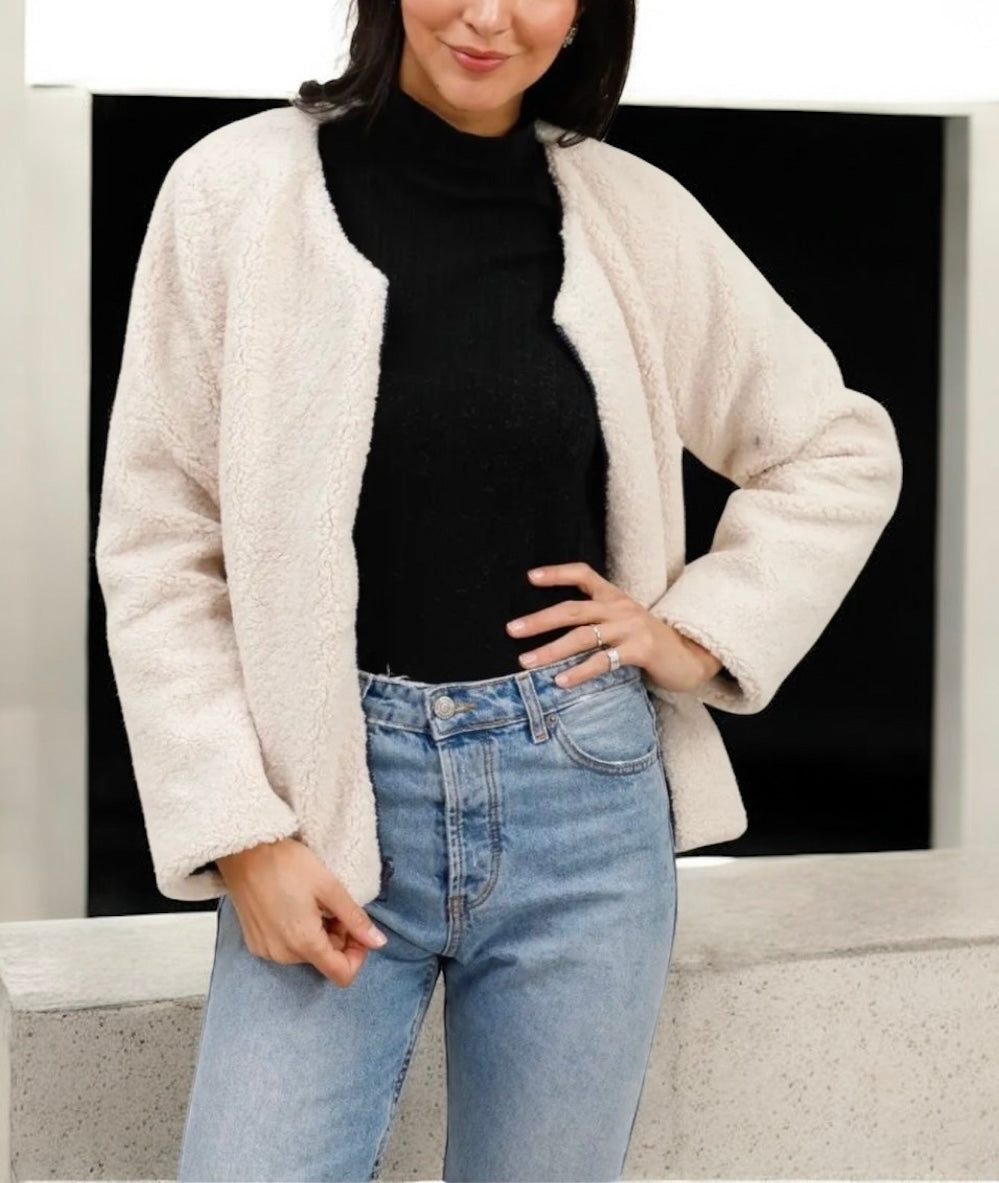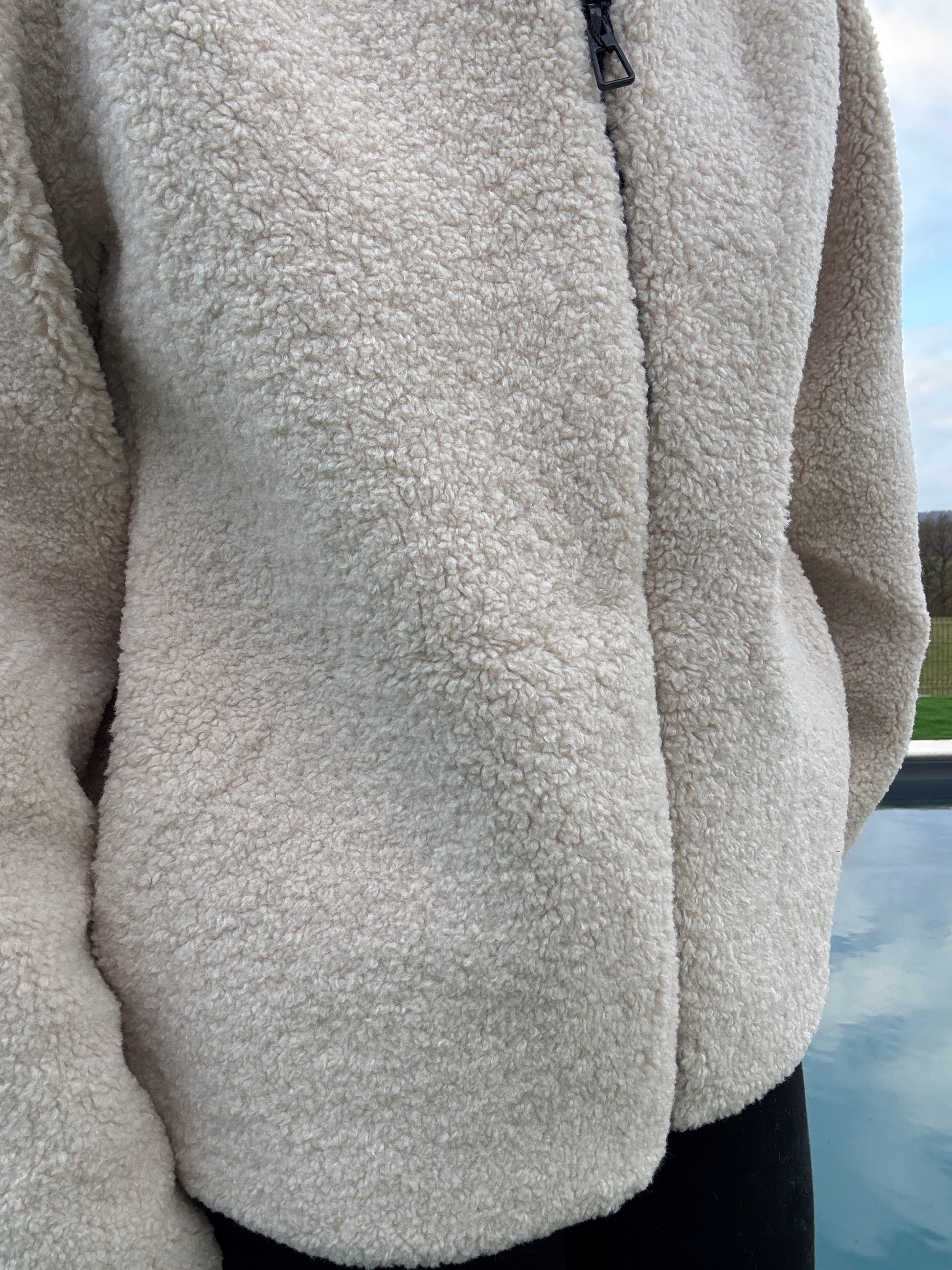 L'intérieur est doublé en sherpa beige, visible le long de l'ouverture frontale sans fermeture éclair.