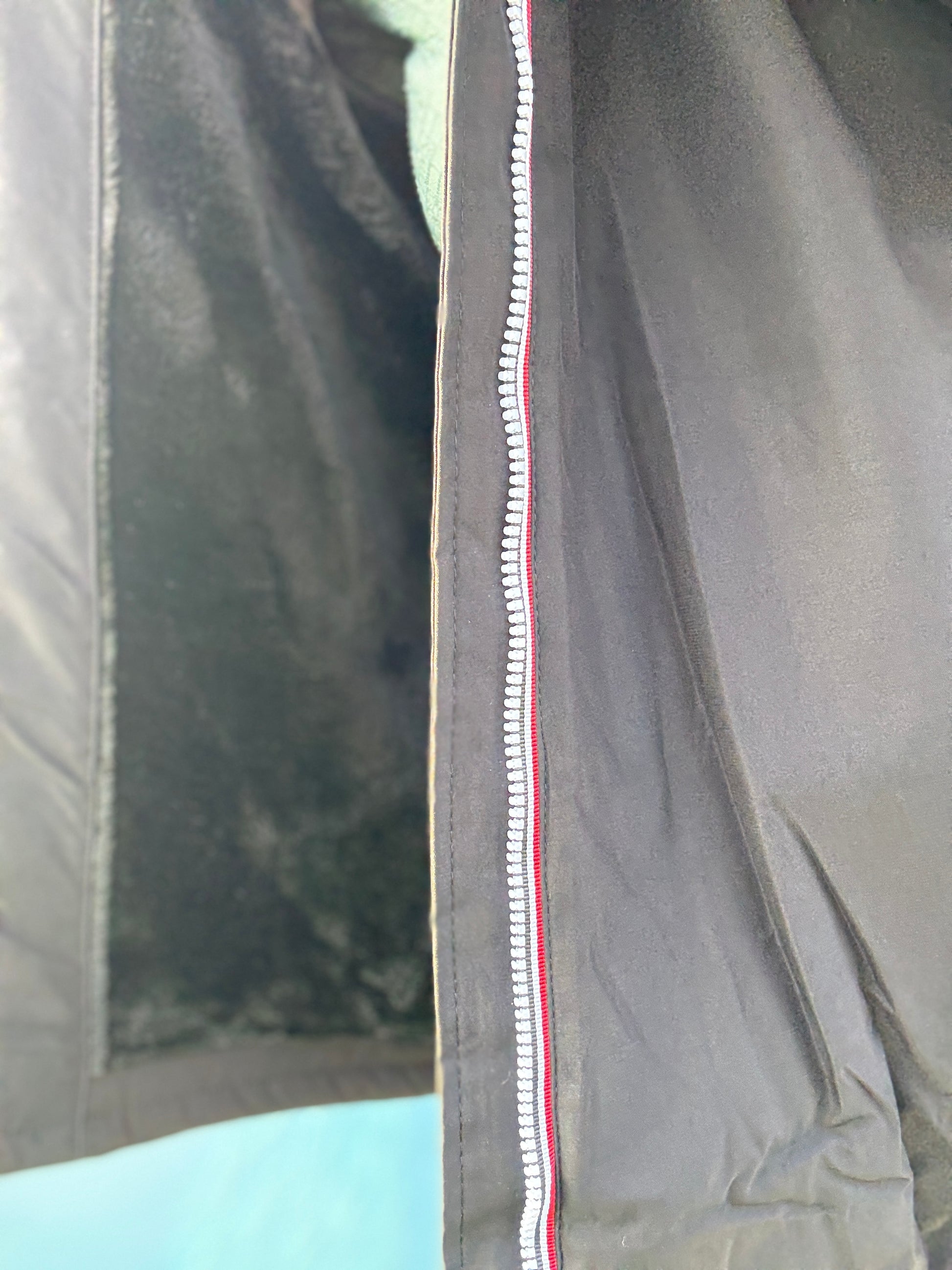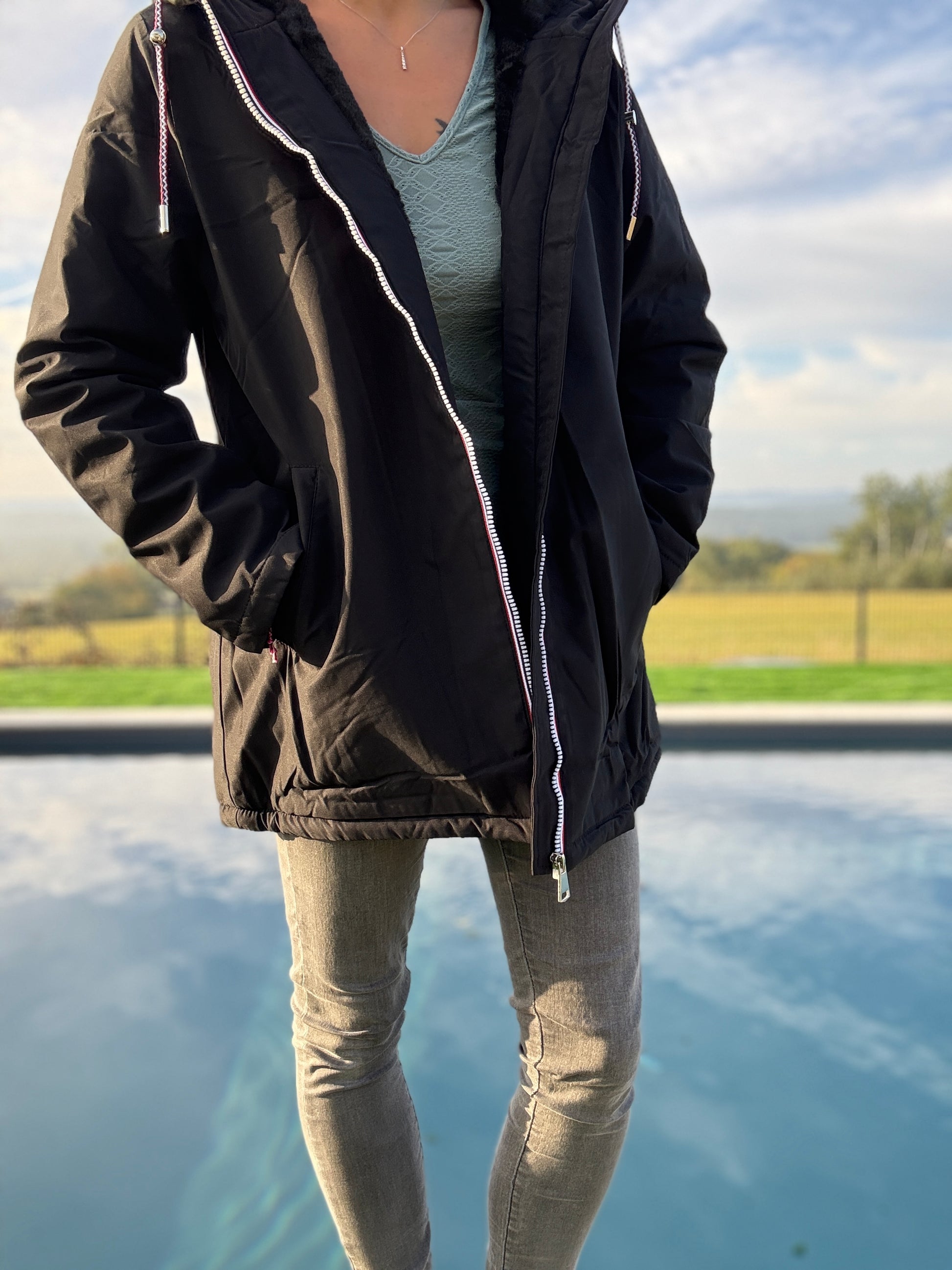 Cette veste imperméable est de couleur noire arrive en bas des fesses. Elle présente une fermeture éclair centrale tricolore qui s'étend sur toute la longueur.