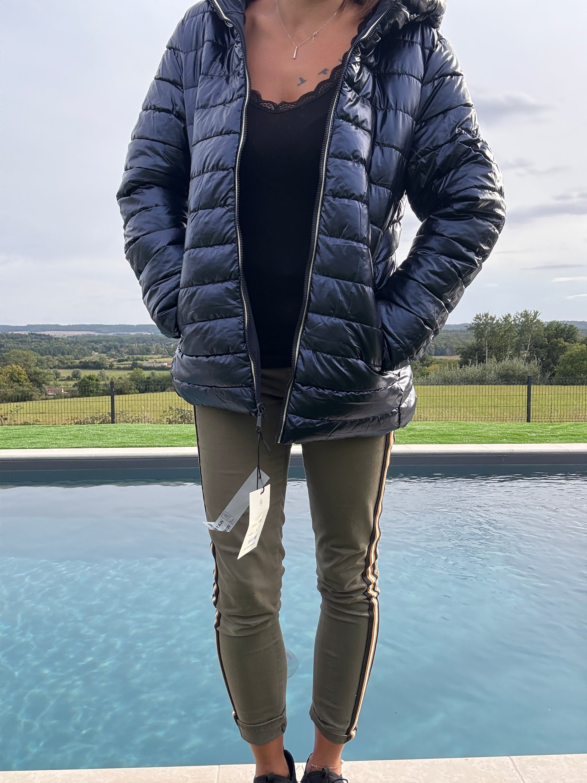 La doudoune présente une finition bleu marine classique. Elle est réversible, offrant deux styles en un seul vêtement : une face matelassée et une face lisse. La fermeture éclair centrale est visible à l'avant, ajoutant une note de modernité. Le modèle comporte également une capuche pour plus de confort et de praticité par temps froid. Les poches zippées sur les côtés permettent de ranger vos effets personnels en sécurité.
