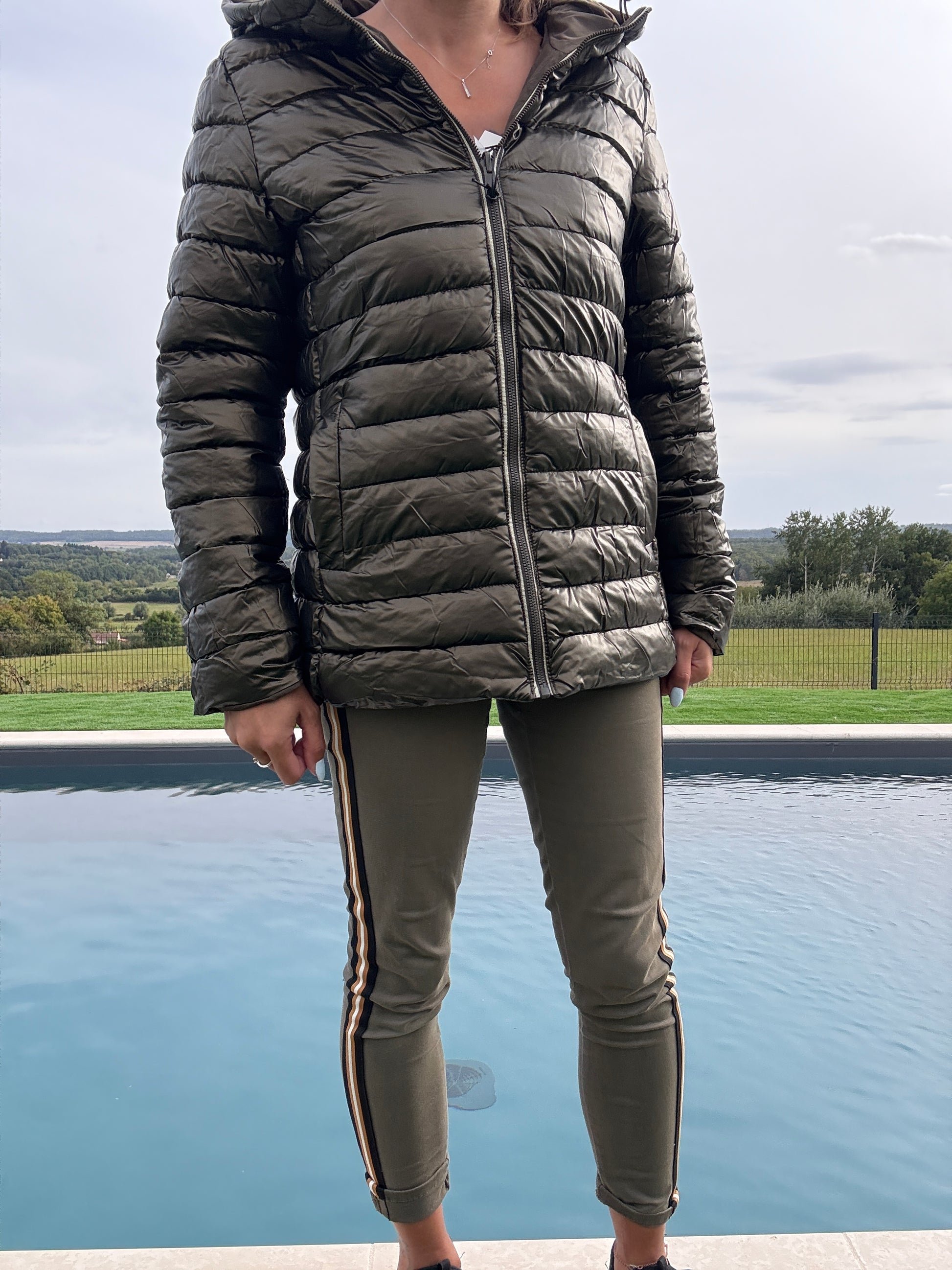 Melya Melody - Manteau court marron/kaki réversible et imperméable matelassé kaki brillant
