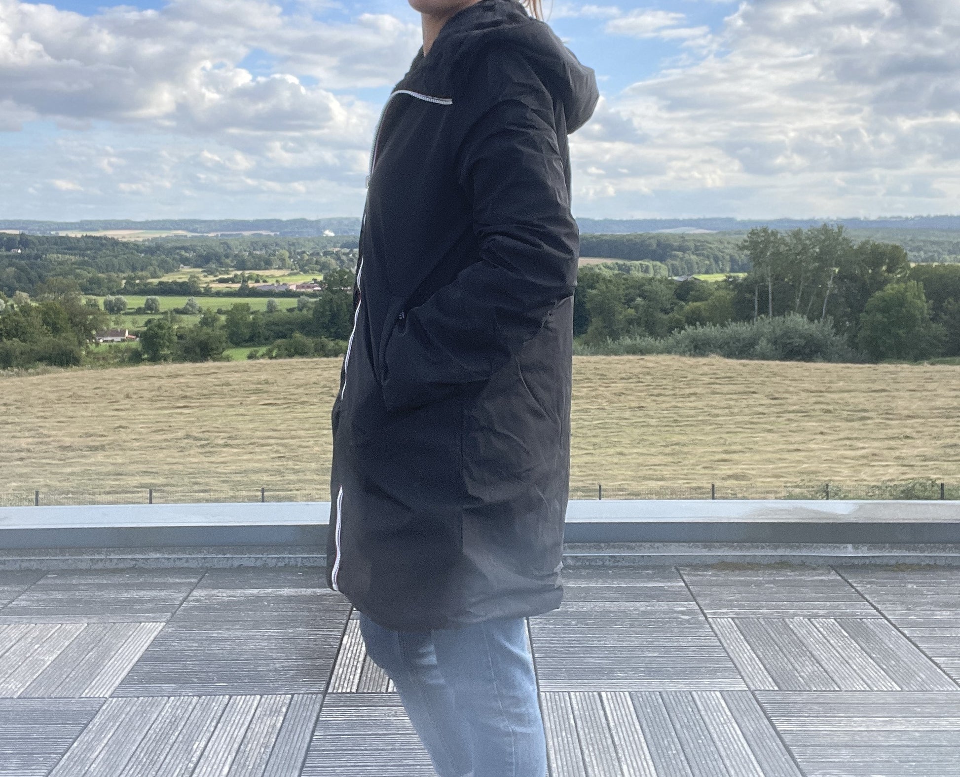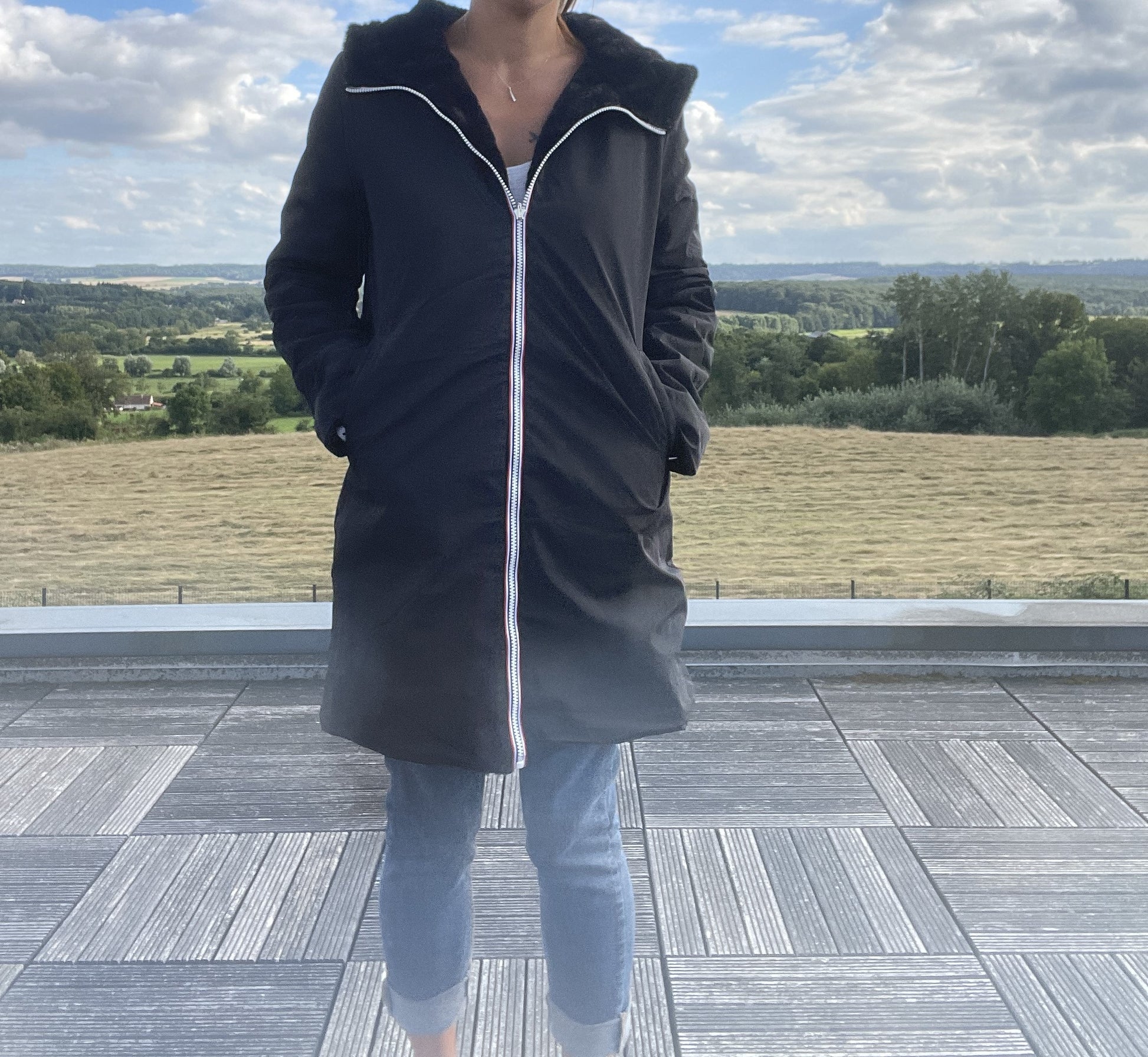 Le manteau présente deux faces distinctes, les deux sont noires.