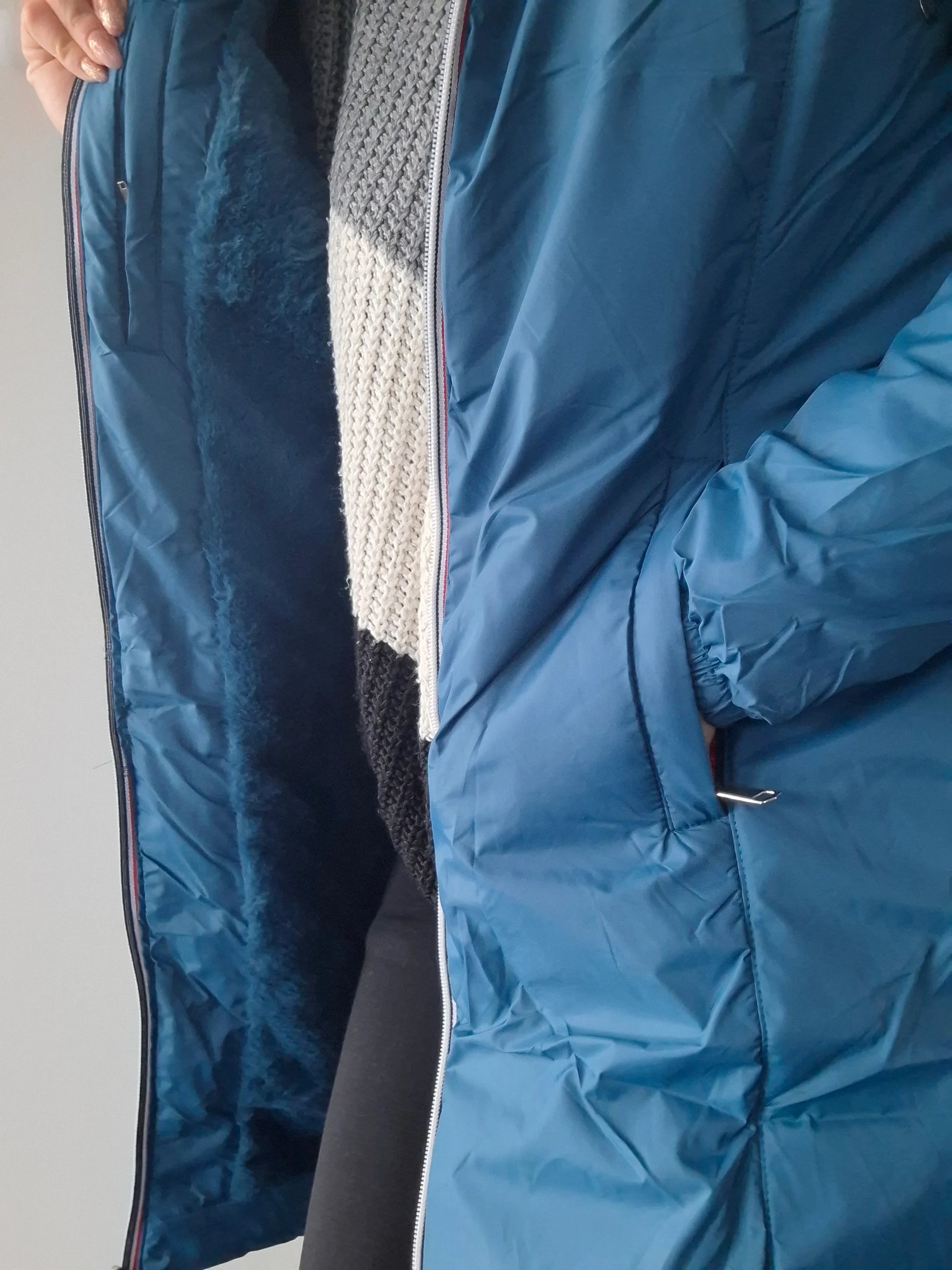 Le manteau long est de couleur bleu canard avec une finition matelassée. Il dispose d'une fermeture éclair sur toute la longueur à l'avant, accentuée par un liseré blanc. Les manches sont longues et le design est ajusté pour une silhouette élégante. Les détails sont minimalistes avec des poches discrètes de chaque côté.
