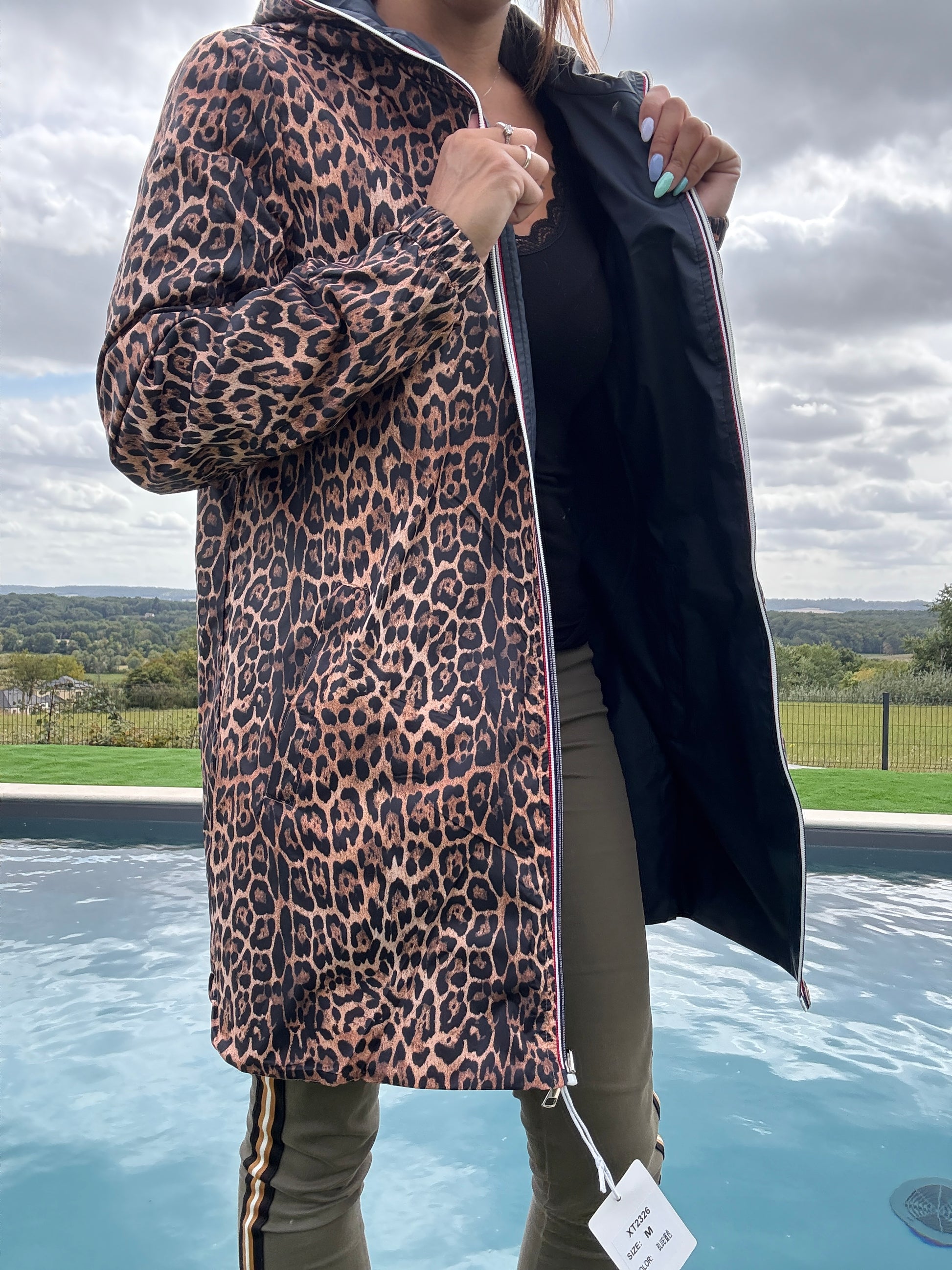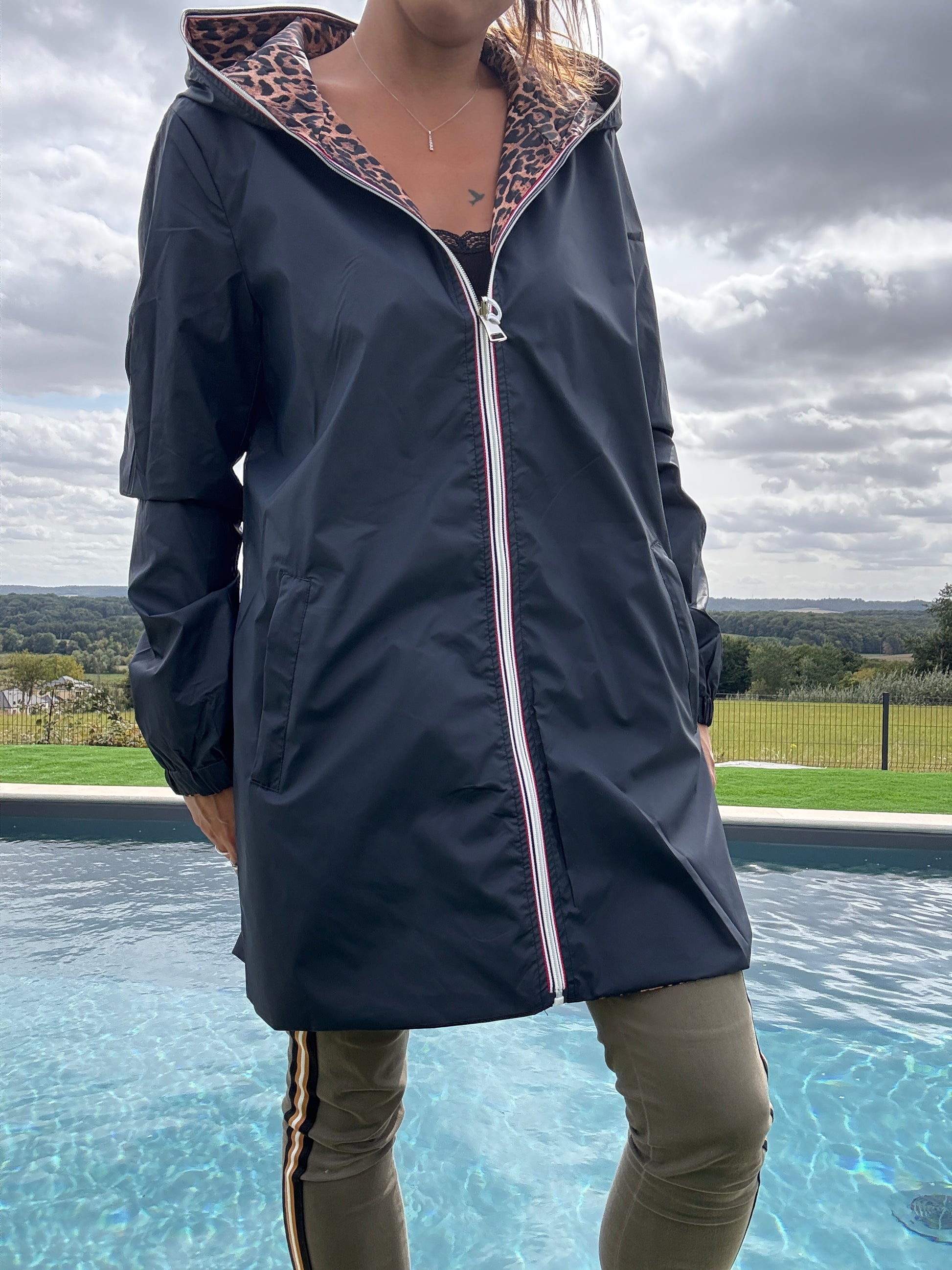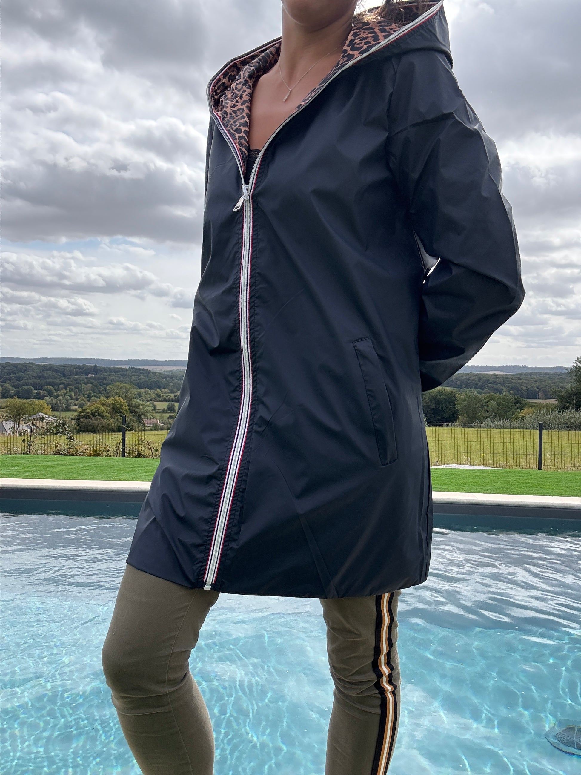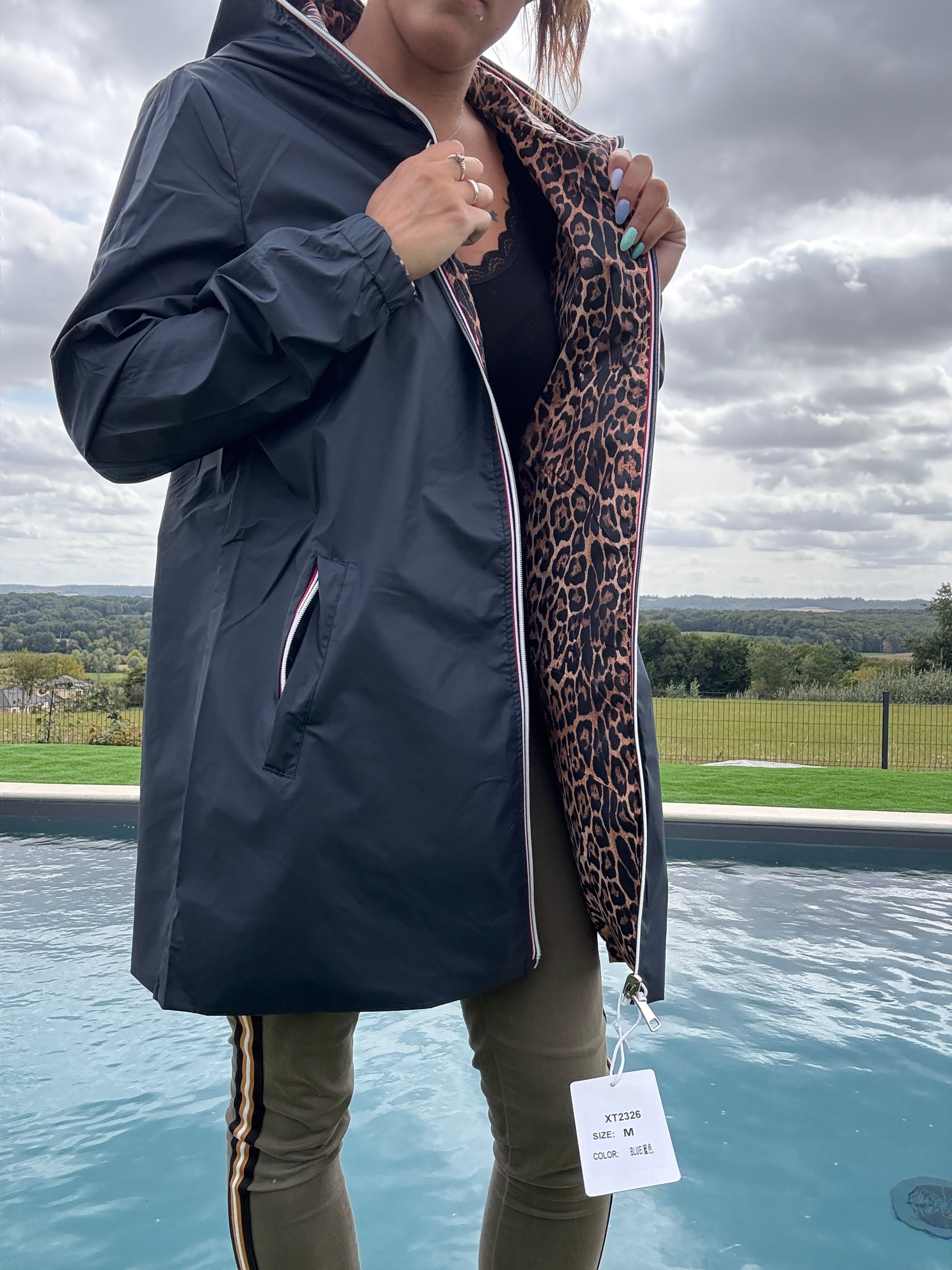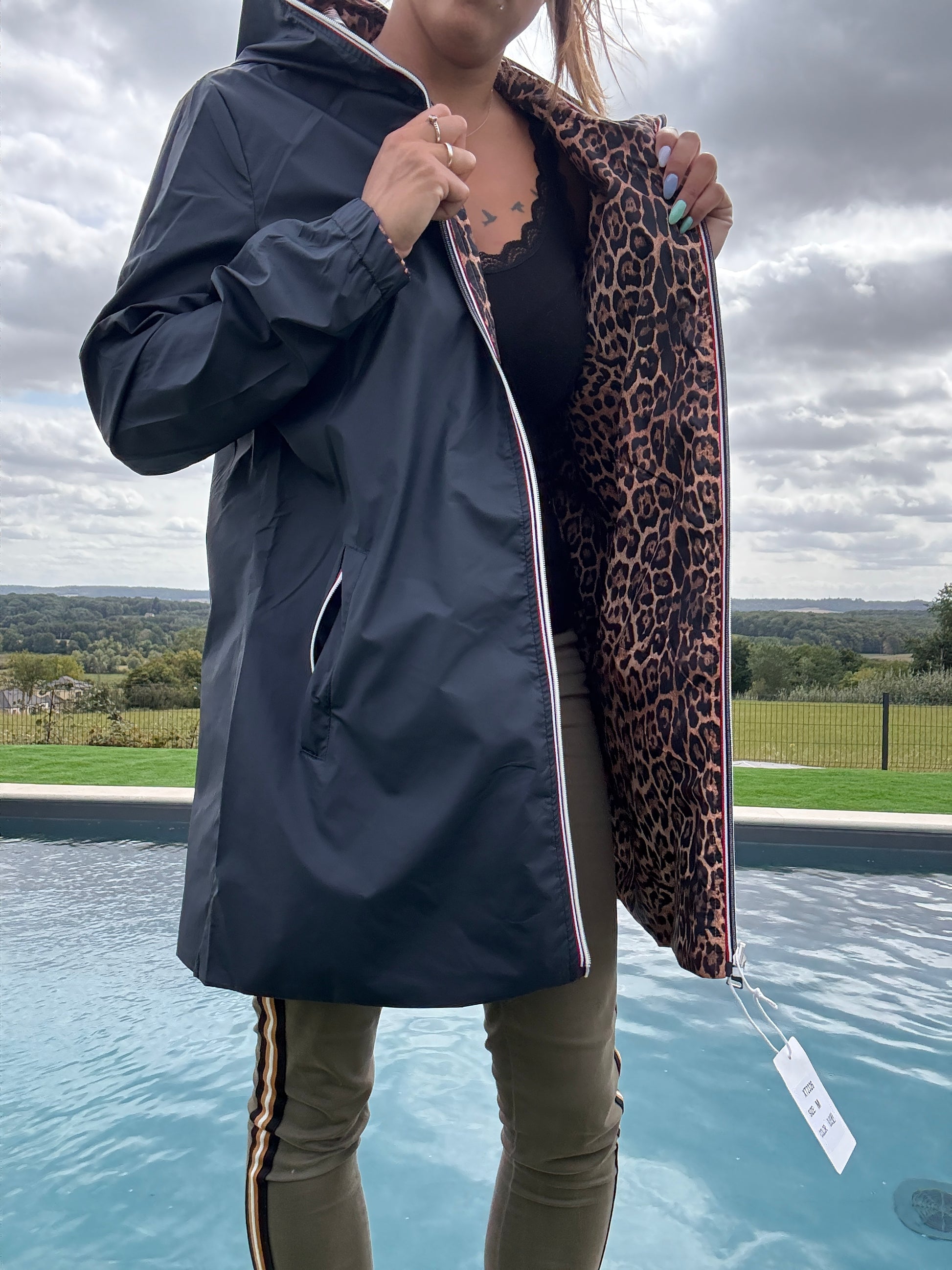 Cet imperméable réversible offre deux styles distincts : un côté bleu marine uni et un côté avec imprimé léopard.
