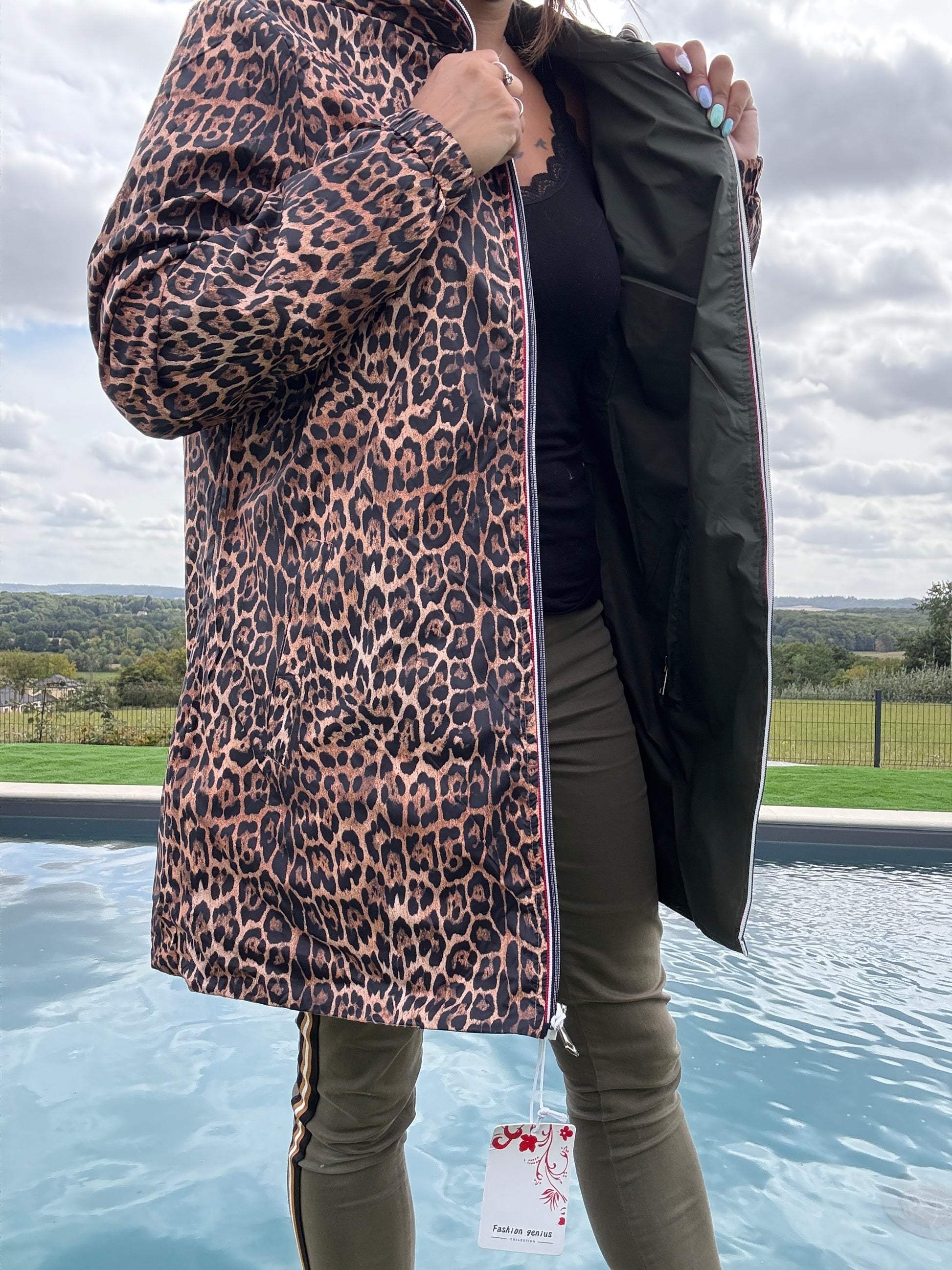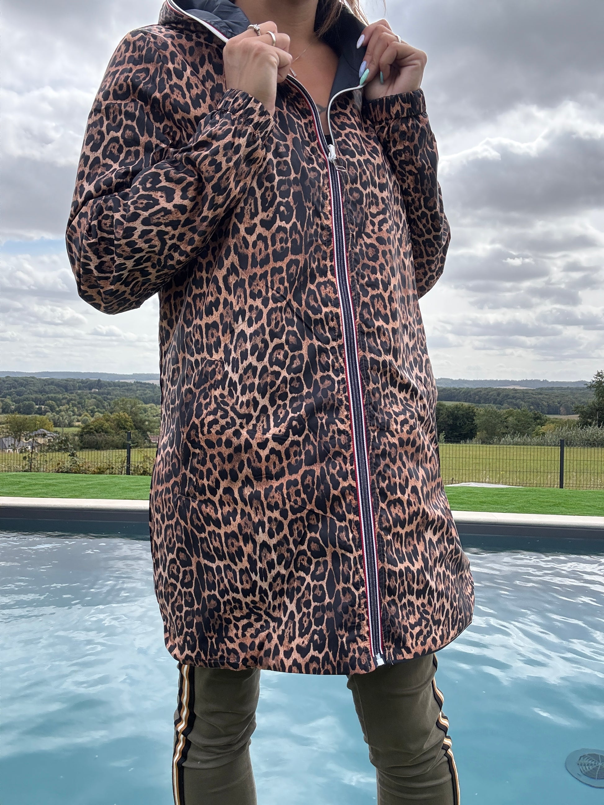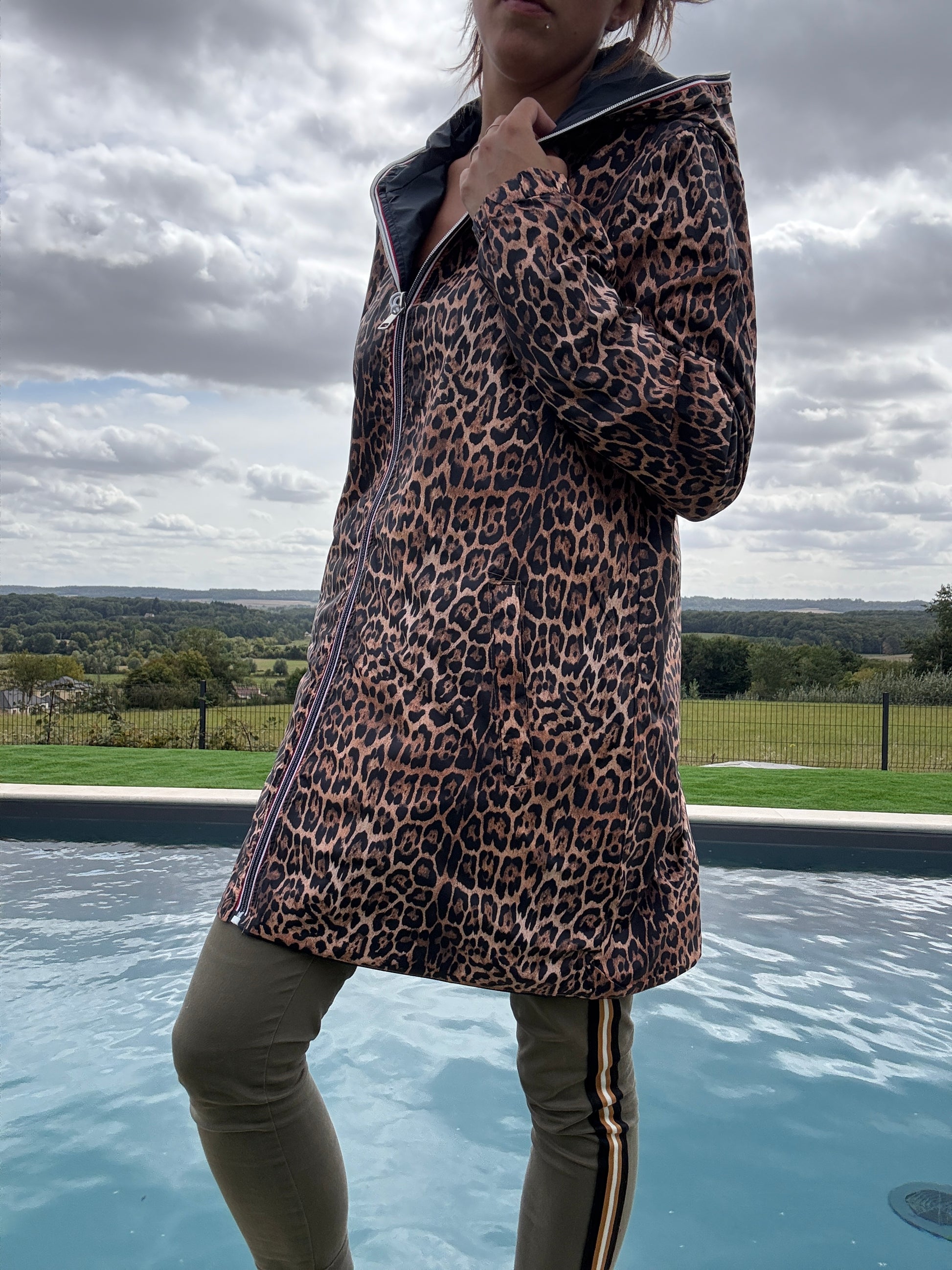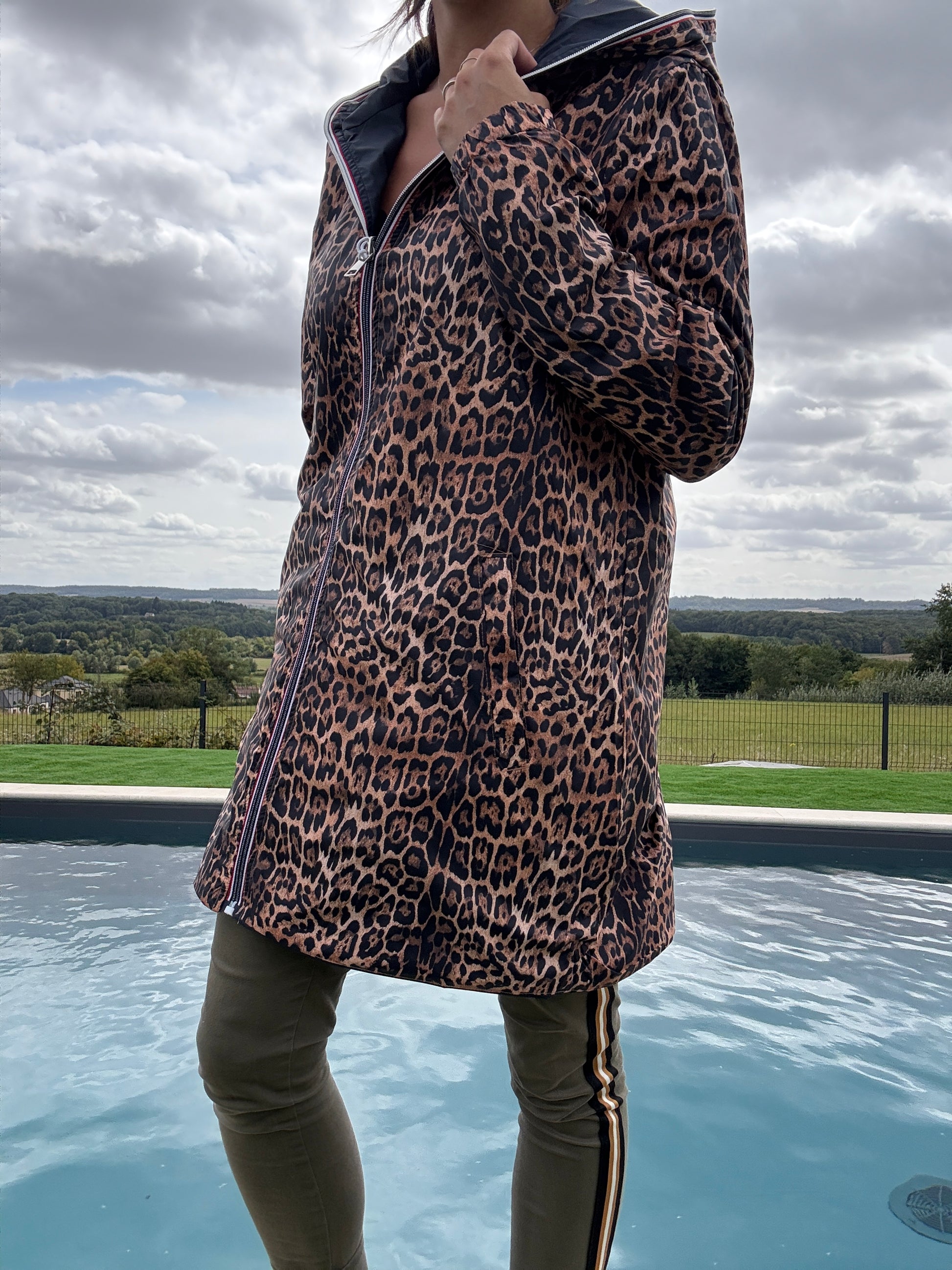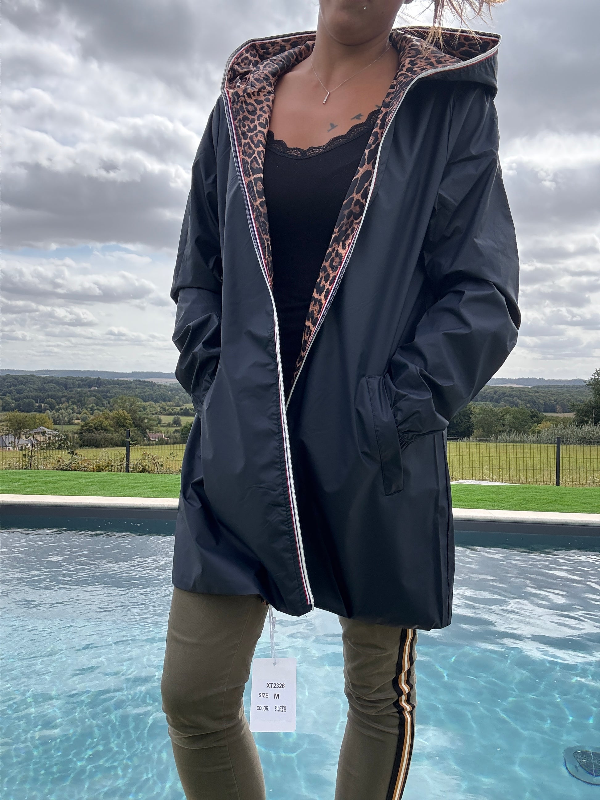 Cet imperméable réversible offre deux styles distincts : un côté bleu marine uni et un côté avec imprimé léopard.