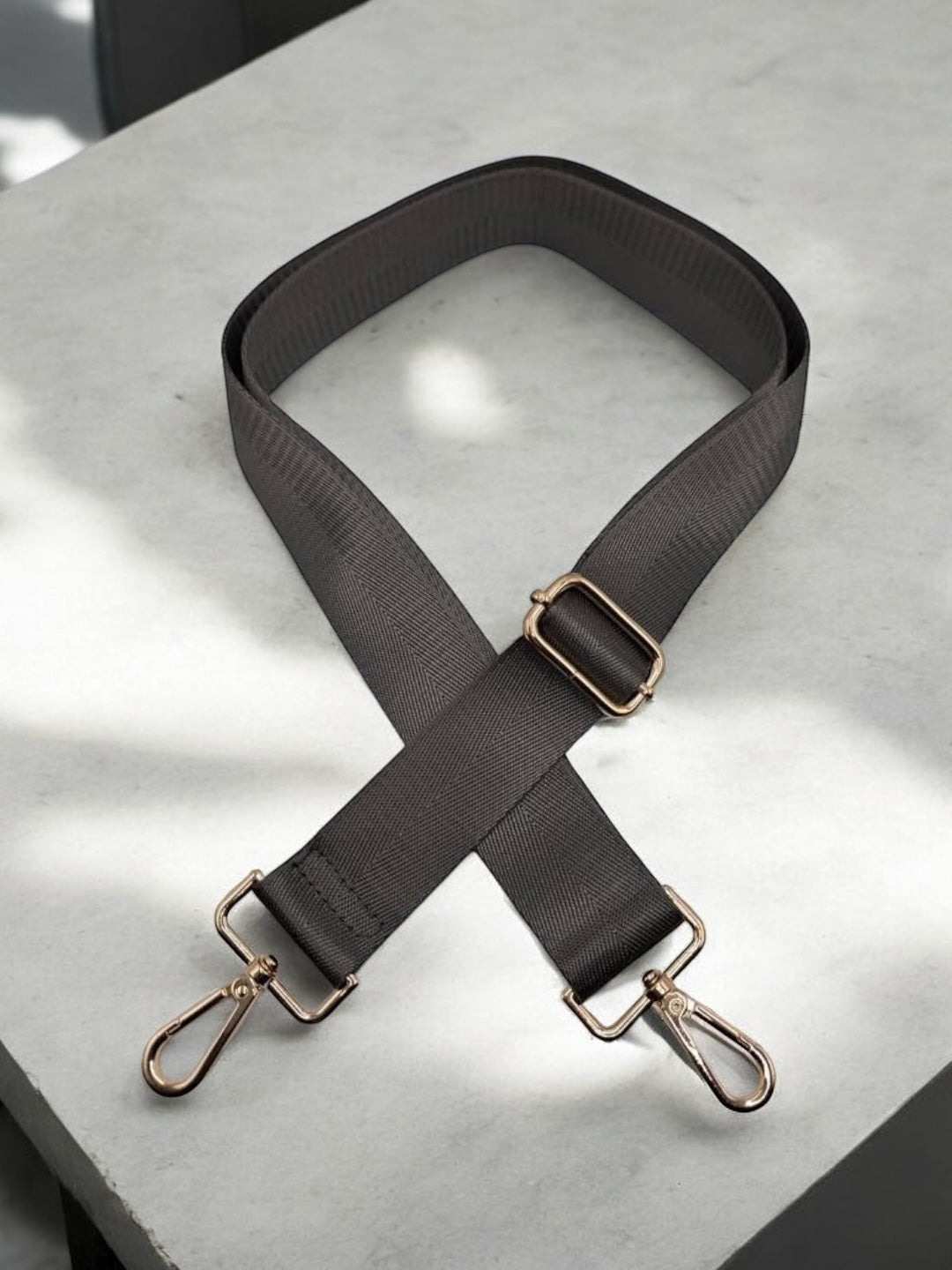 Sangle en tissu robuste de couleur gris. La texture du tissu est lisse, reflétant une certaine élégance. Elle est équipée de deux crochets métalliques solidement fixés de couleur dorée, ajoutant une touche de luxe à l'ensemble.
