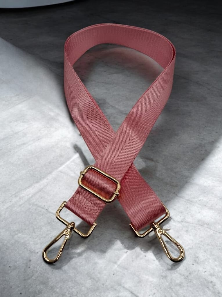 Sangle en tissu robuste de couleur rose. La texture du tissu est lisse, reflétant une certaine élégance. Elle est équipée de deux crochets métalliques solidement fixés de couleur dorée, ajoutant une touche de luxe à l'ensemble.