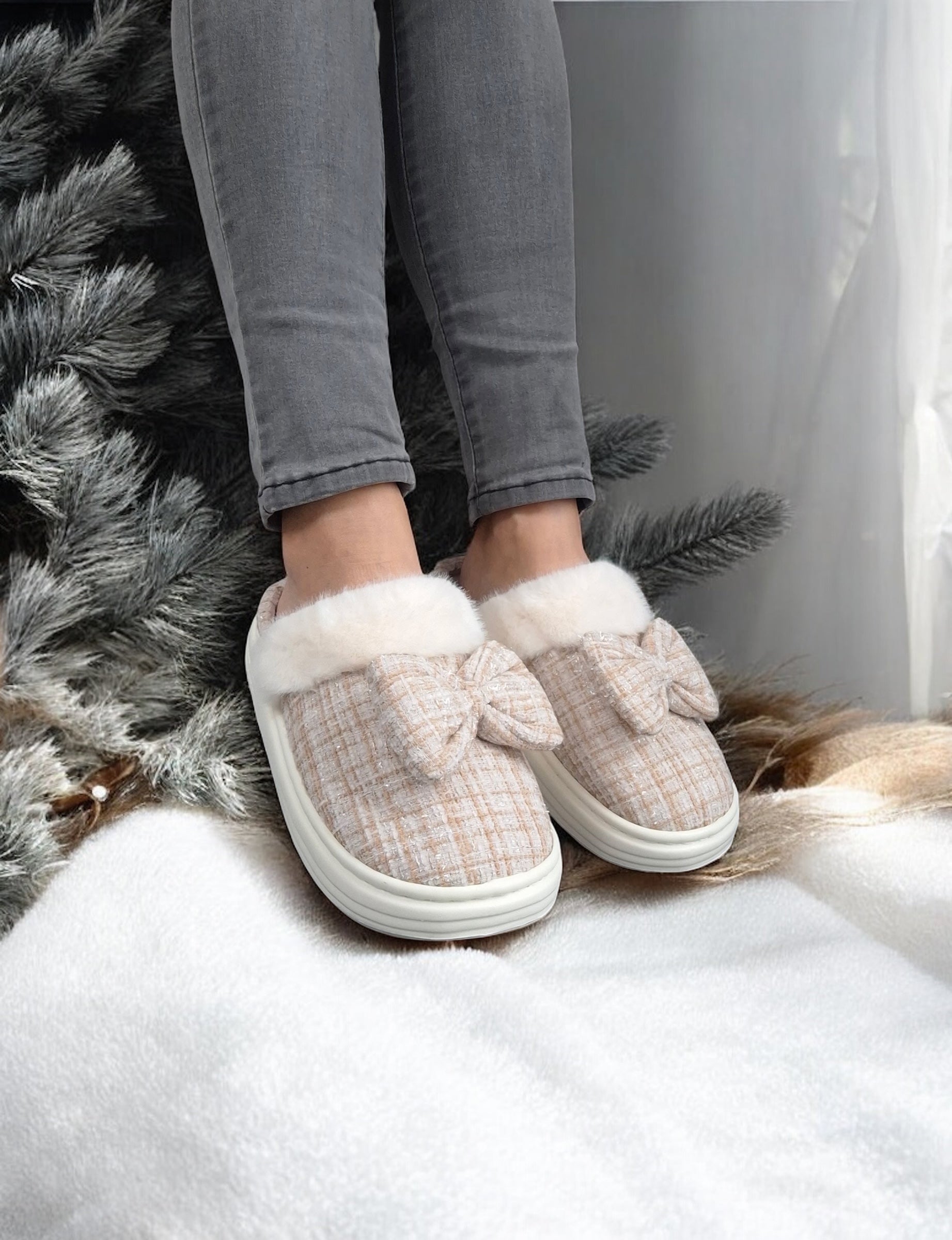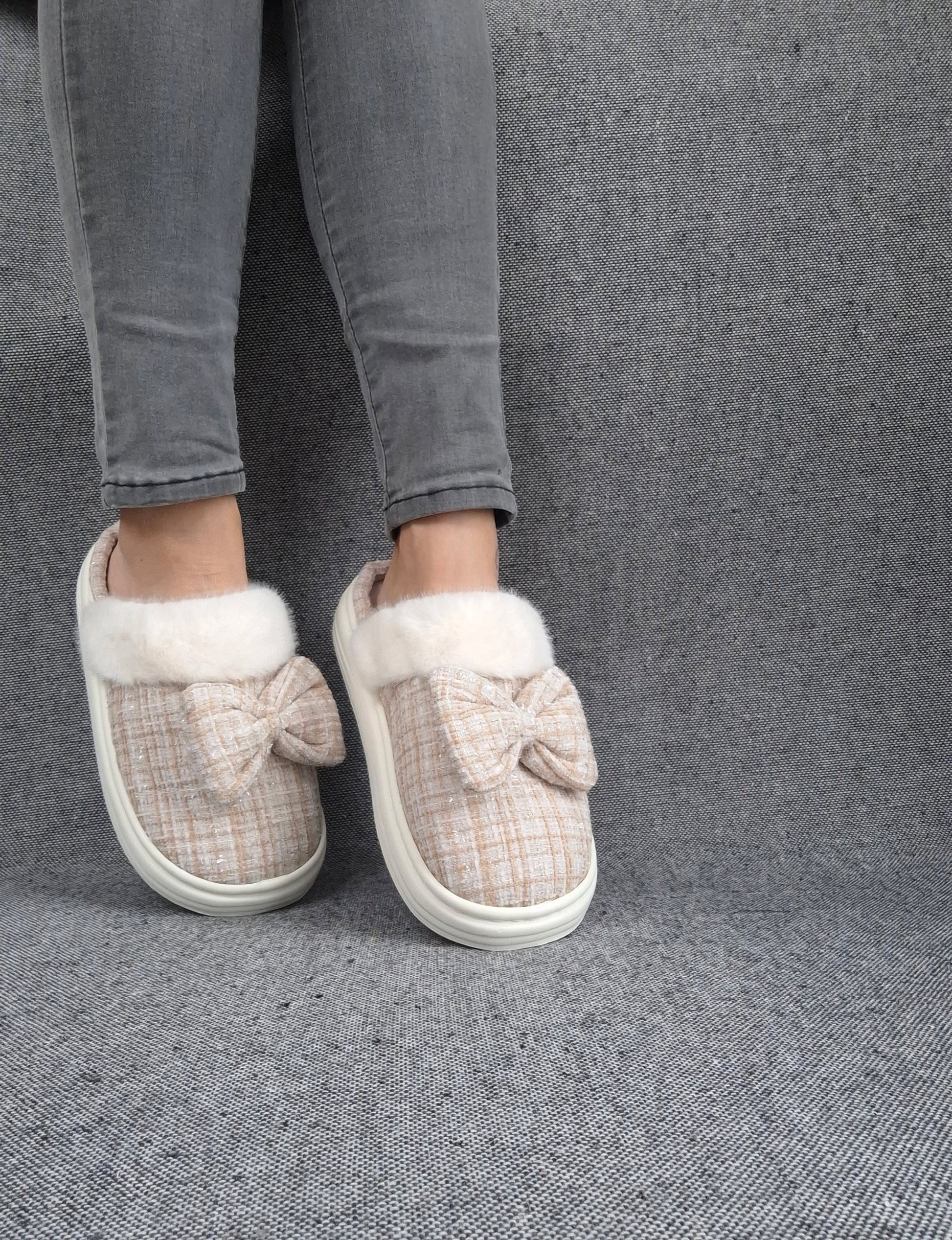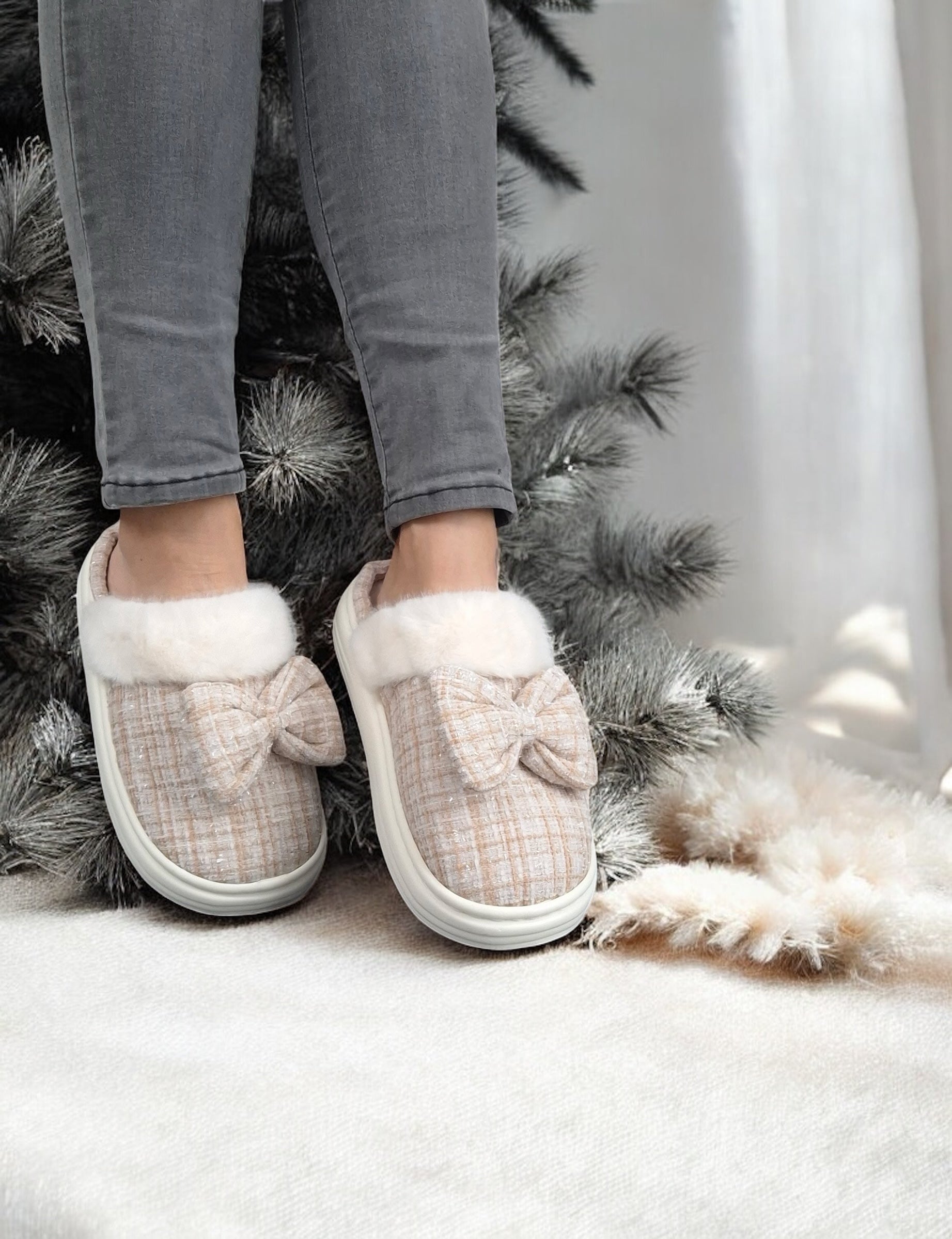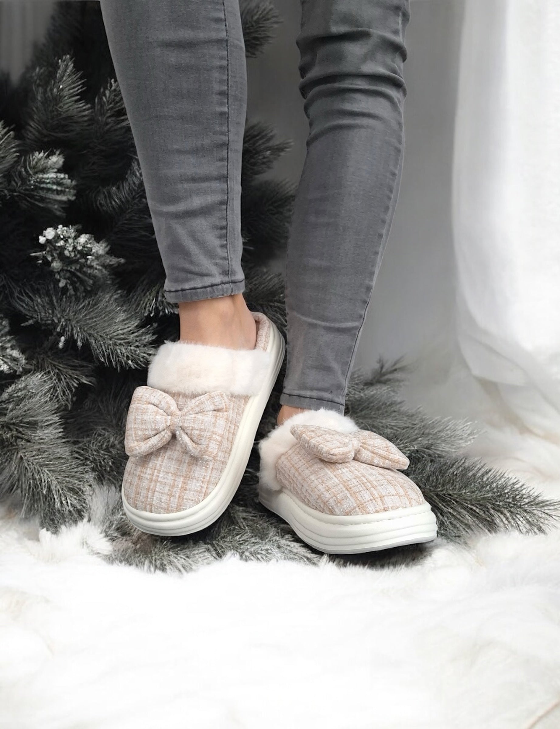 Chaussons fourrés beige et blanc en tissu à carreaux avec noeud