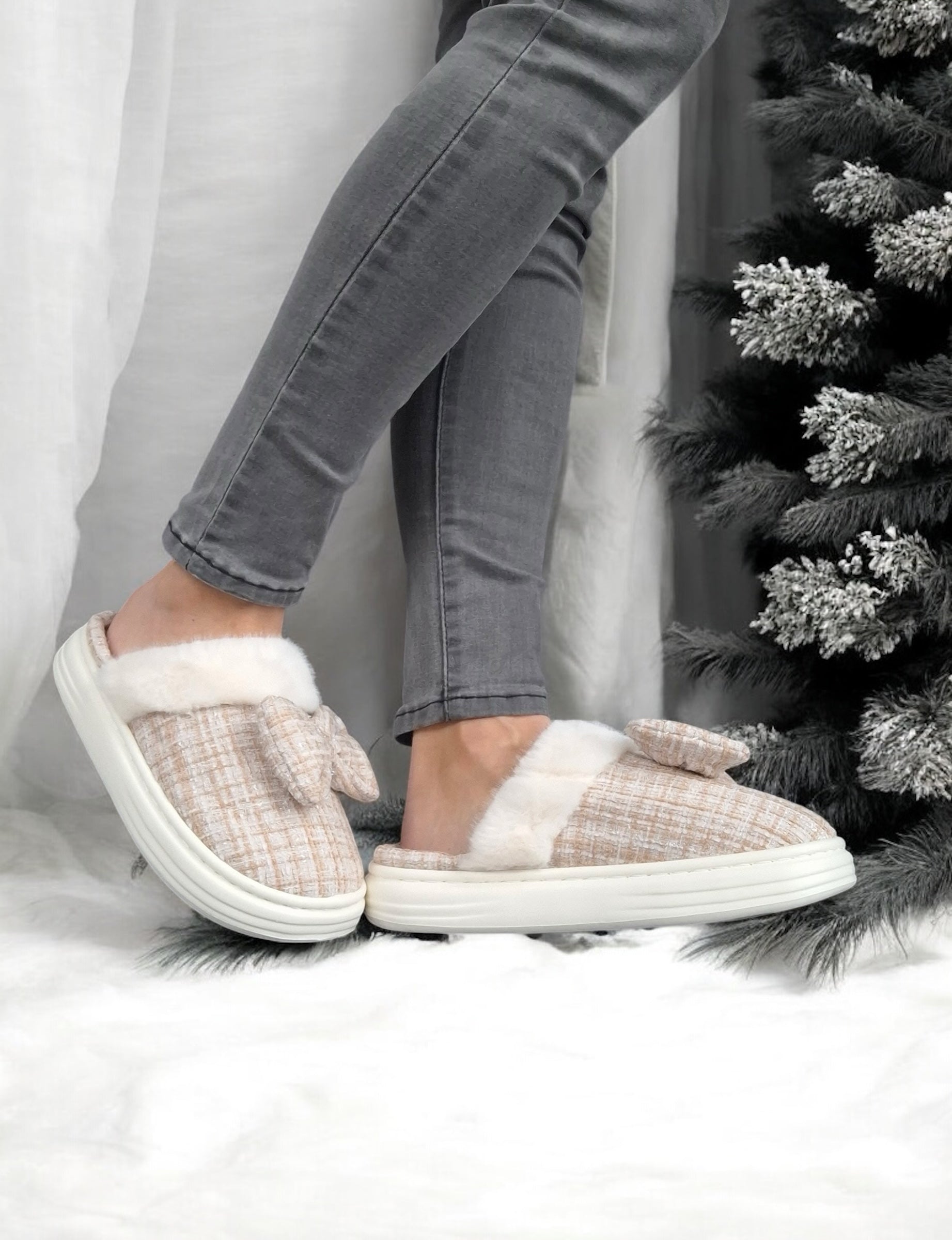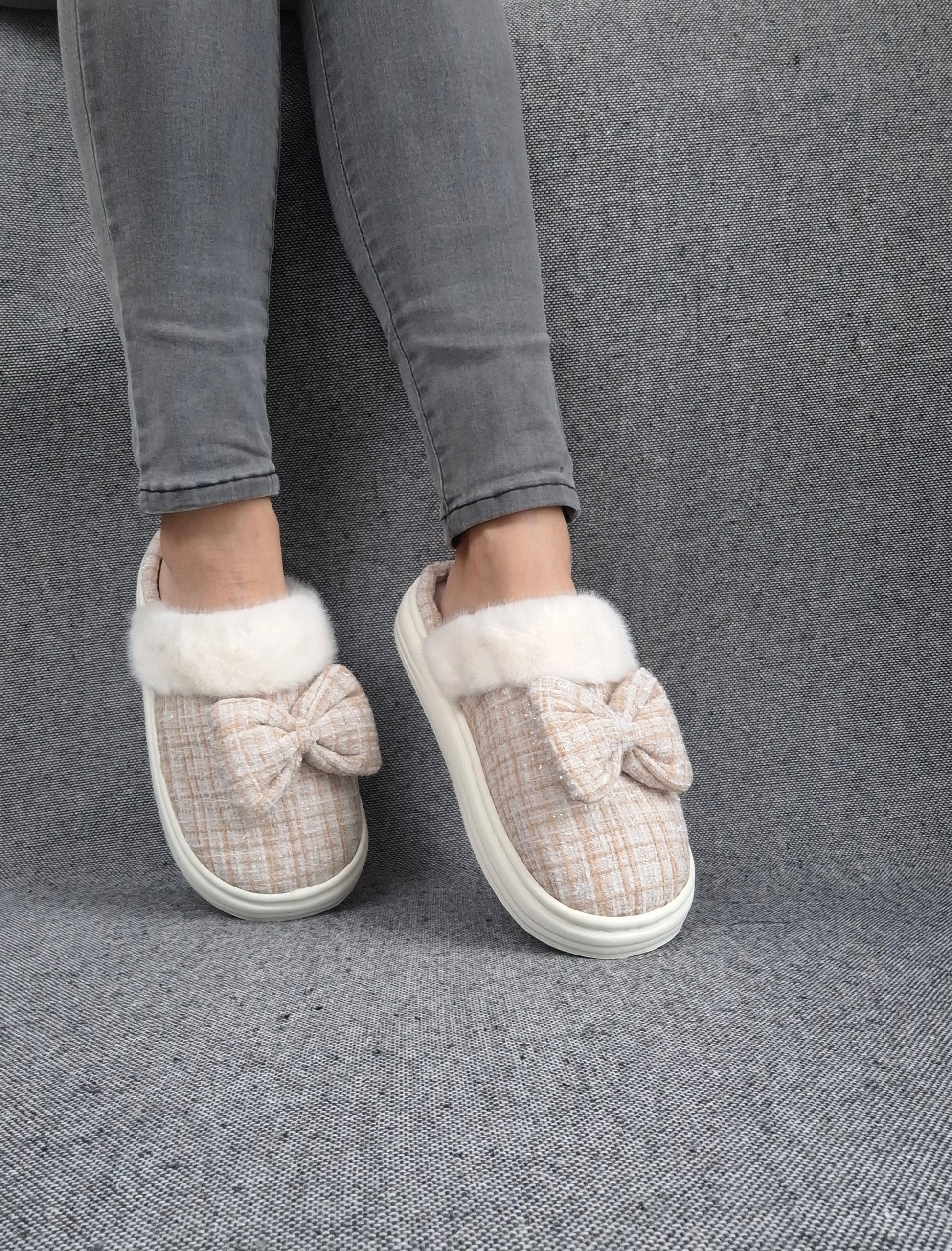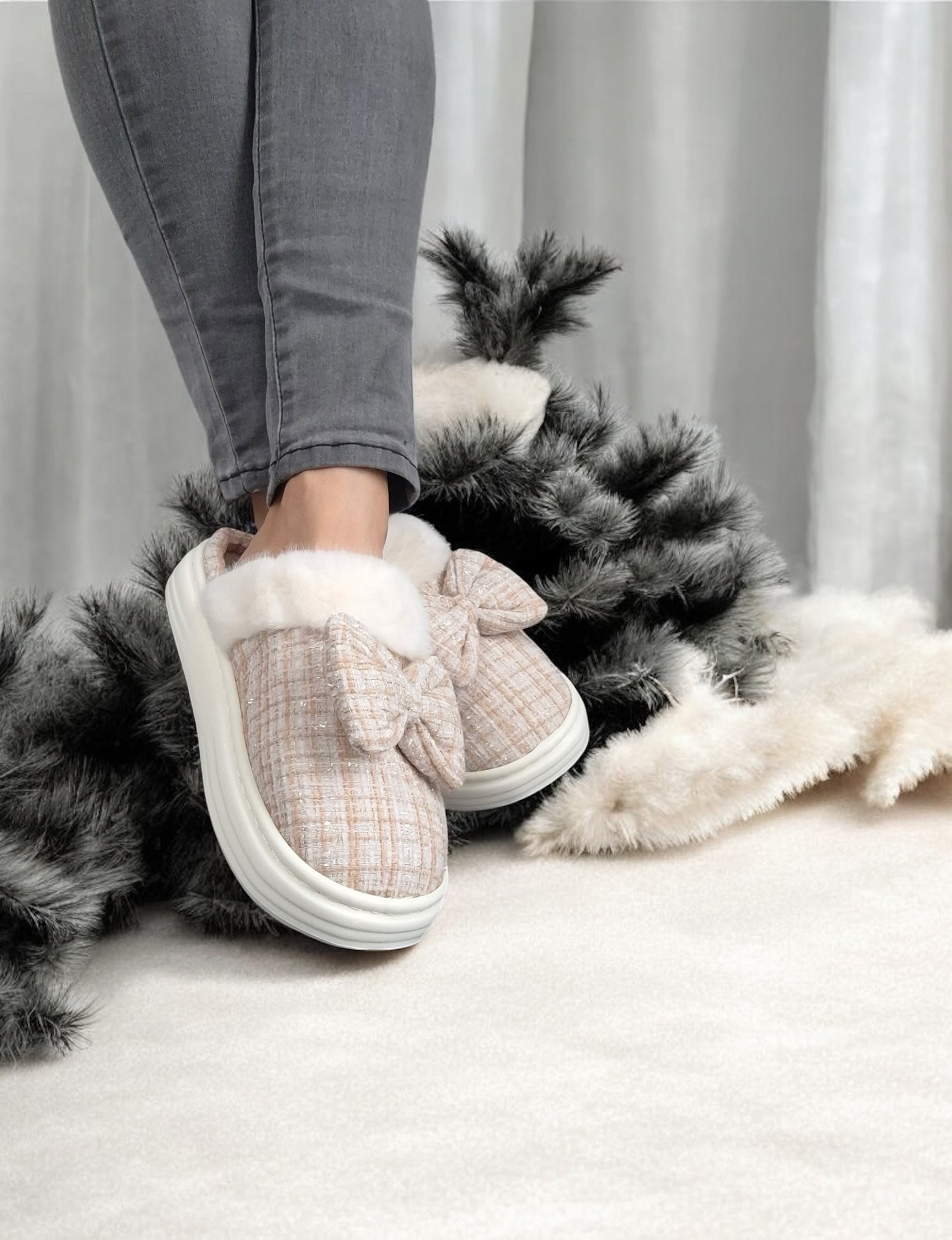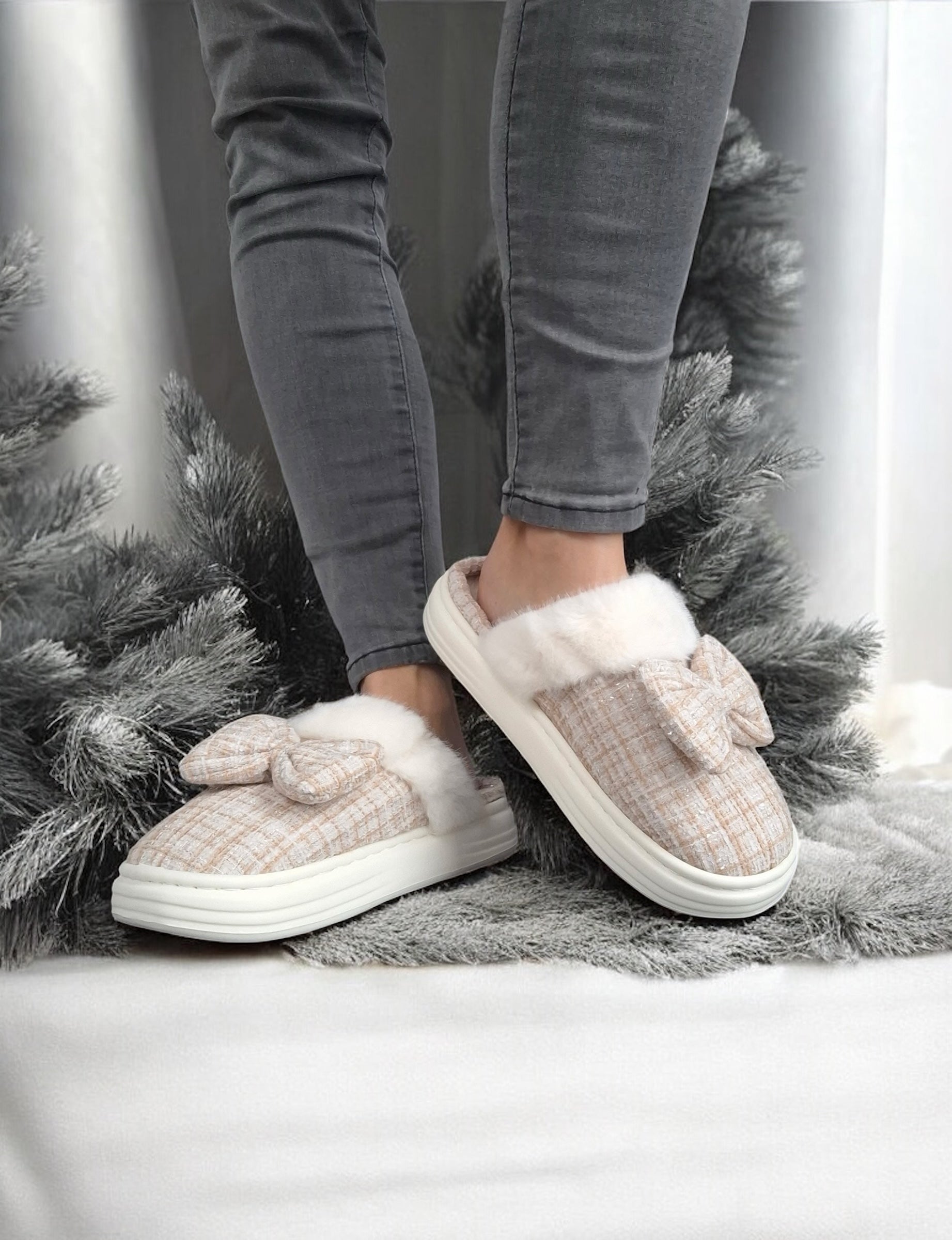 Chaussons fourrés beige et blanc en tissu à carreaux avec noeud