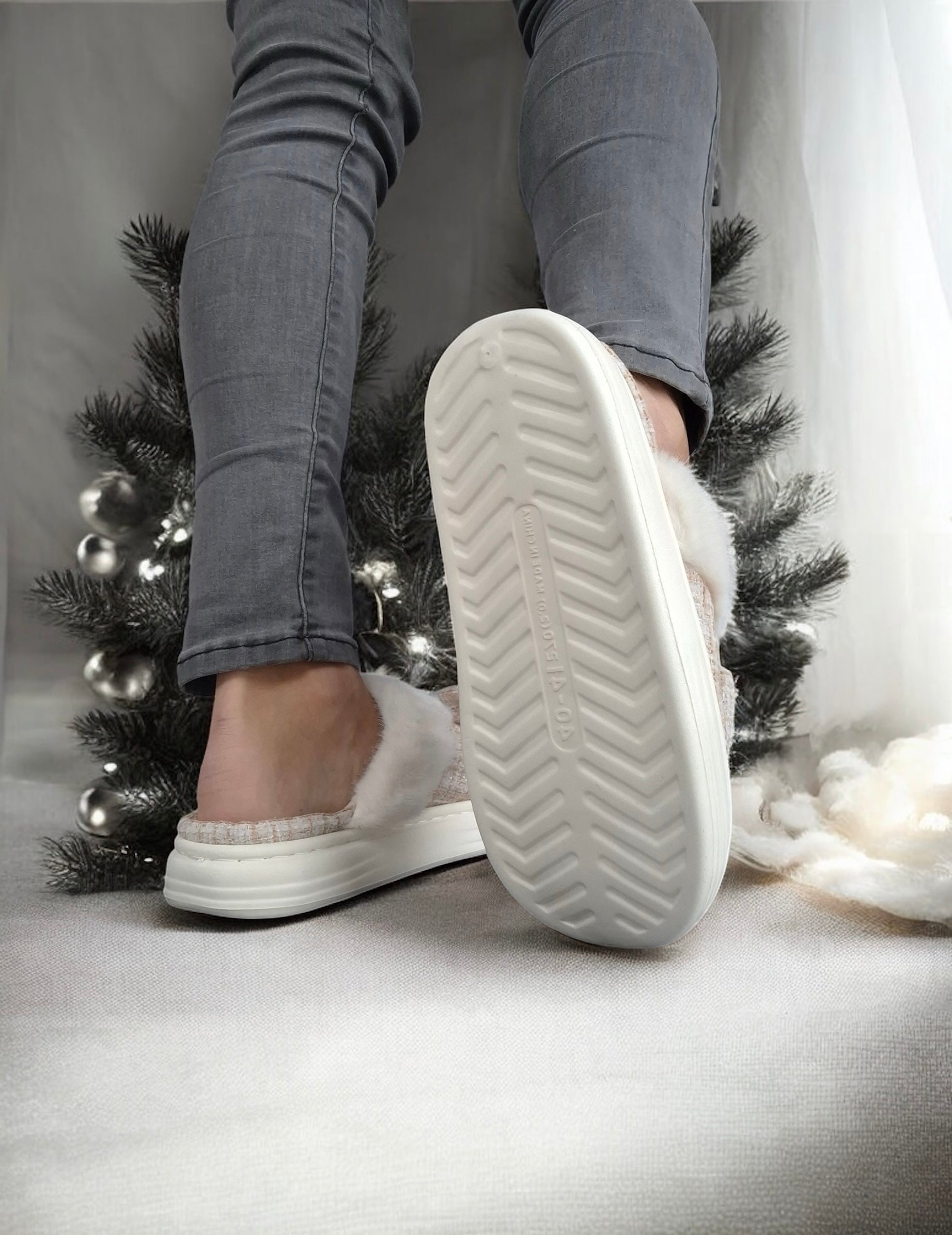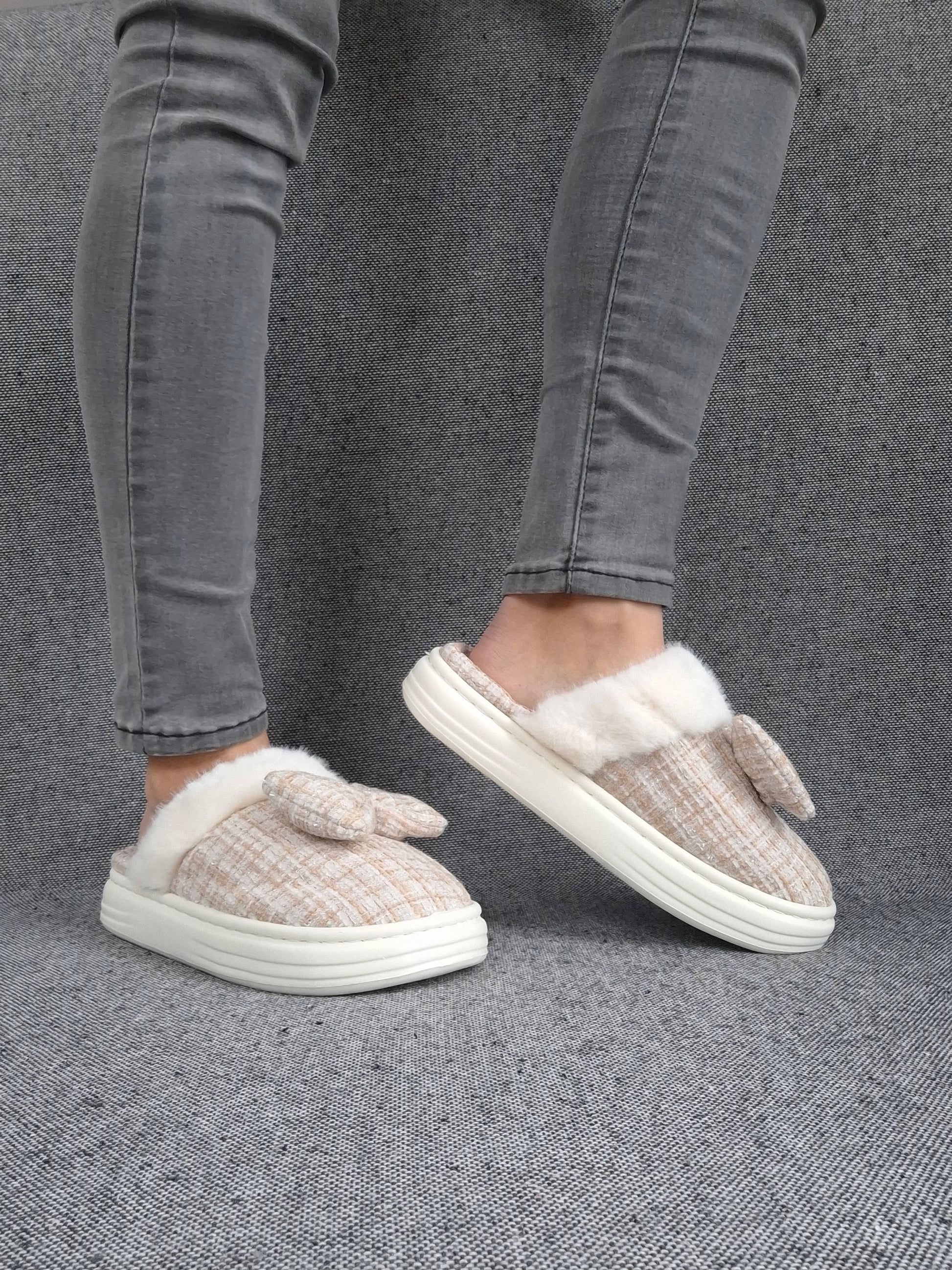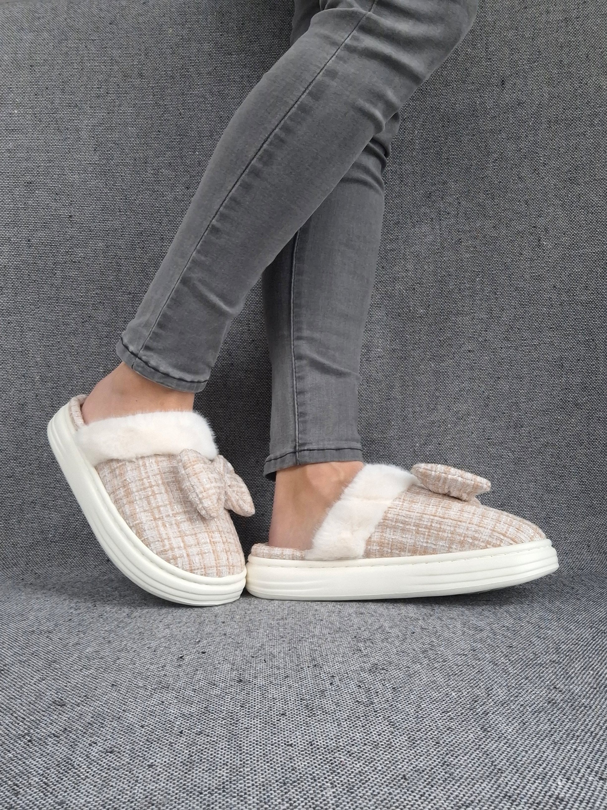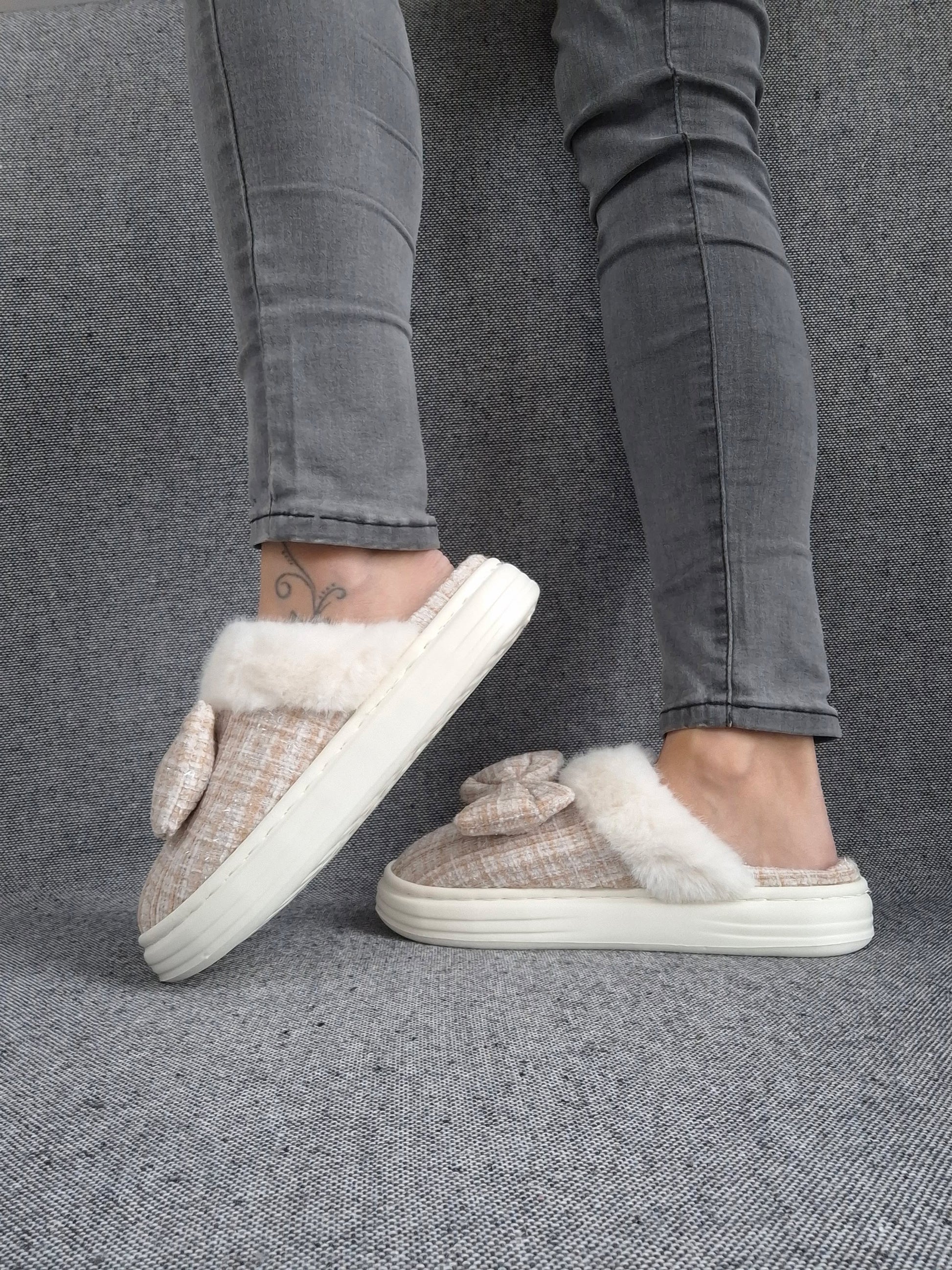 Chaussons fourrés beige et blanc en tissu à carreaux avec noeud