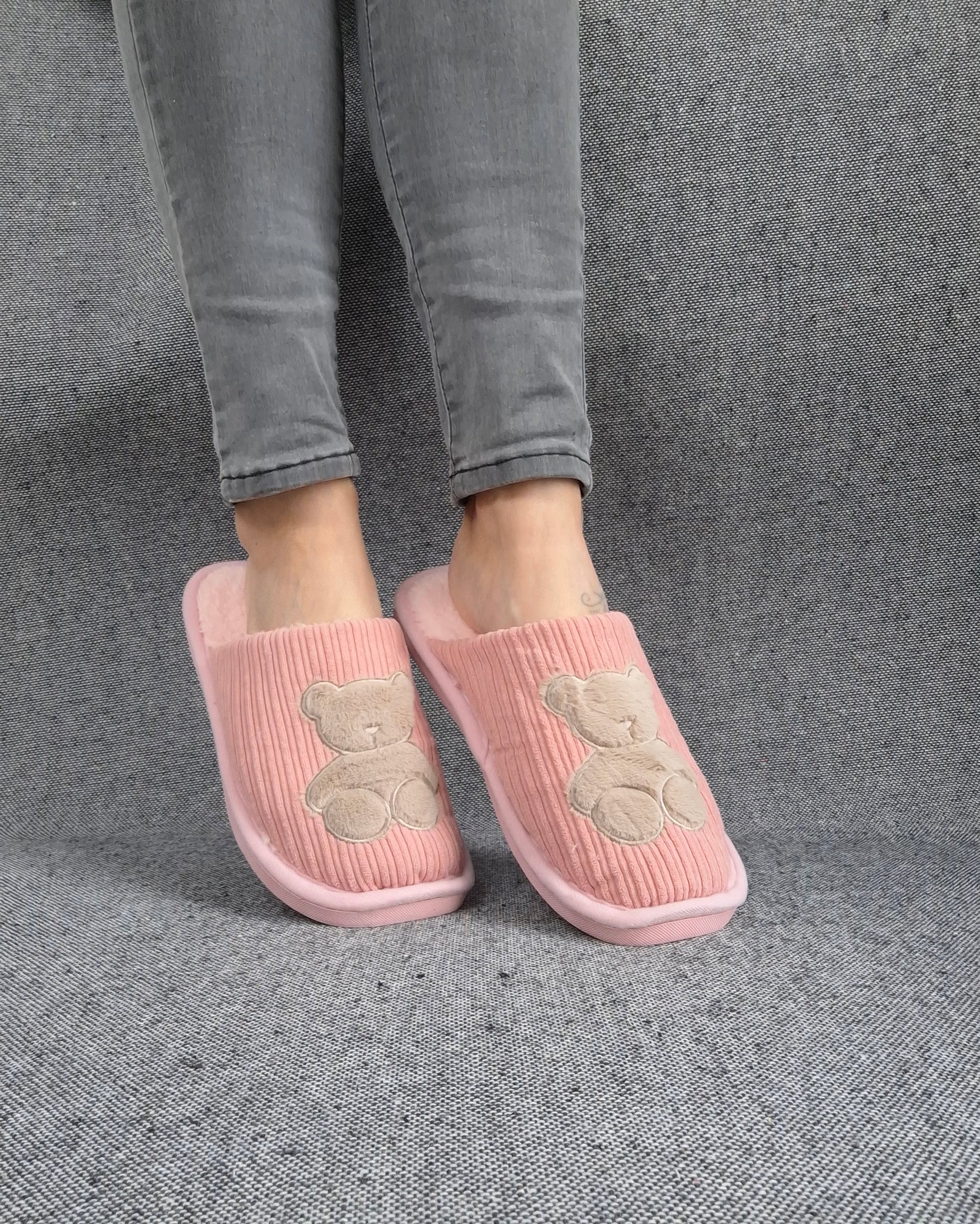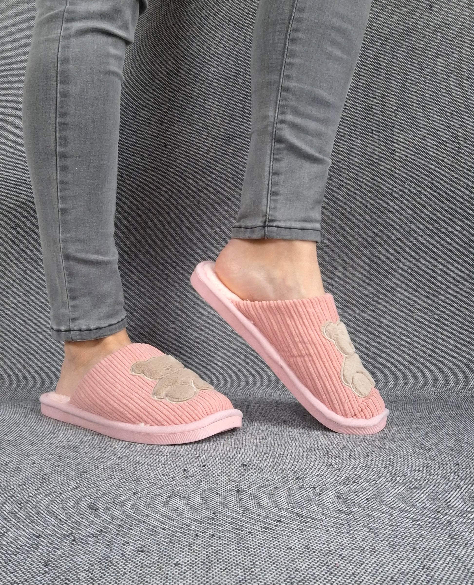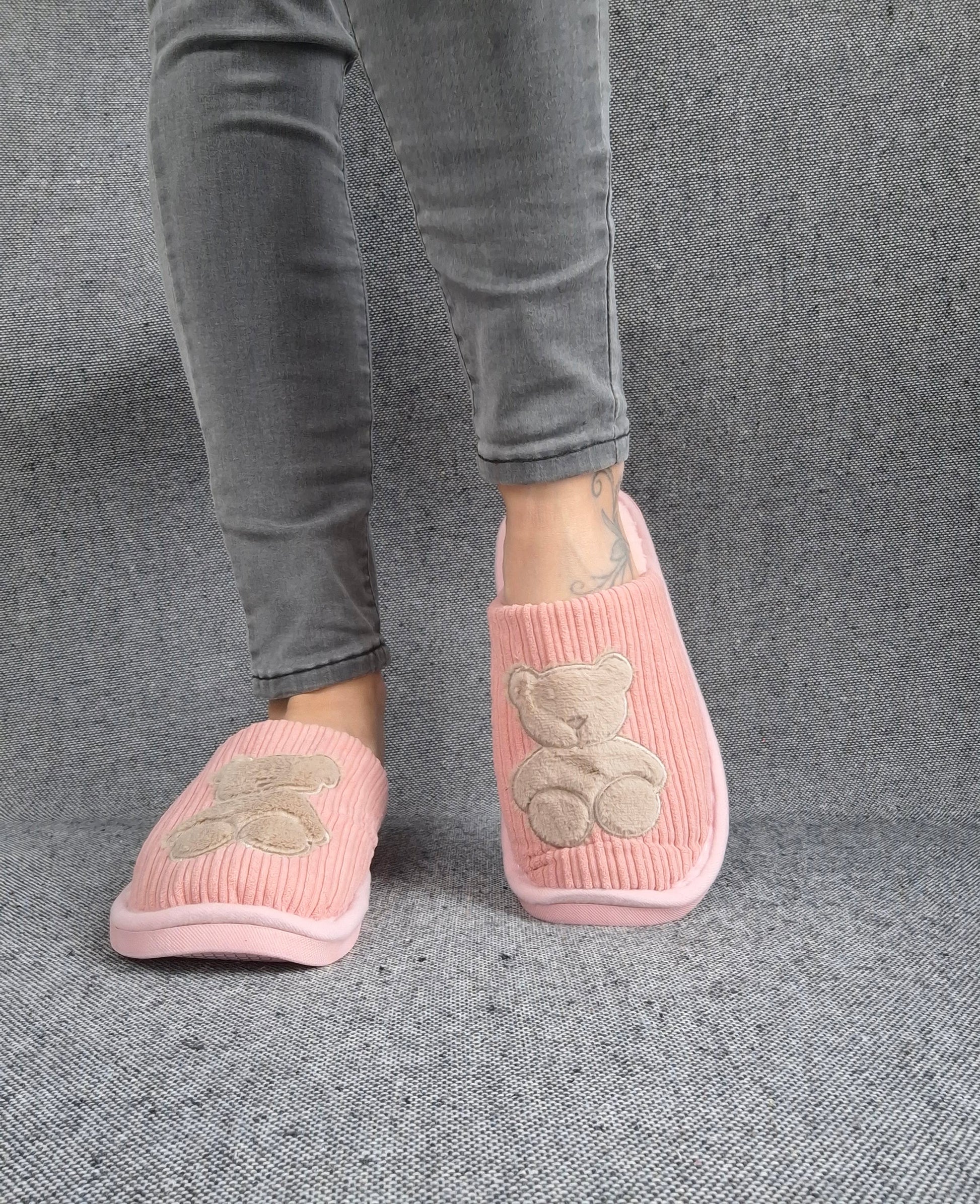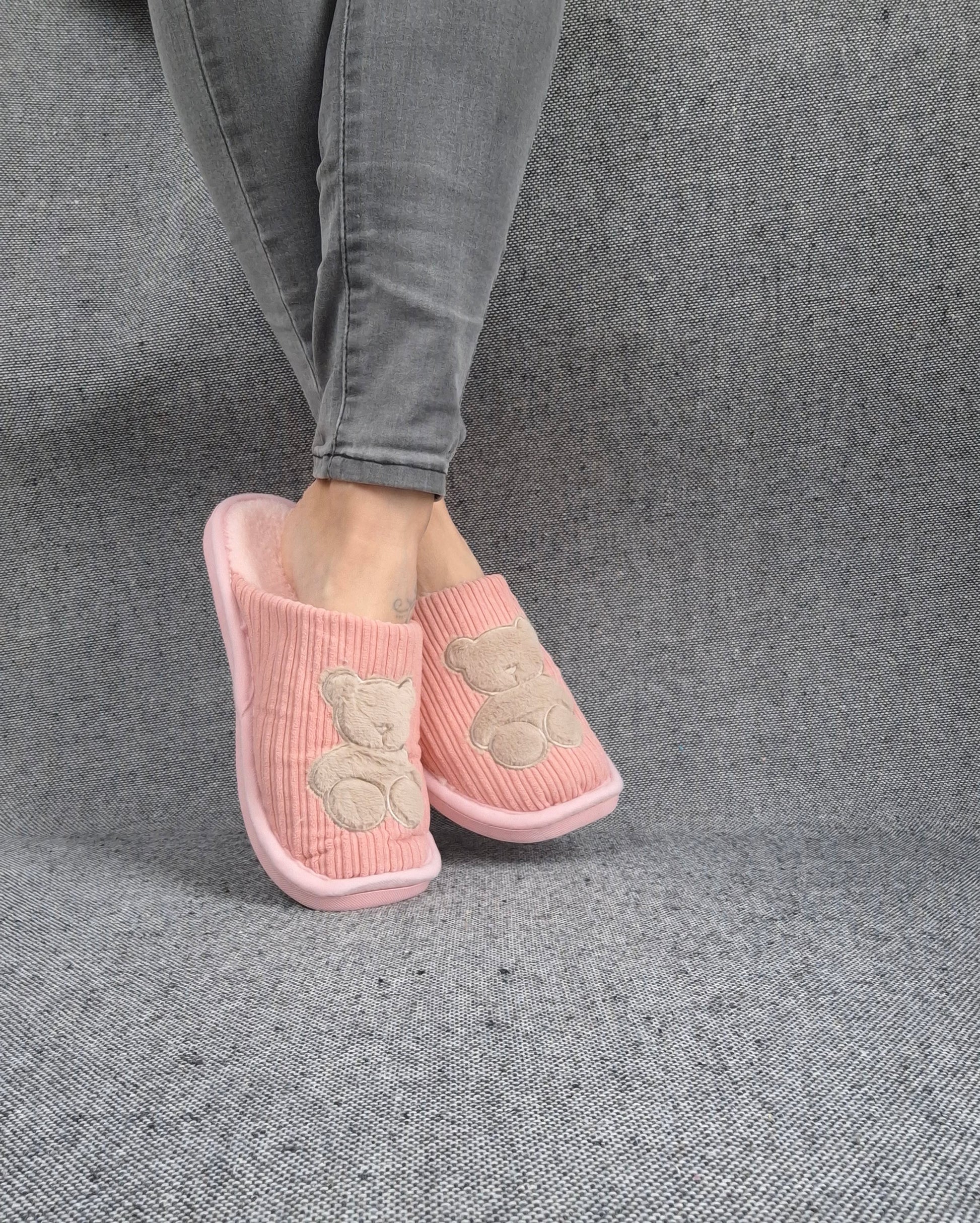 Chaussons fourrés rose en tissu avec motif ours