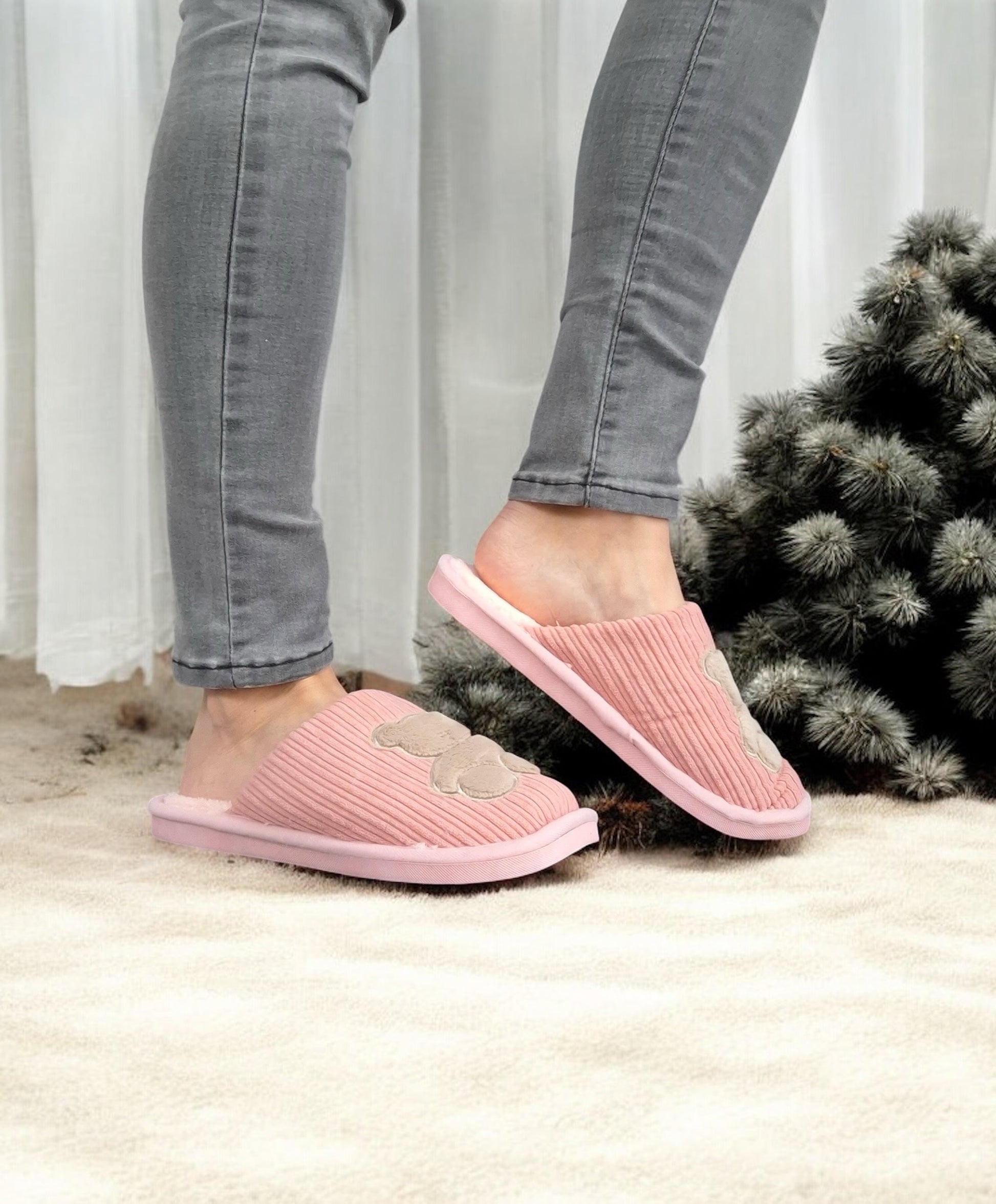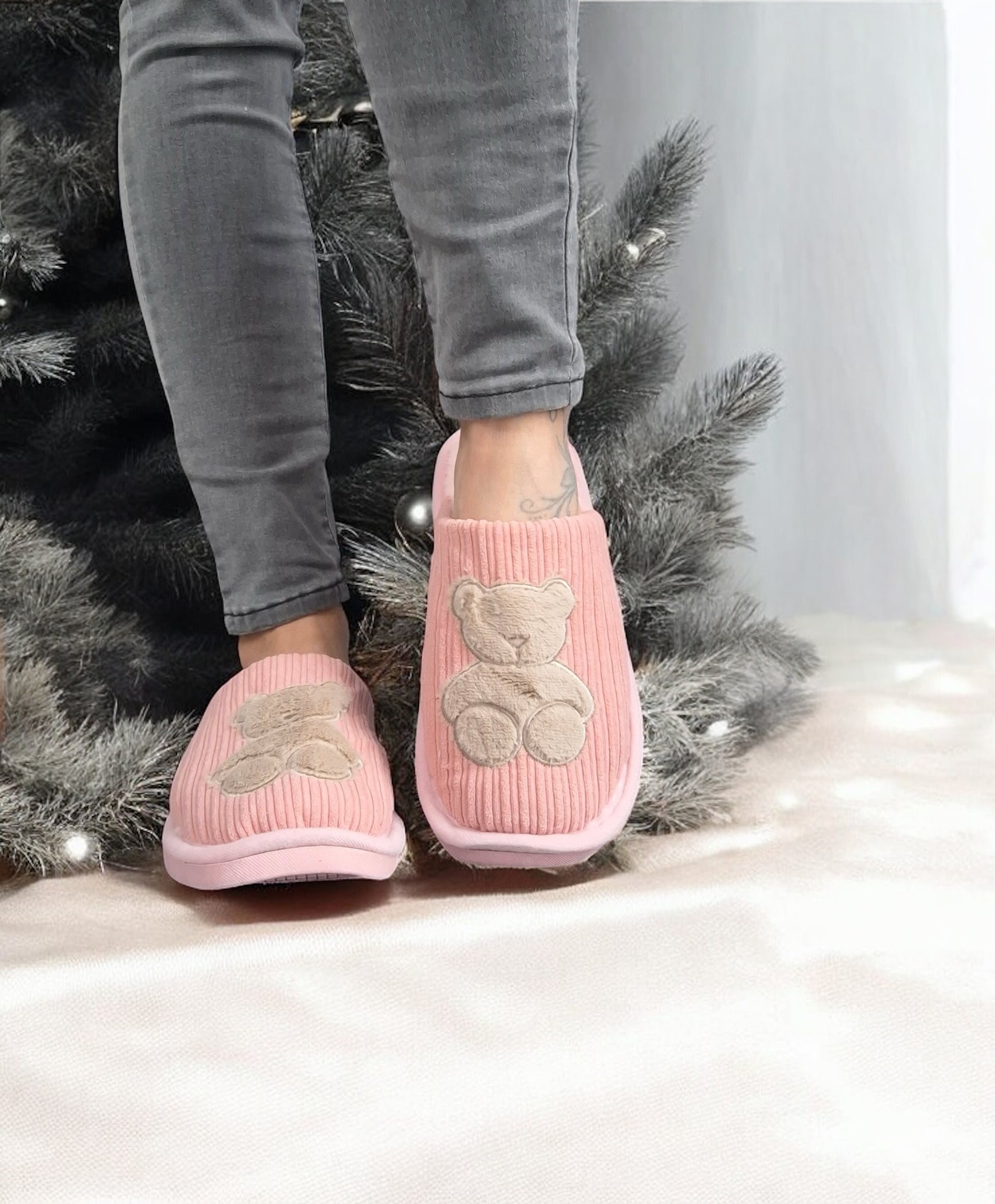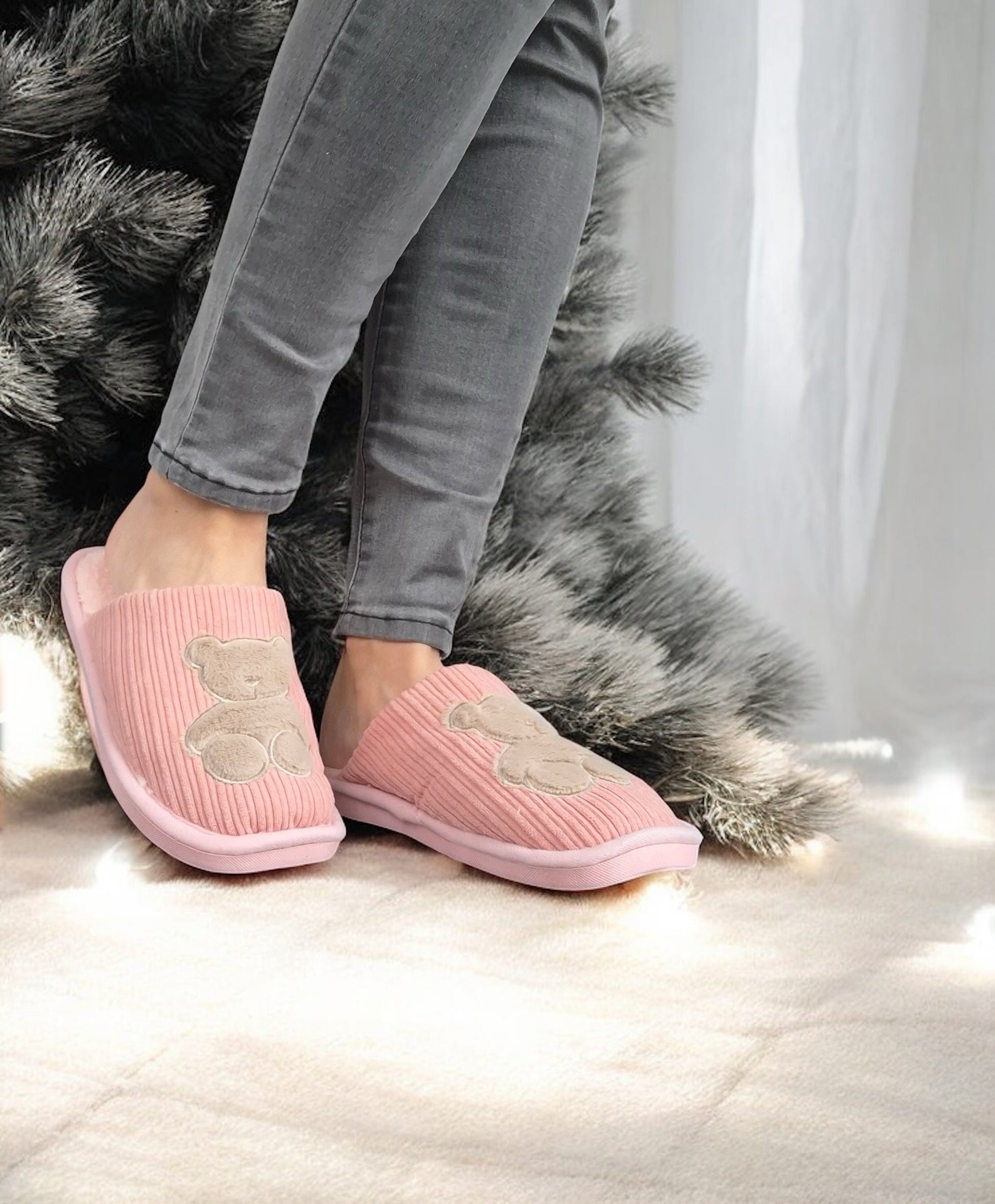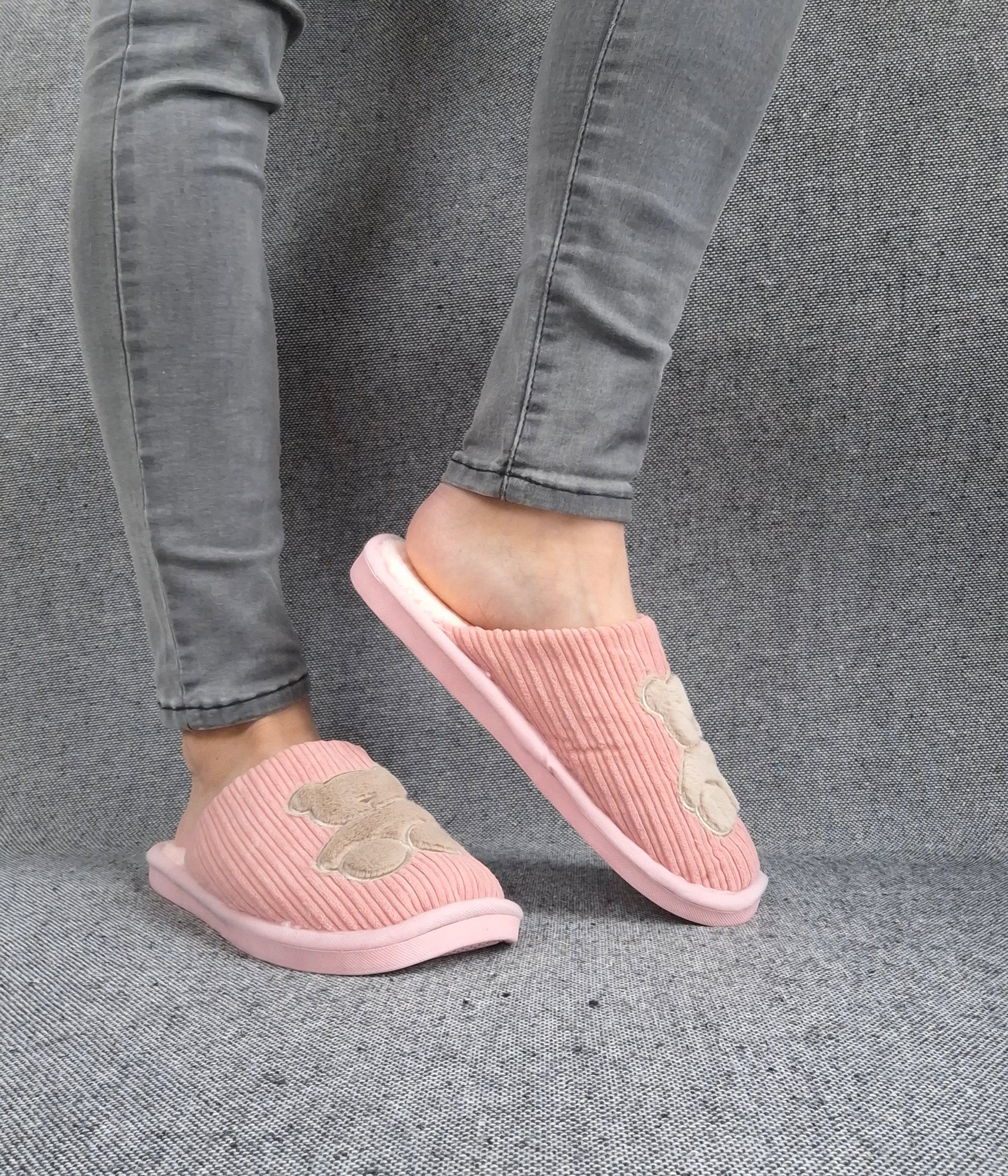 Chaussons fourrés rose en tissu avec motif ours