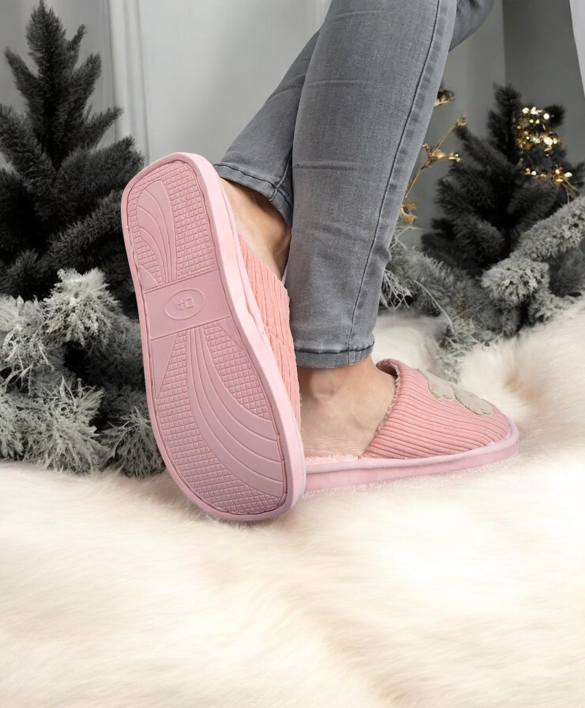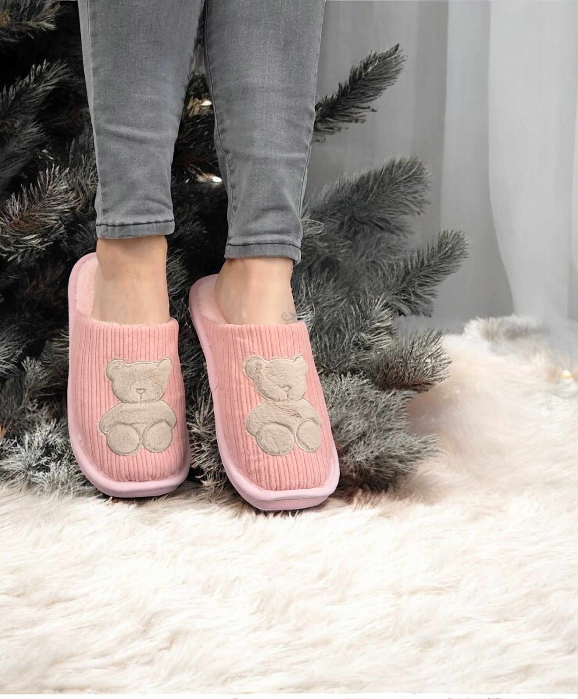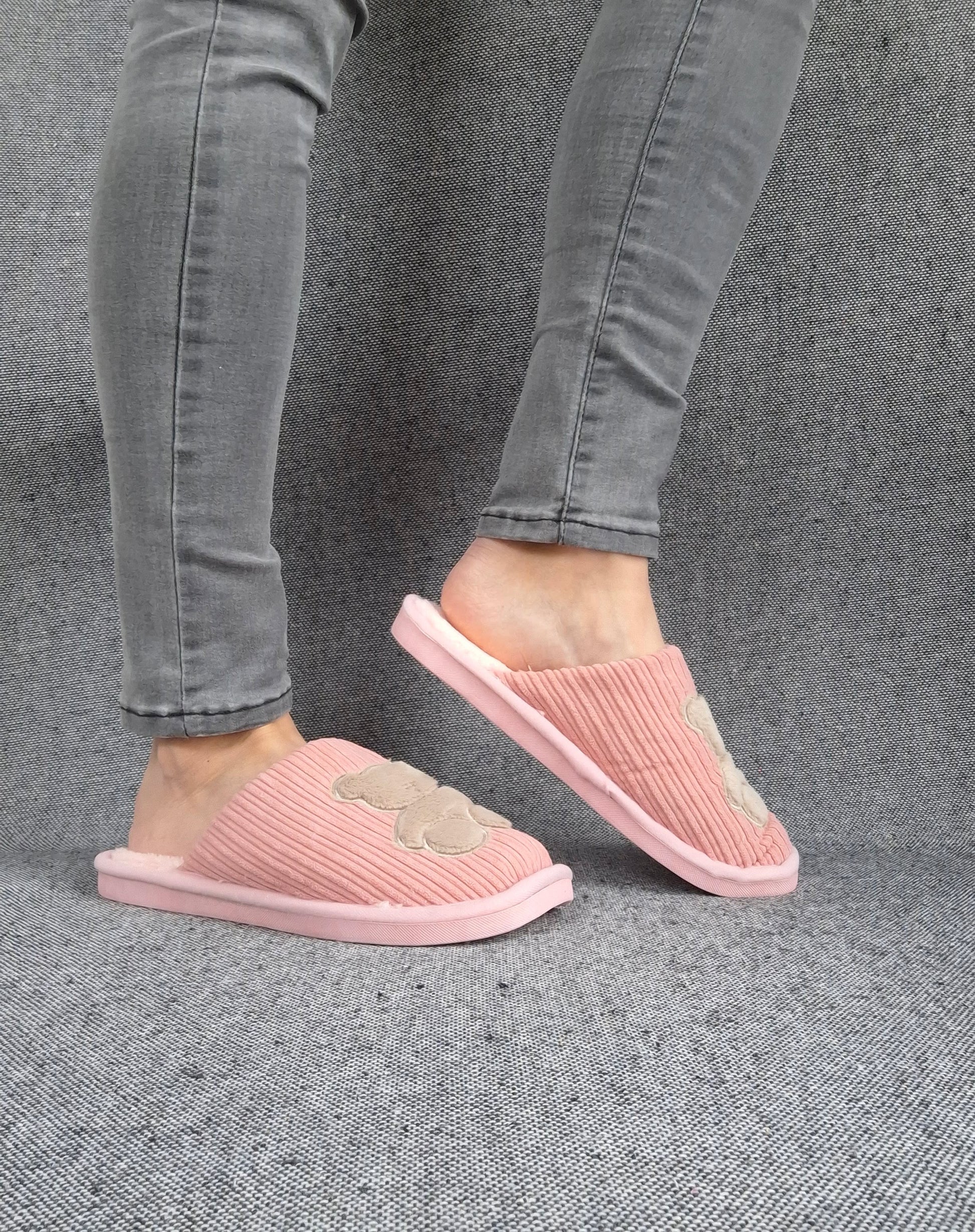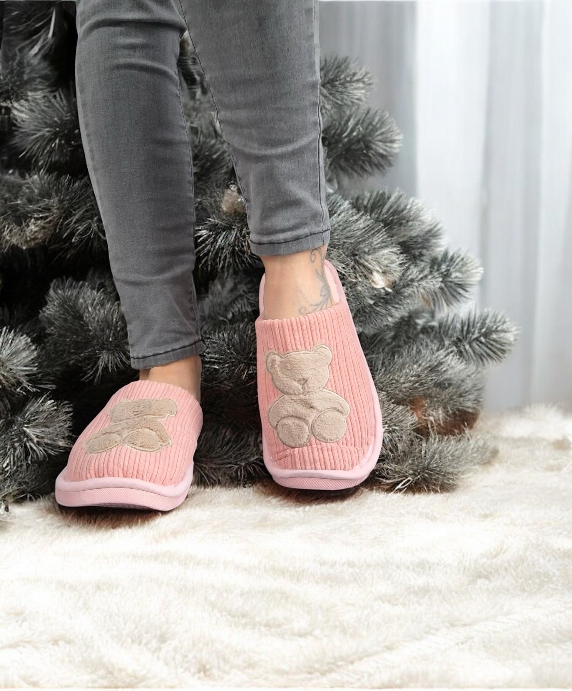 Chaussons fourrés rose en tissu avec motif ours