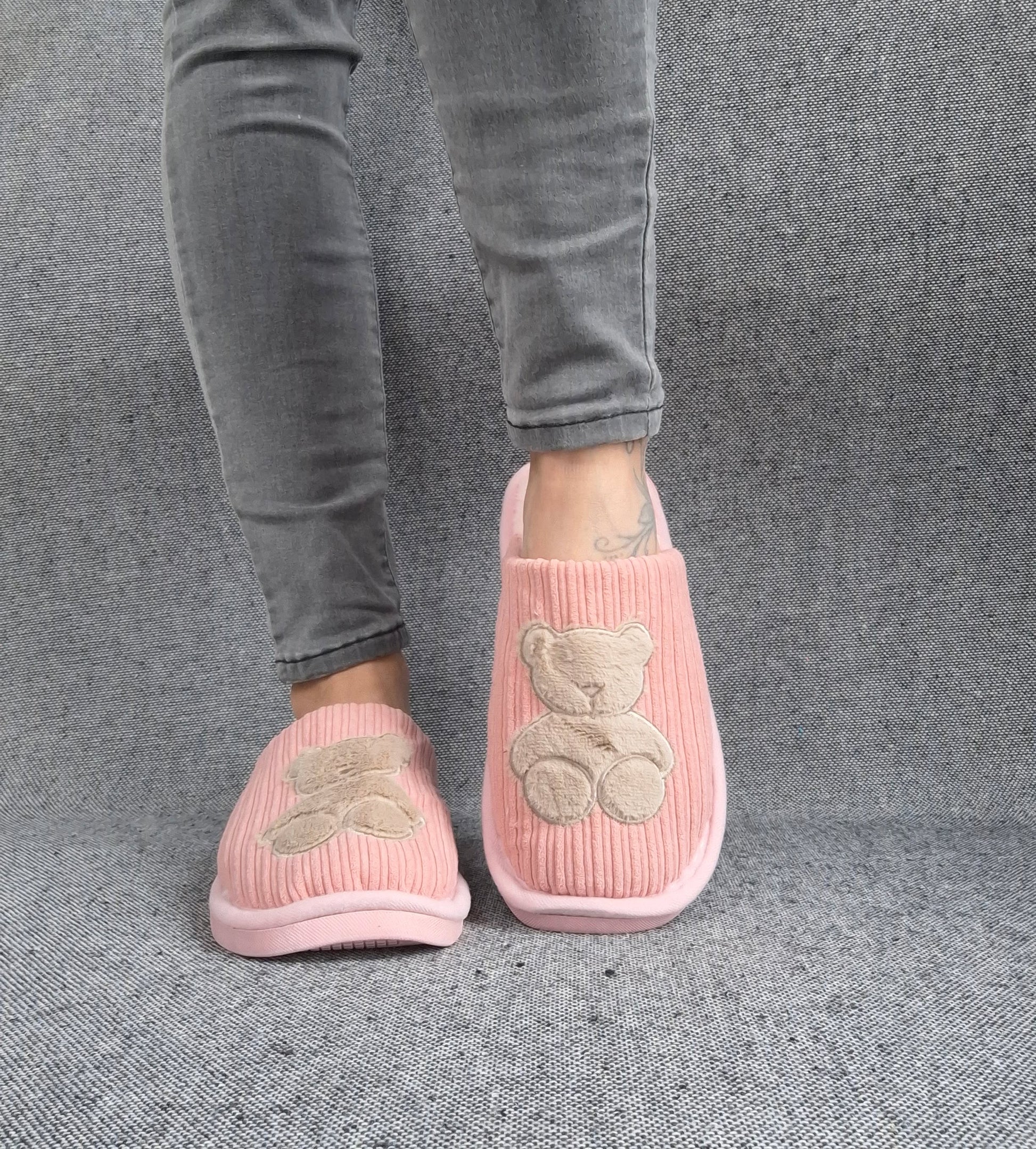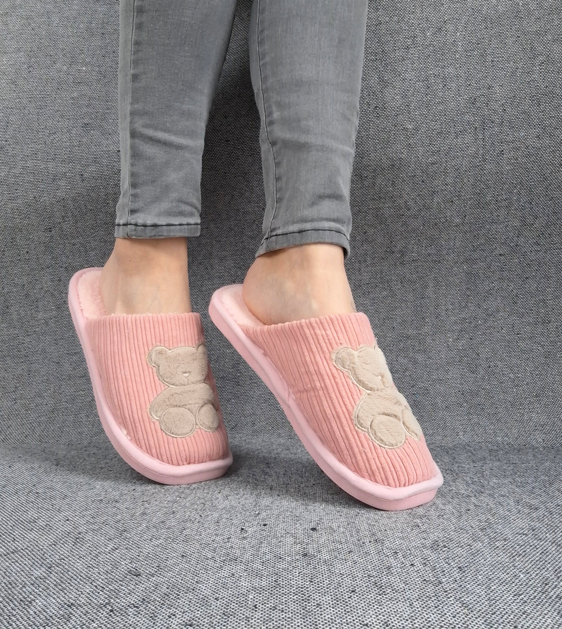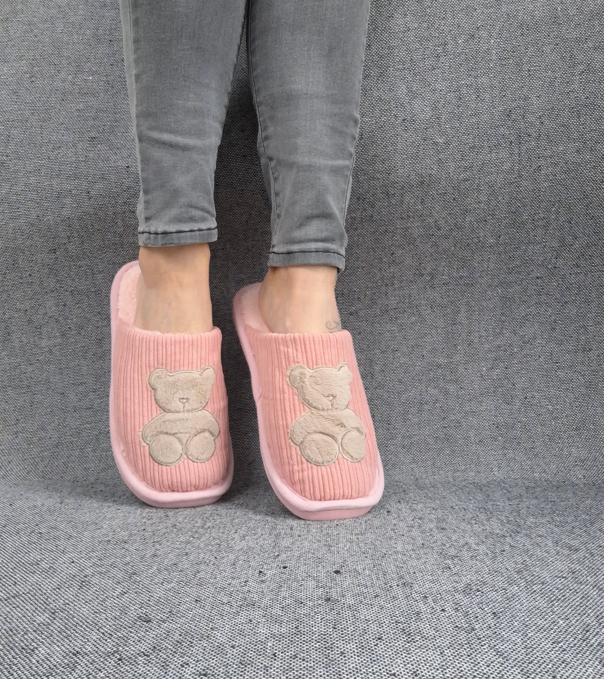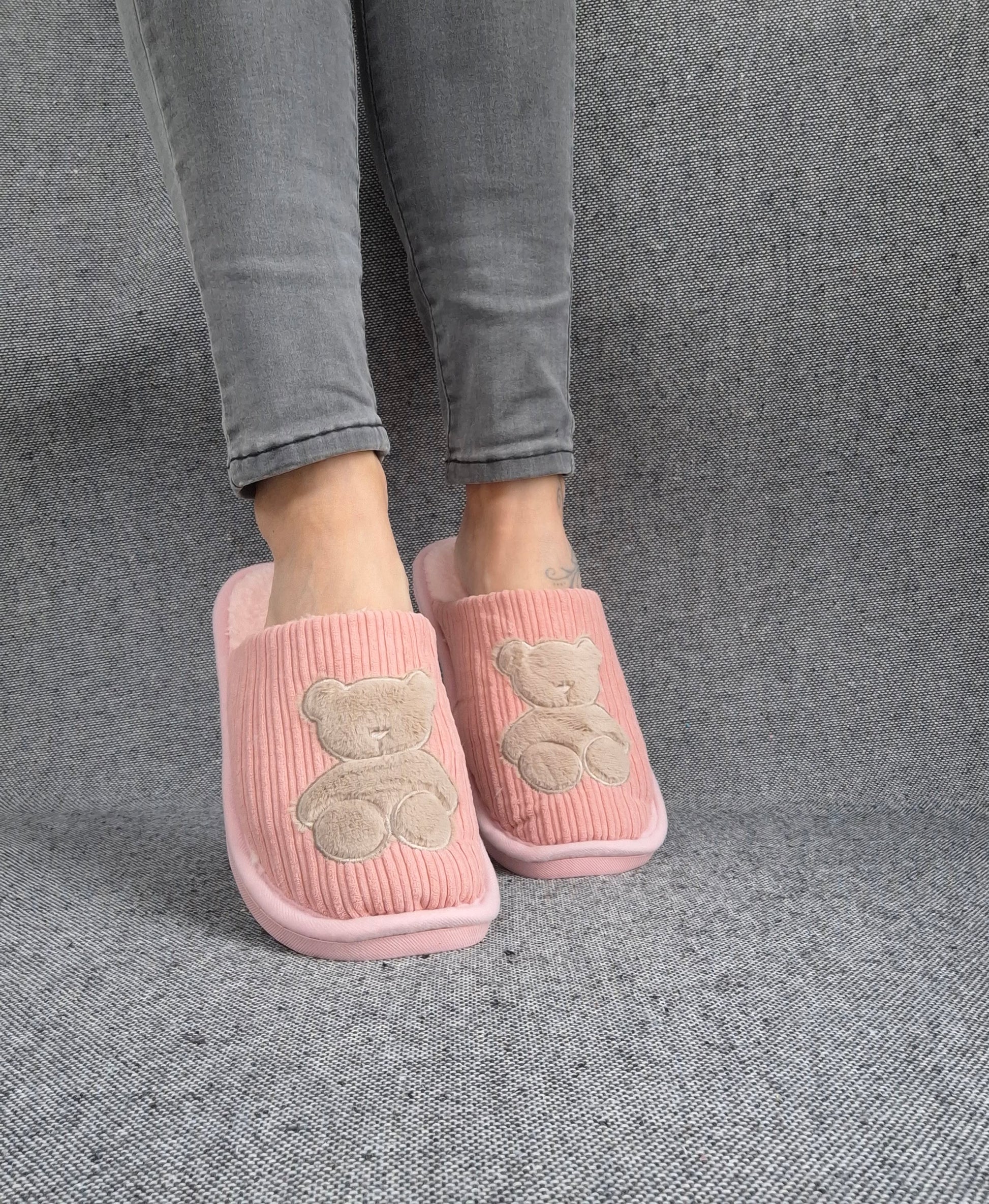 Les chaussons présentent un design mignon avec un ours brodé sur le devant. La texture du tissu est côtelée, offrant un look moderne. Ils sont disponibles en différentes couleurs.
