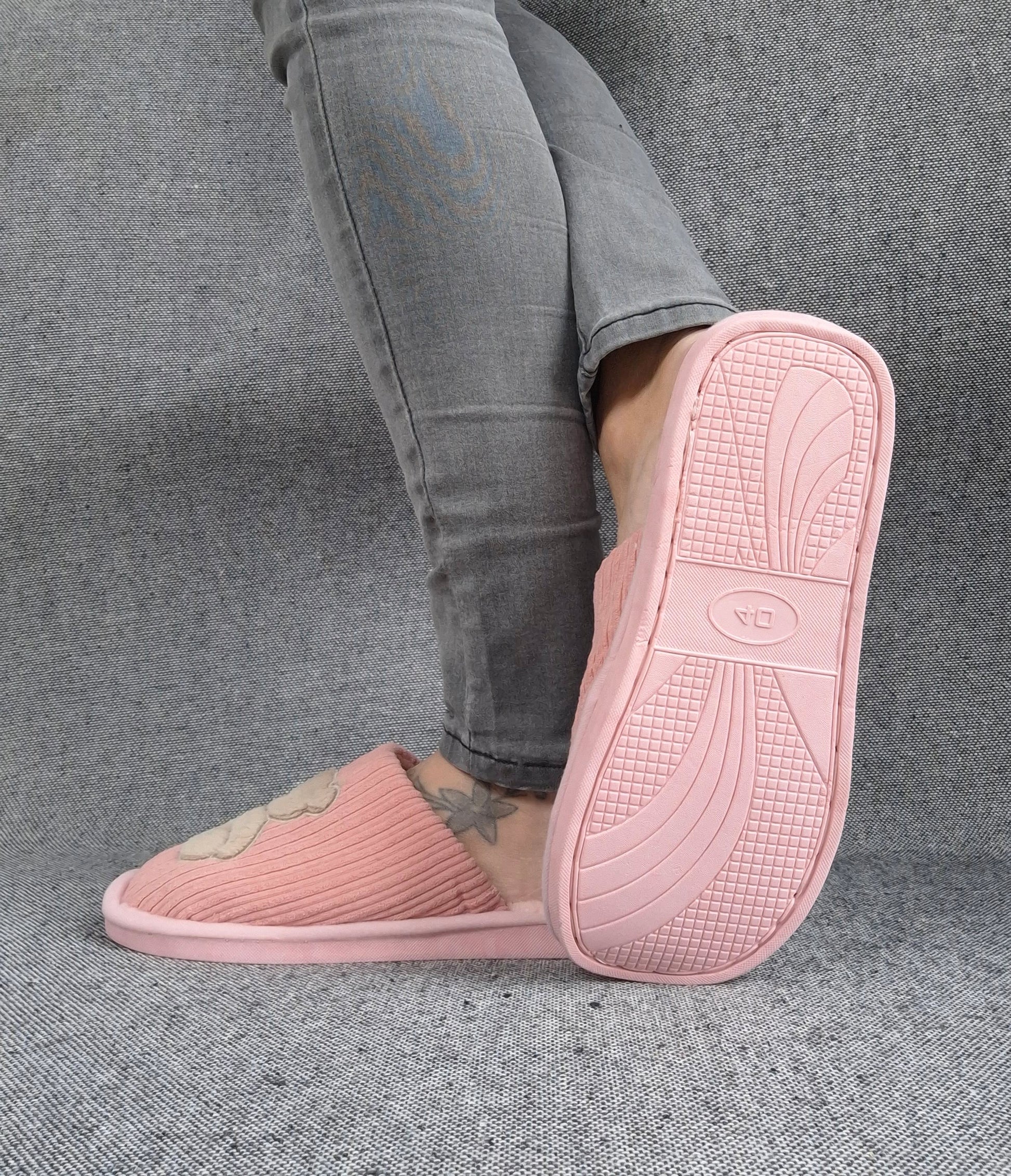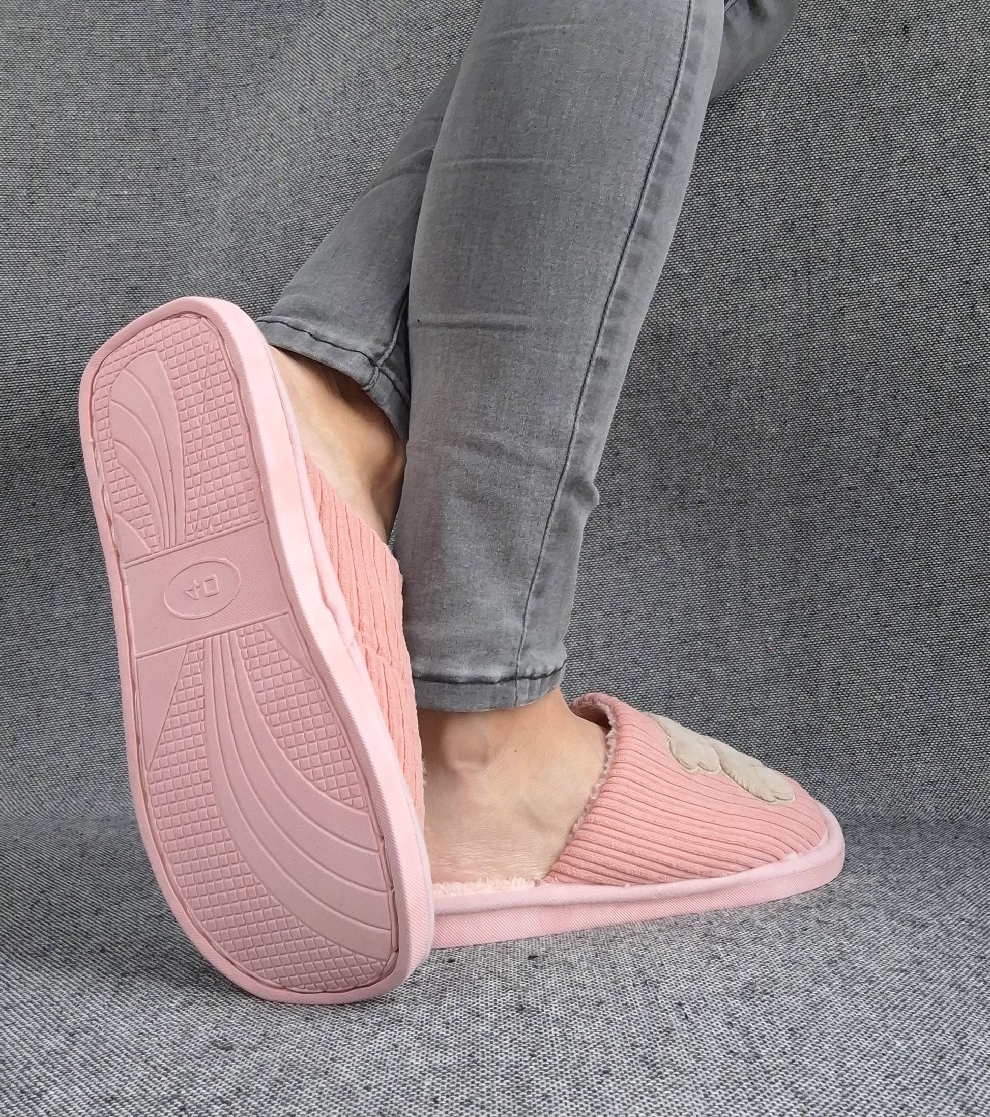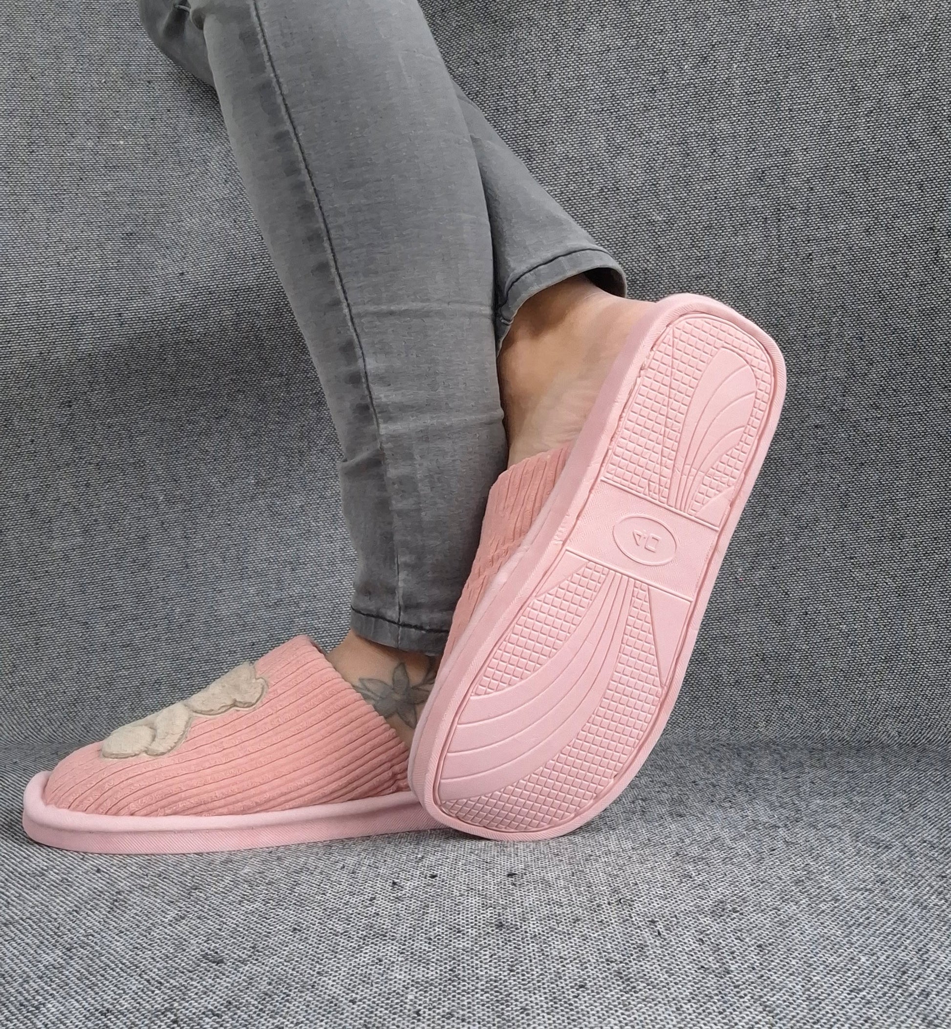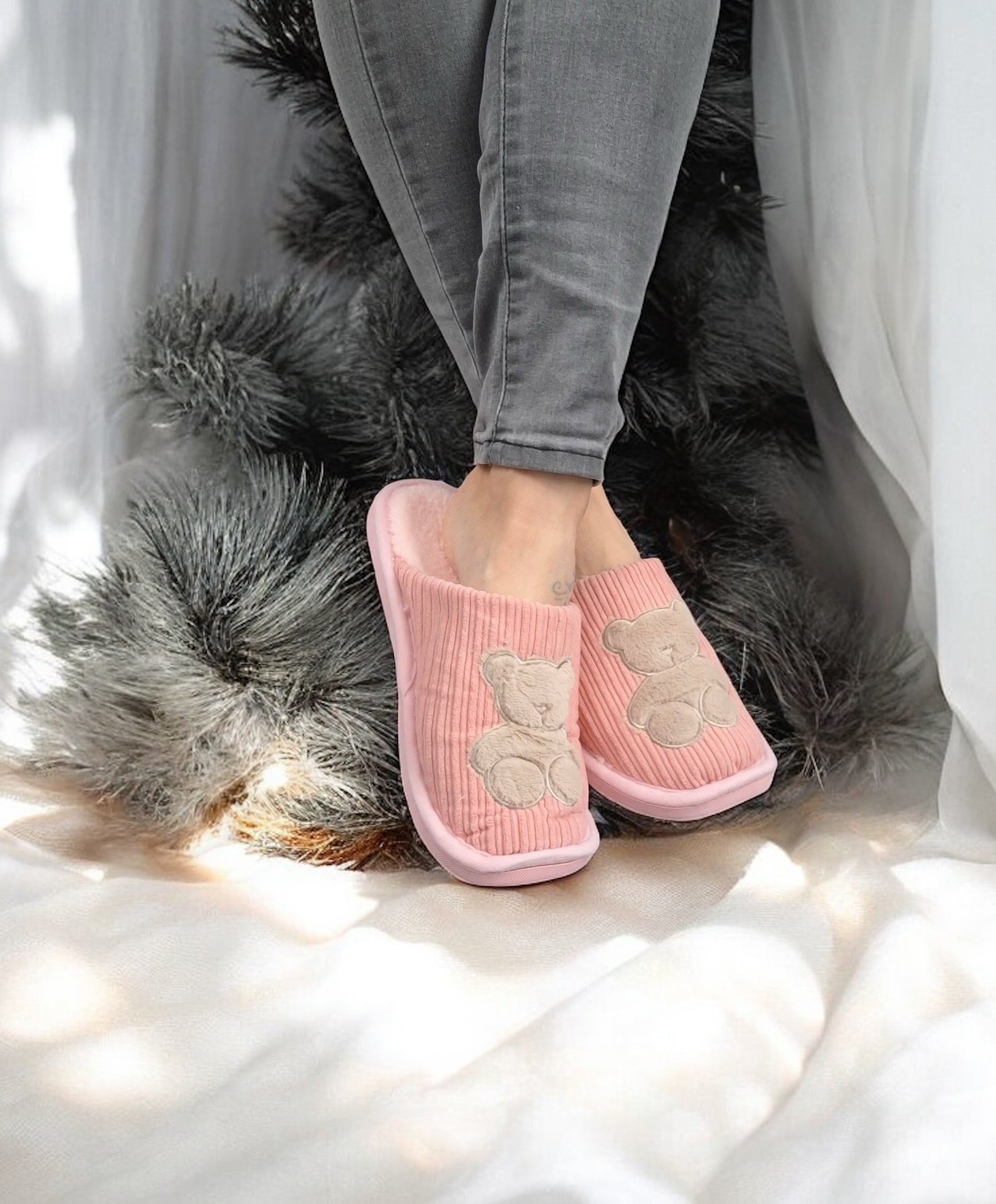 Les chaussons présentent un design mignon avec un ours brodé sur le devant. La texture du tissu est côtelée, offrant un look moderne. Ils sont disponibles en différentes couleurs.