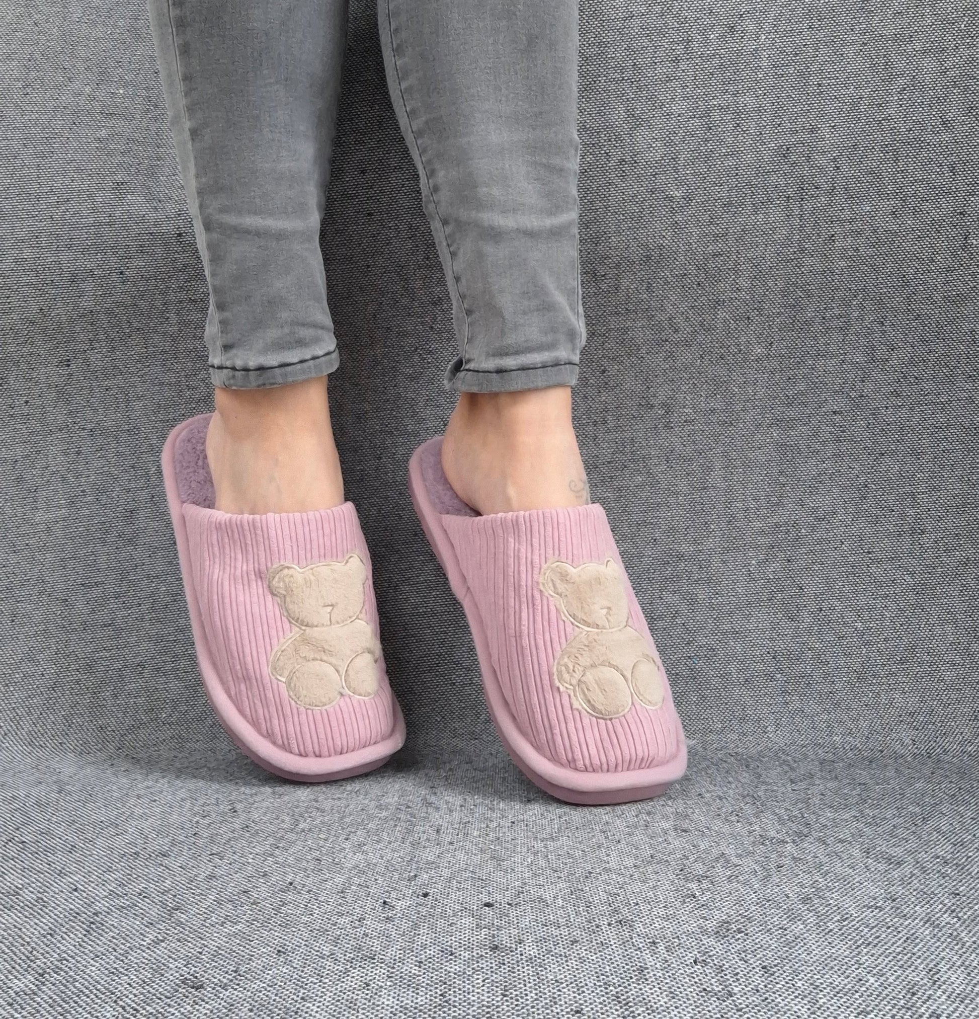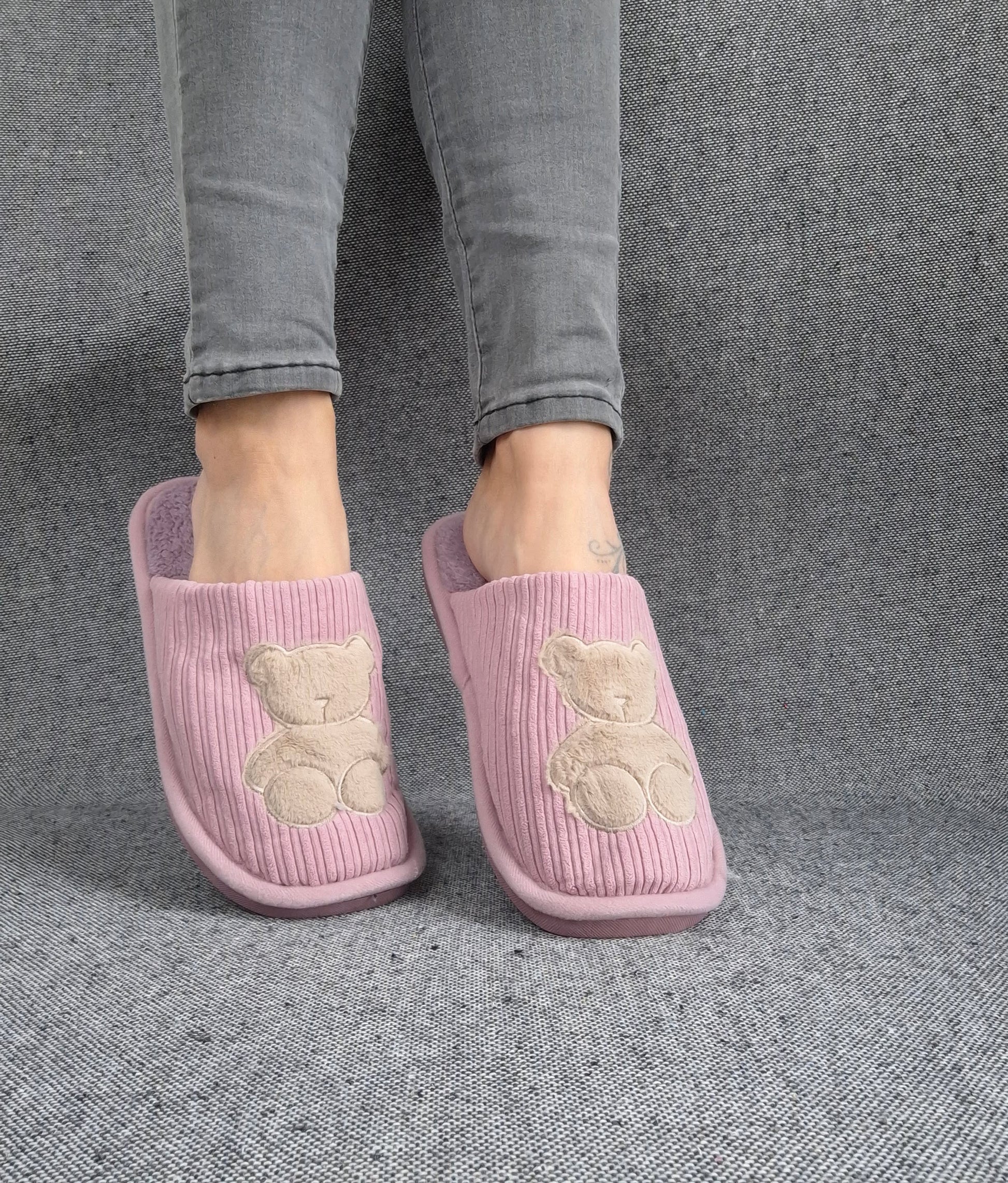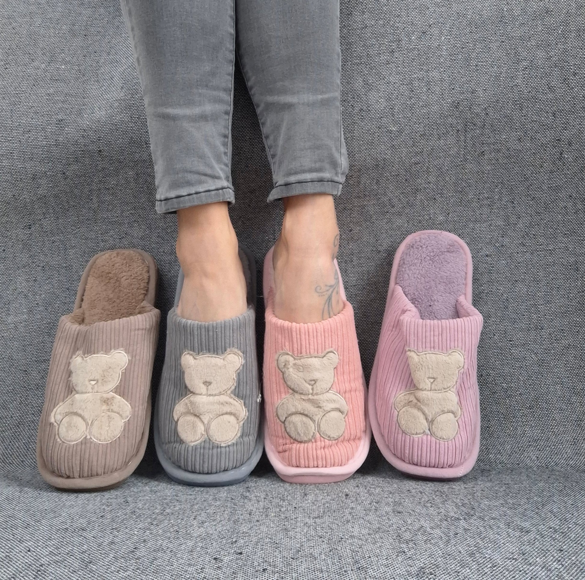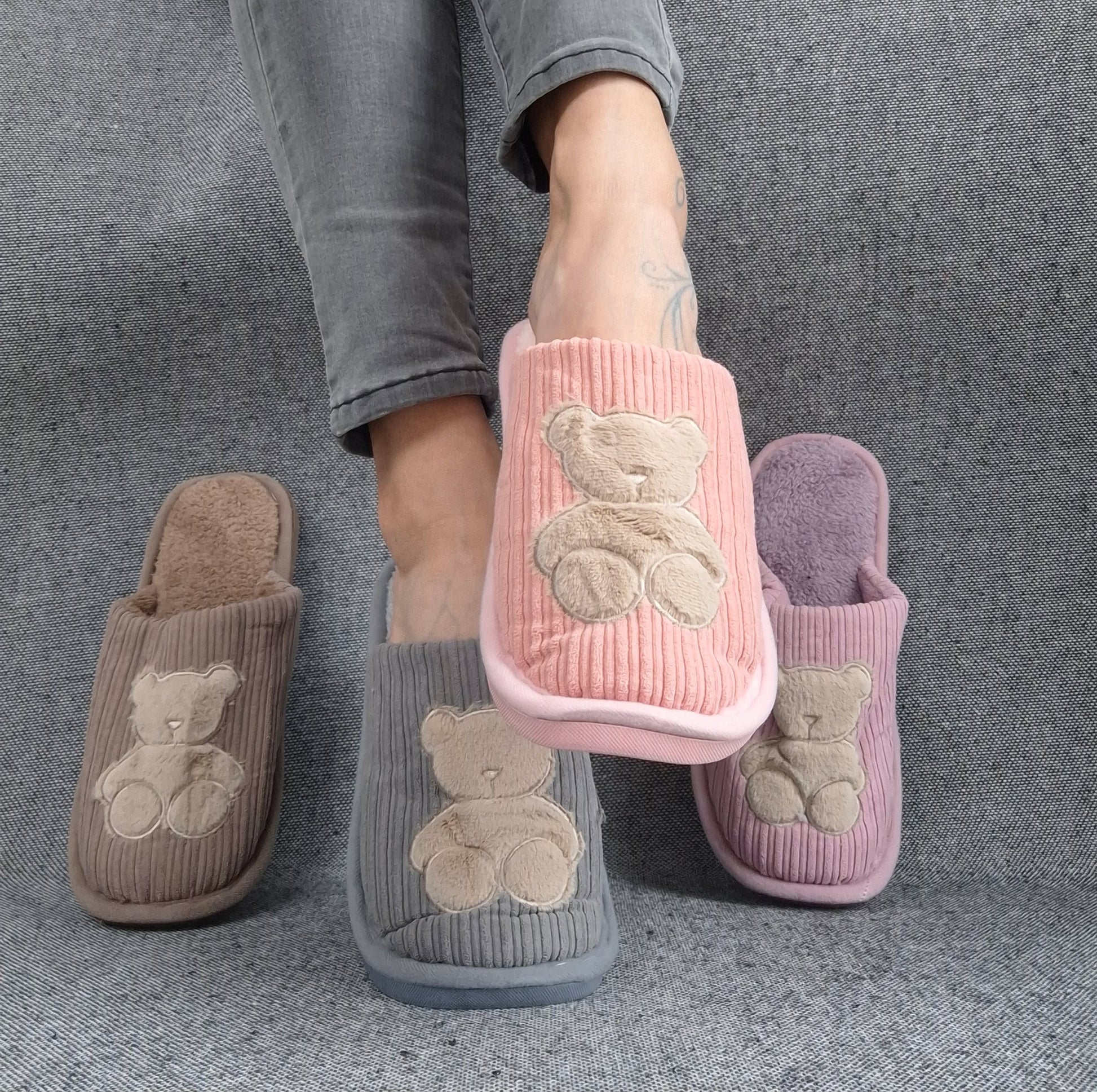 Les chaussons présentent un design mignon avec un ours brodé sur le devant. La texture du tissu est côtelée, offrant un look moderne. Ils sont disponibles en différentes couleurs.