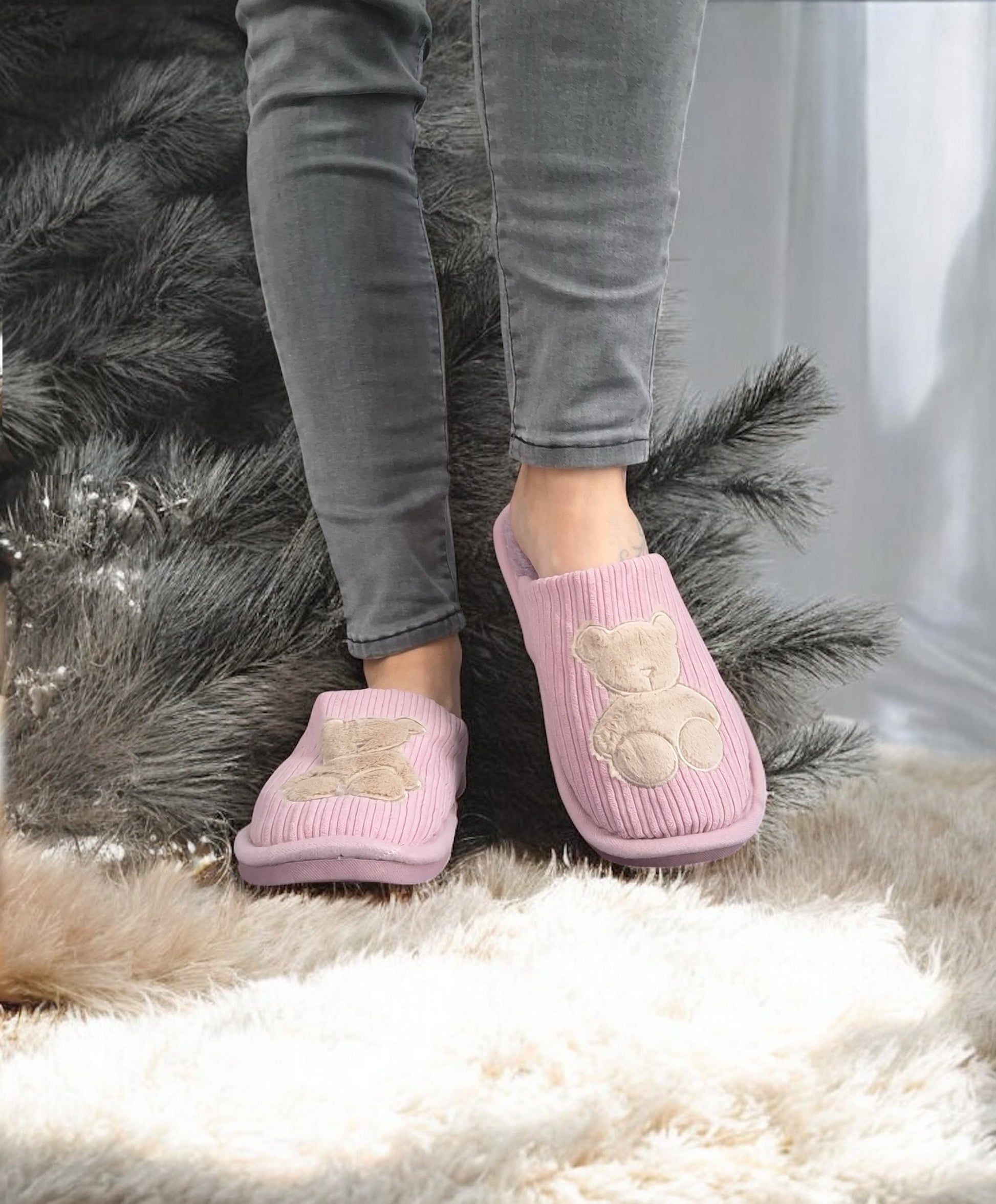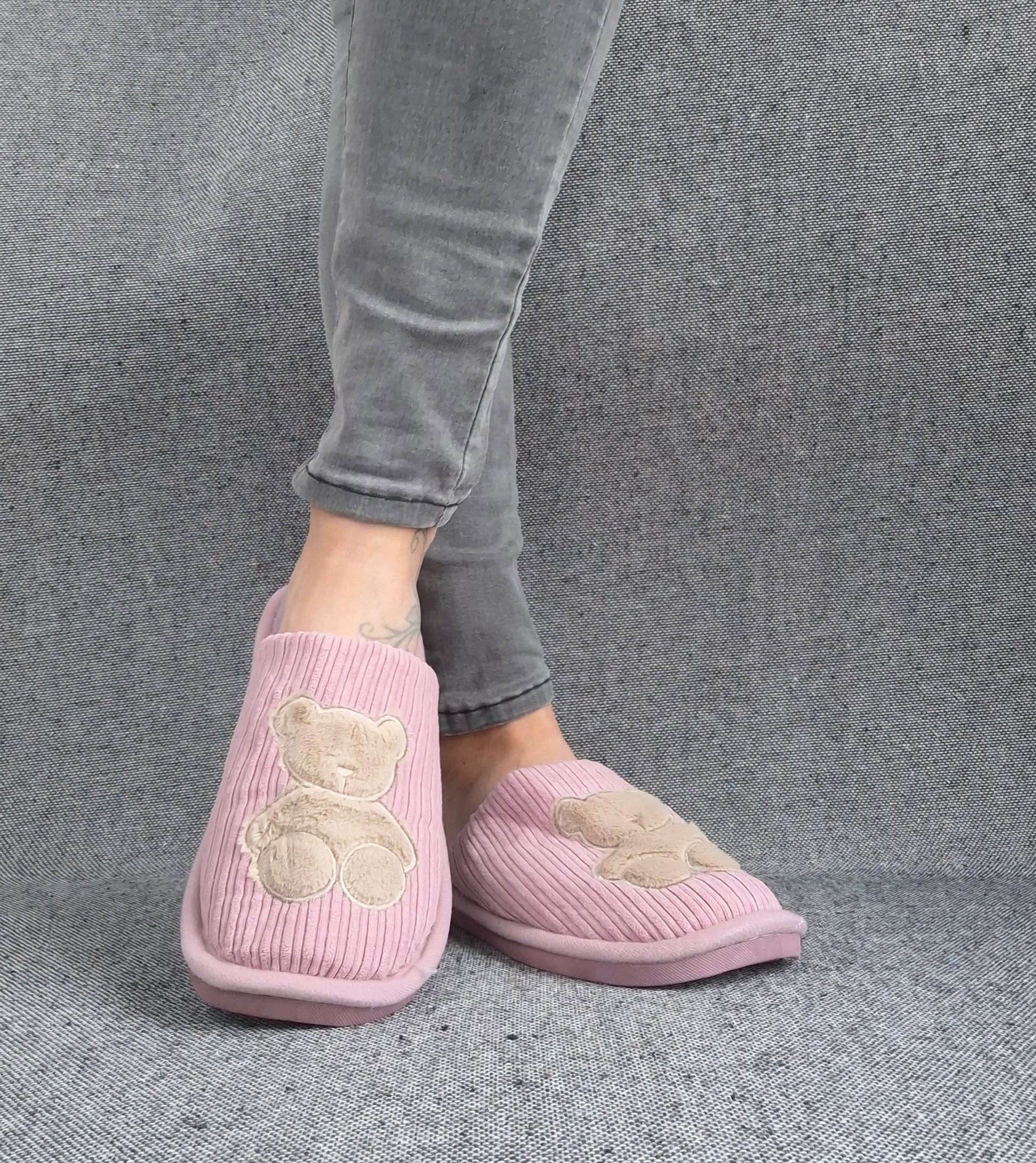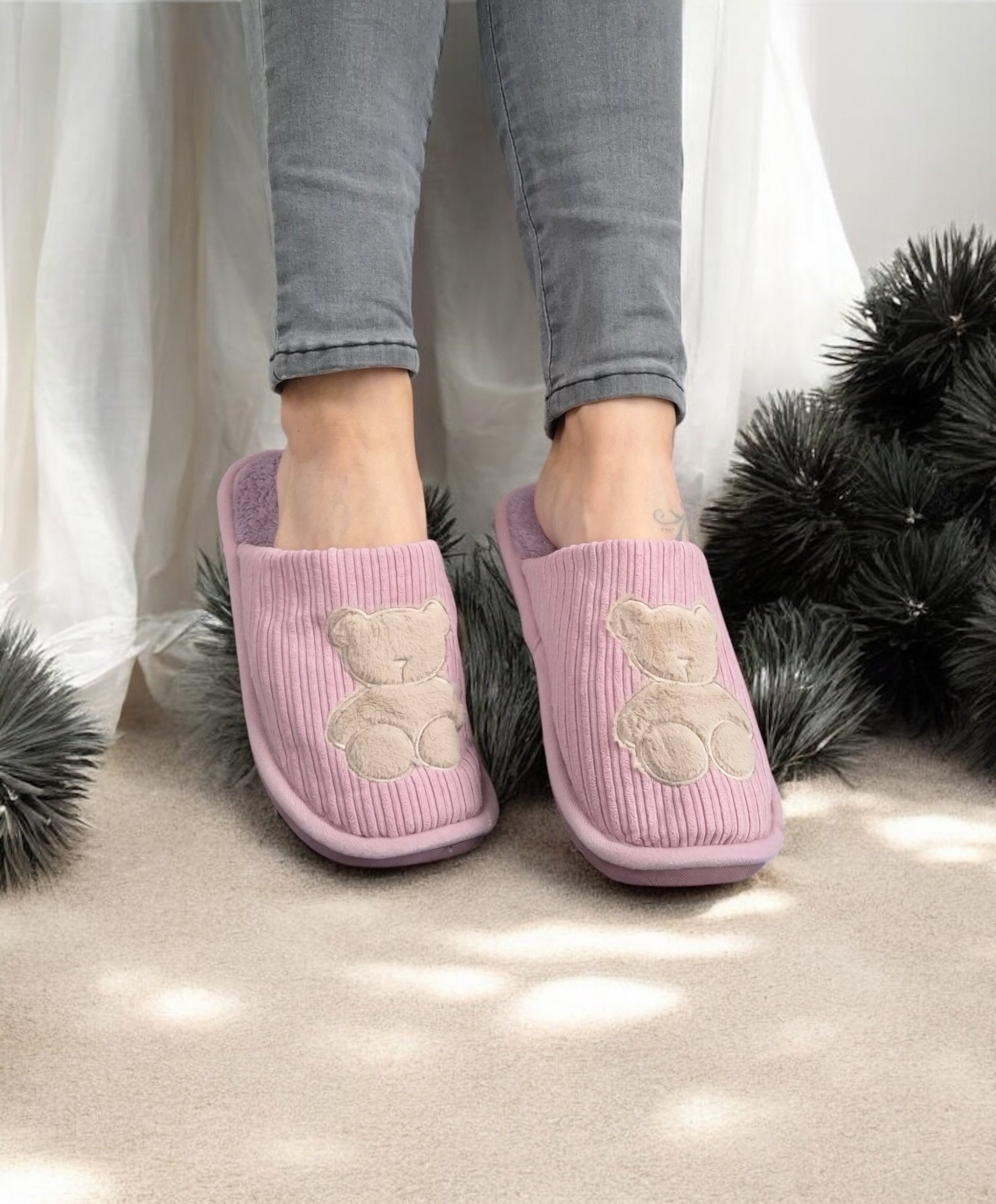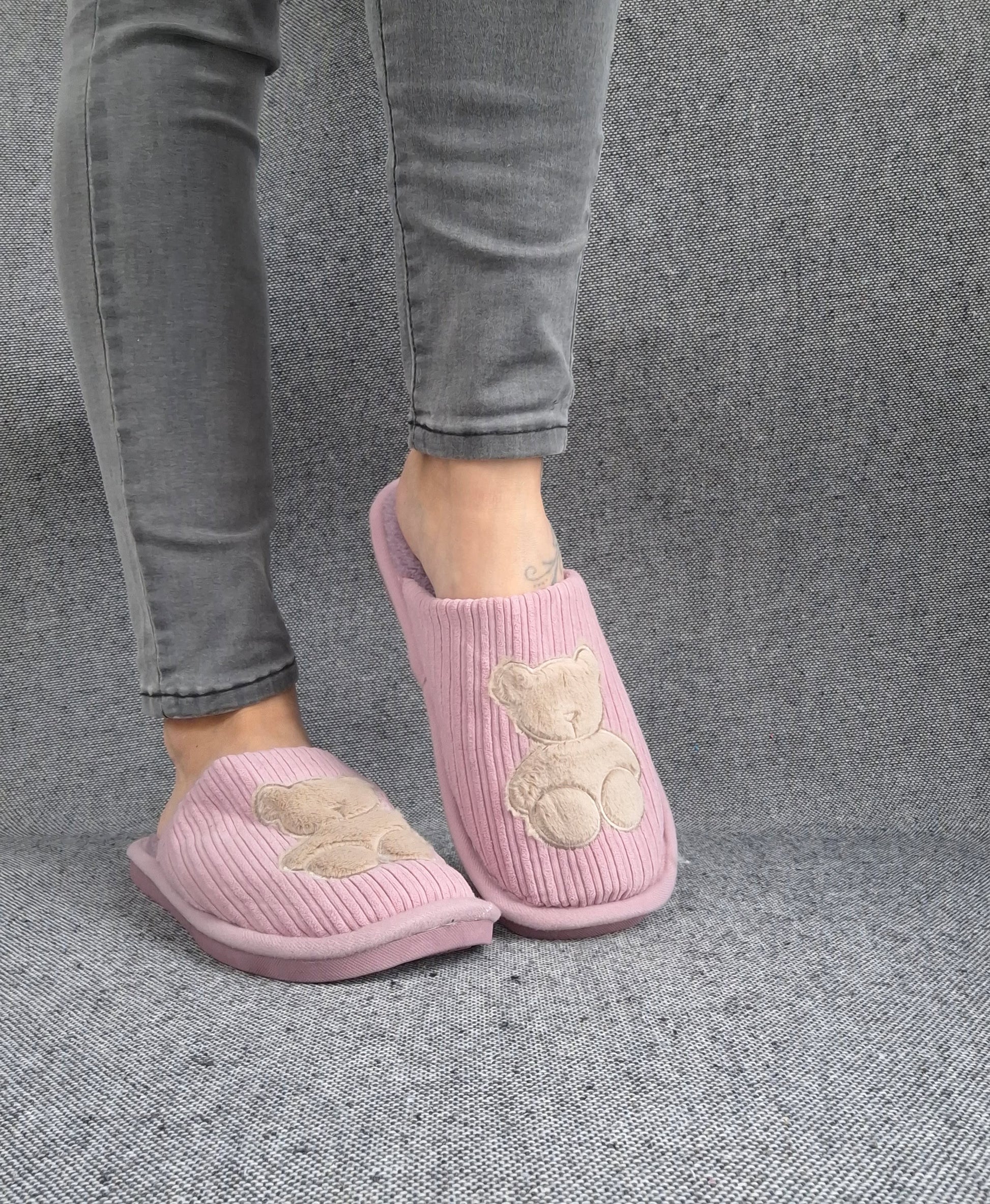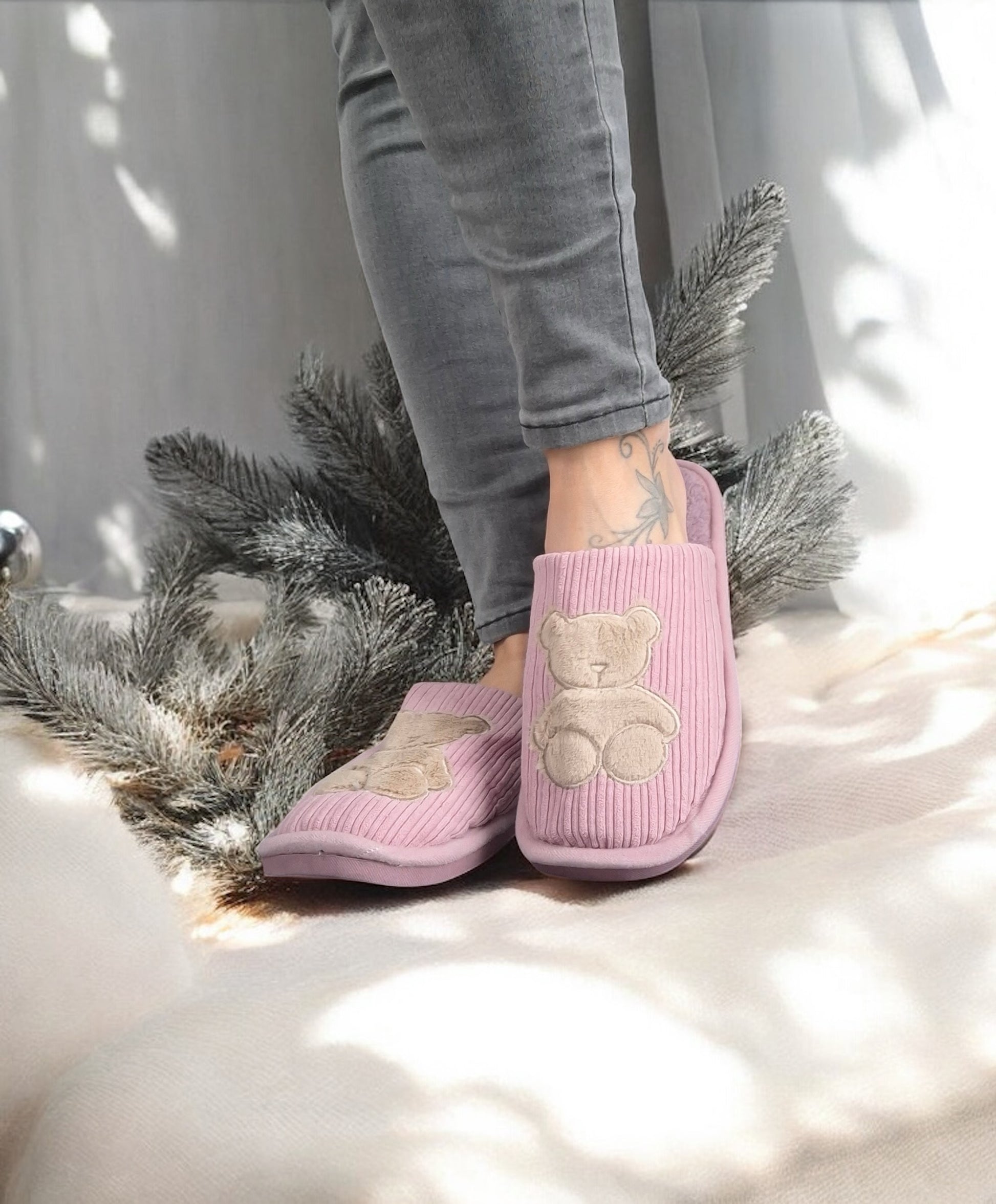 Les chaussons présentent un design mignon avec un ours brodé sur le devant. La texture du tissu est côtelée, offrant un look moderne. Ils sont disponibles en différentes couleurs.