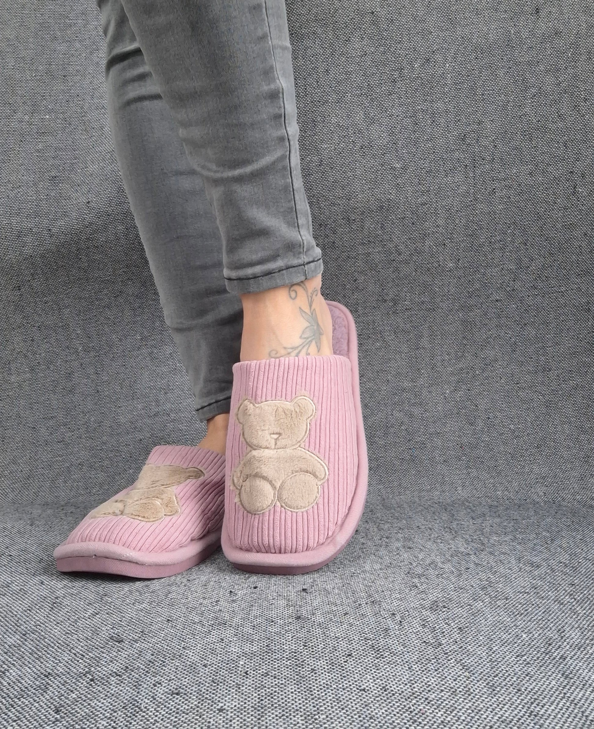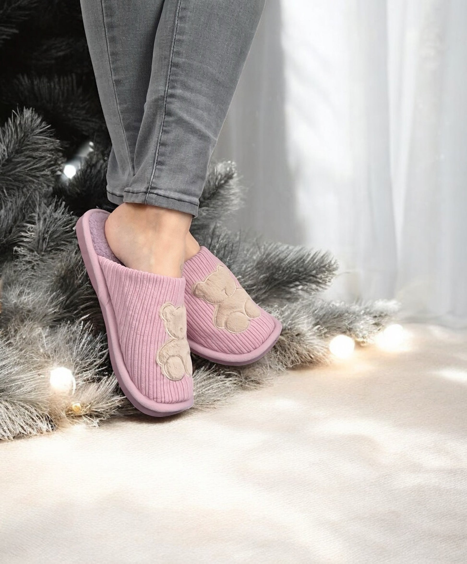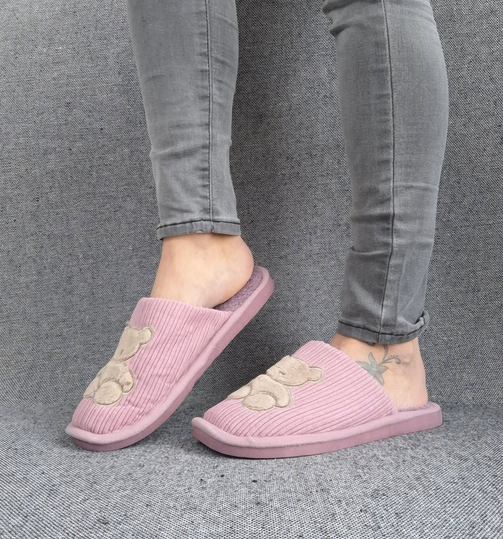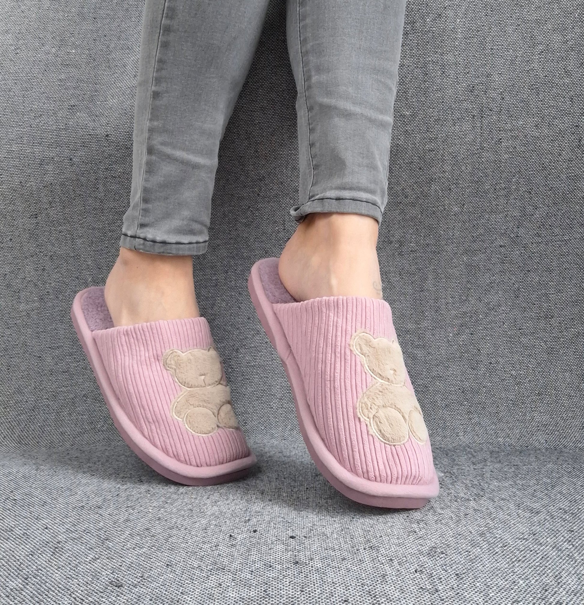 Les chaussons présentent un design mignon avec un ours brodé sur le devant. La texture du tissu est côtelée, offrant un look moderne. Ils sont disponibles en différentes couleurs.