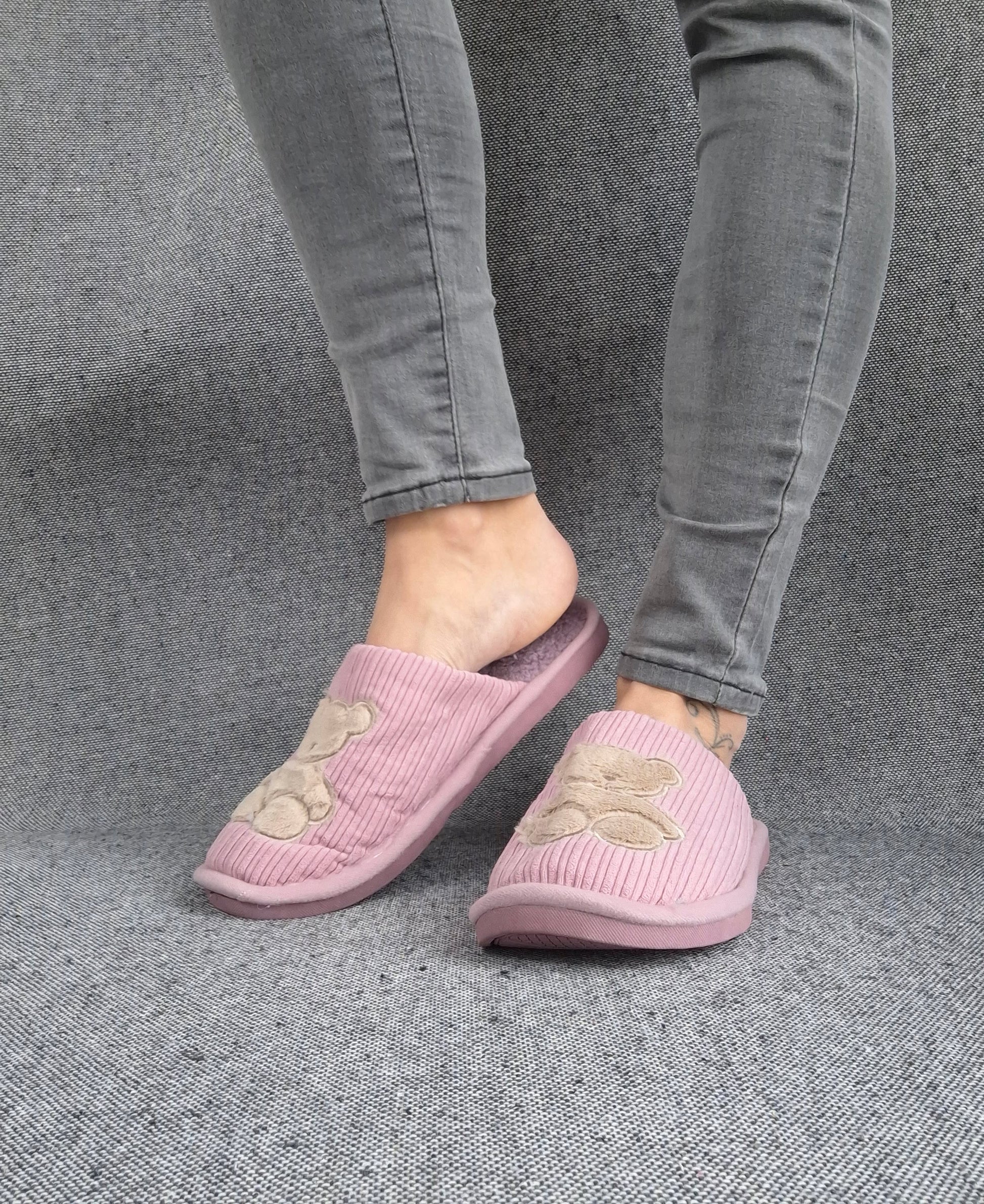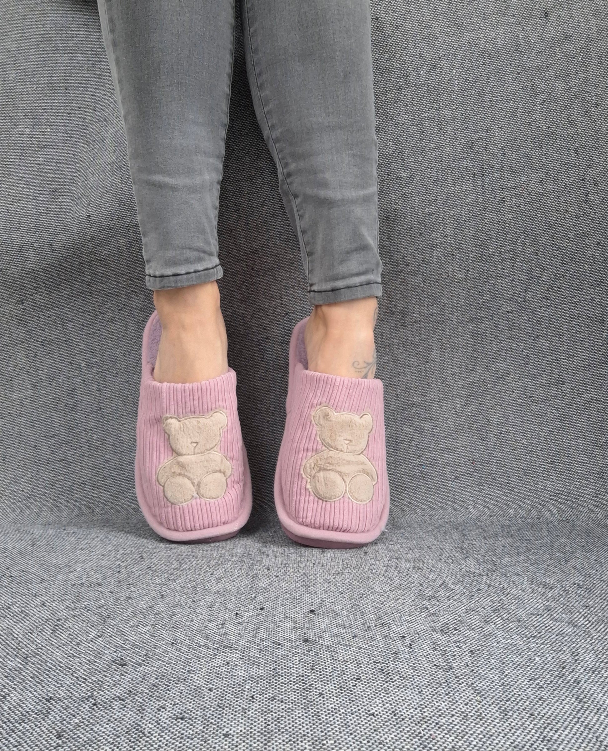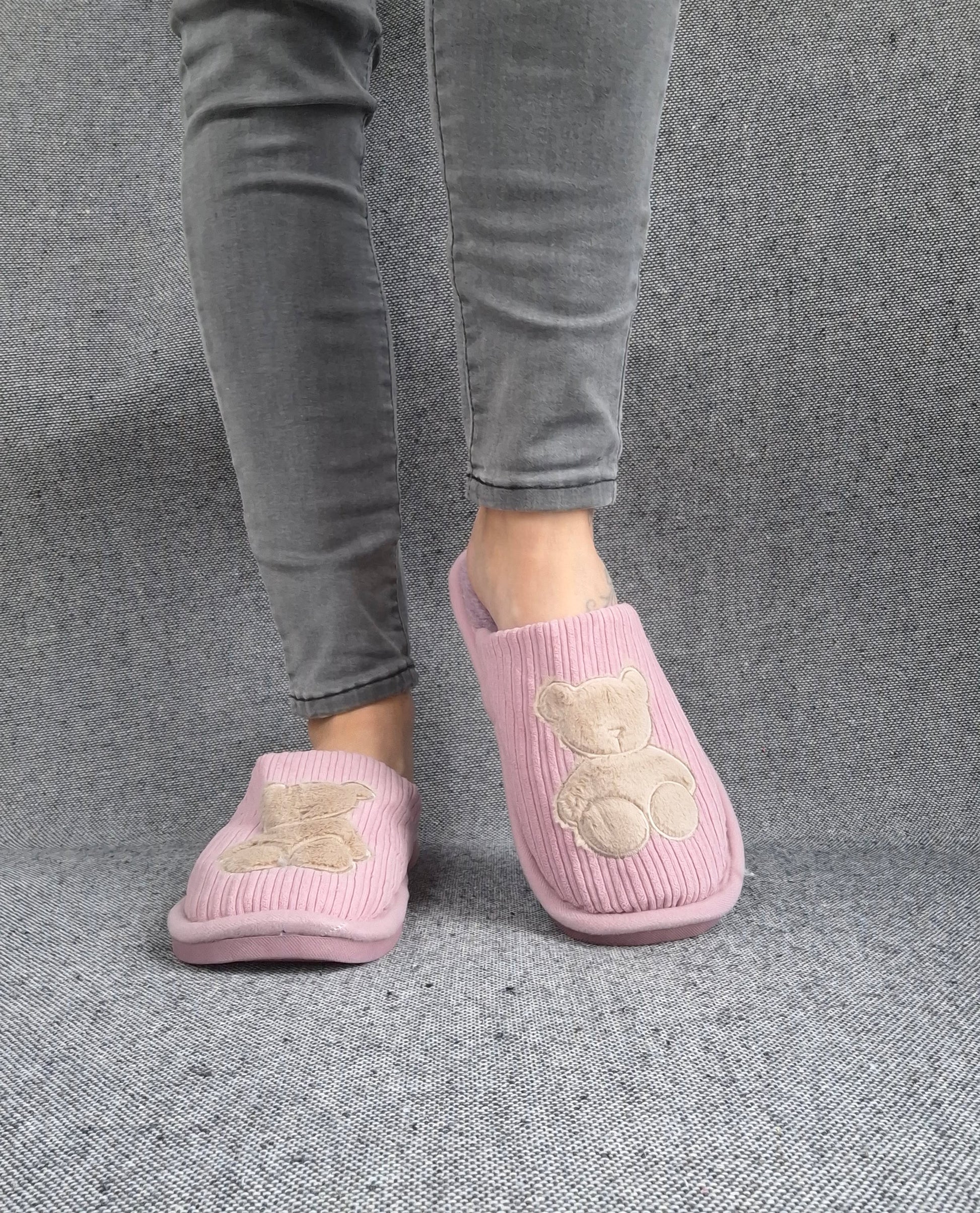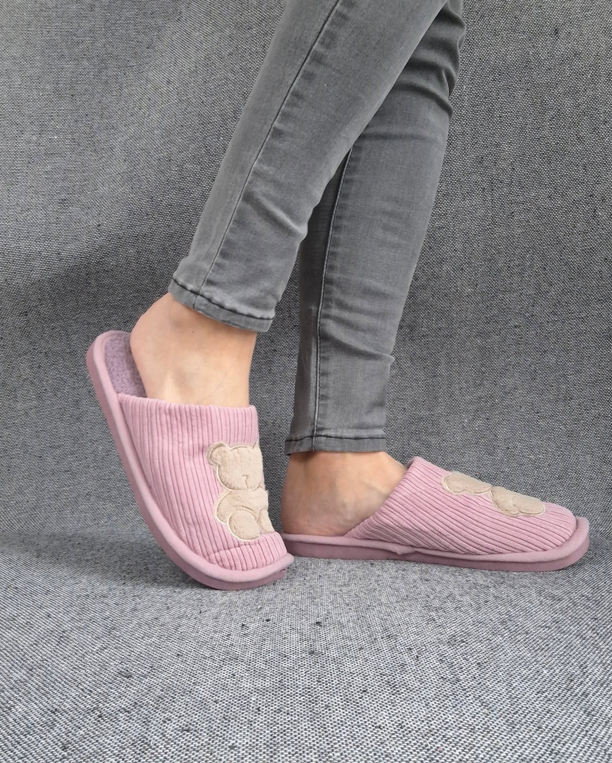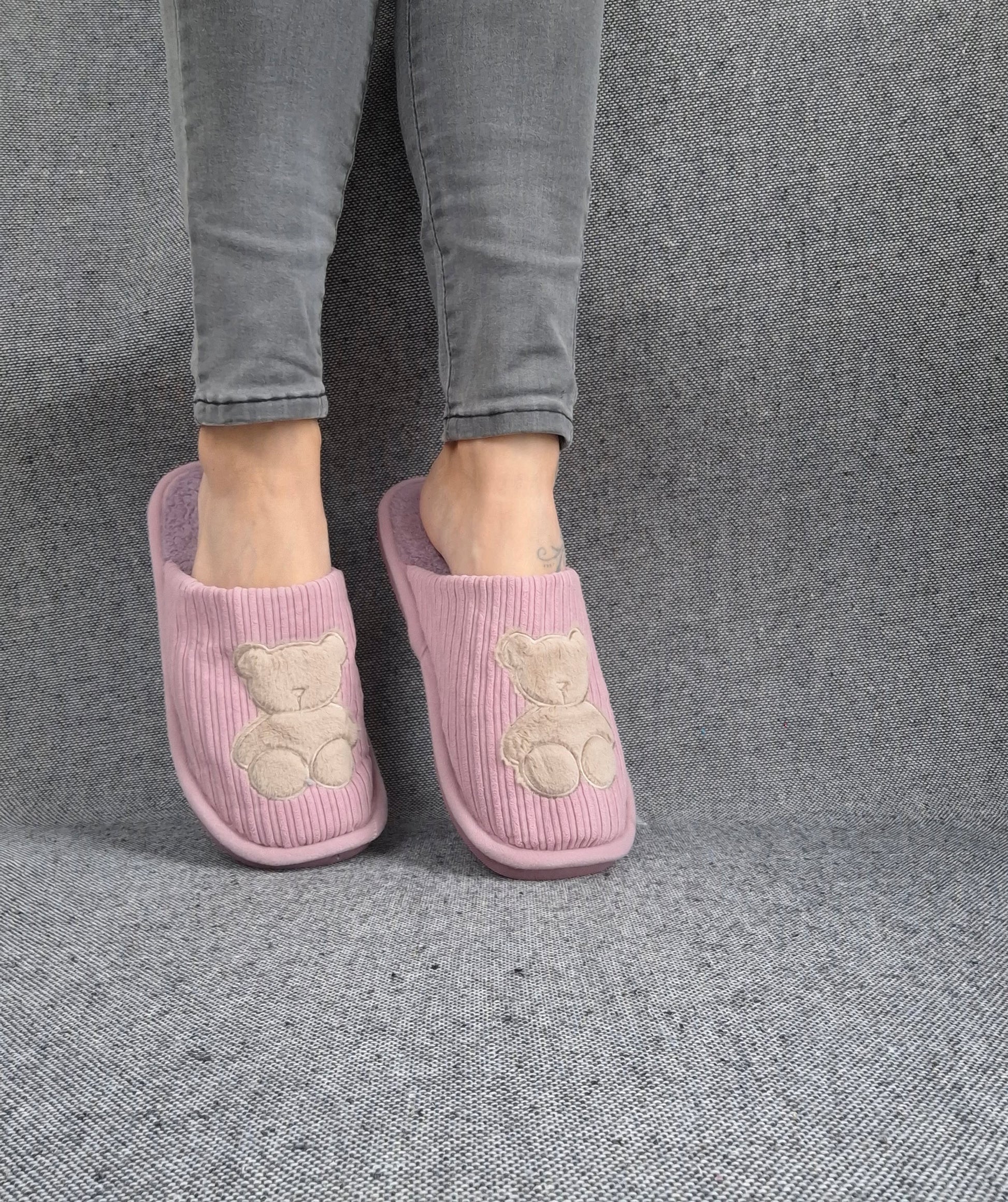 Les chaussons présentent un design mignon avec un ours brodé sur le devant. La texture du tissu est côtelée, offrant un look moderne. Ils sont disponibles en différentes couleurs.