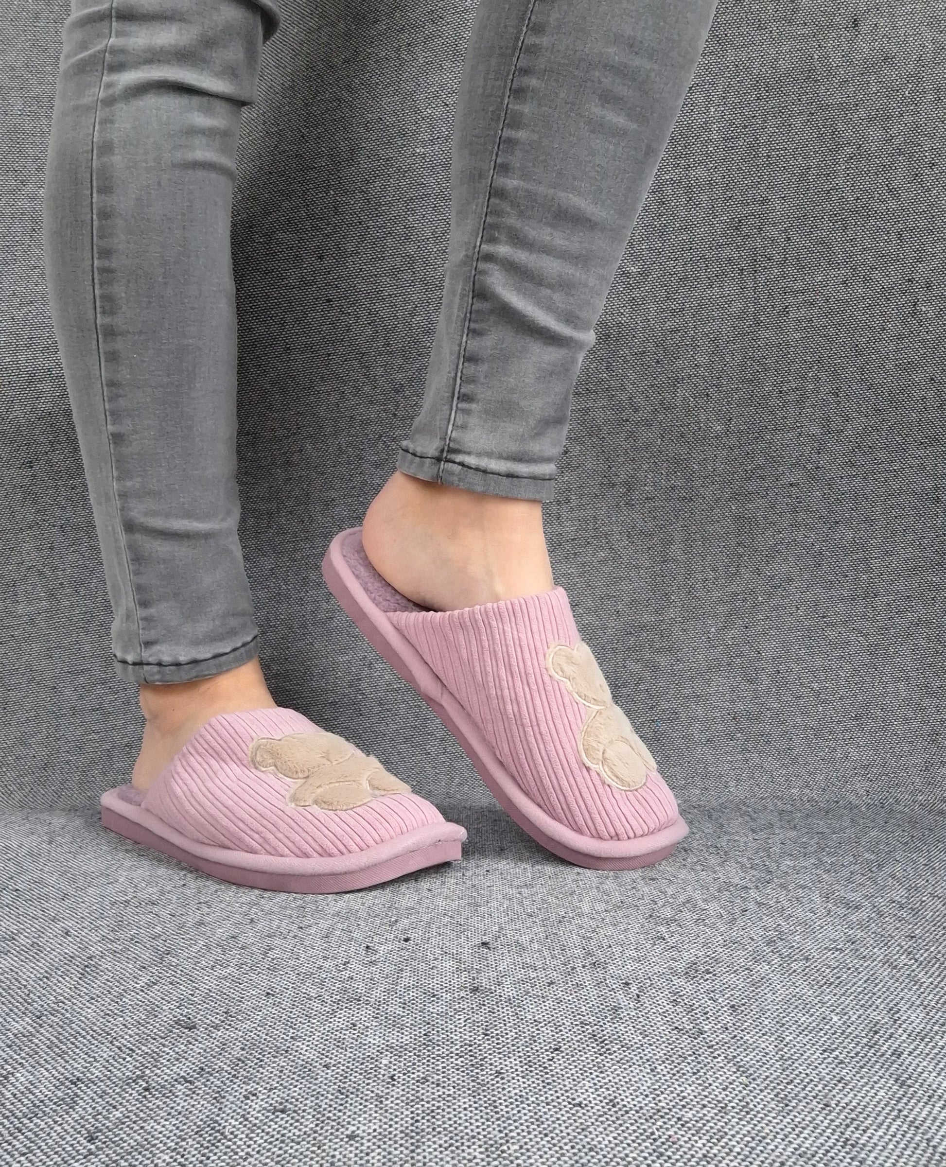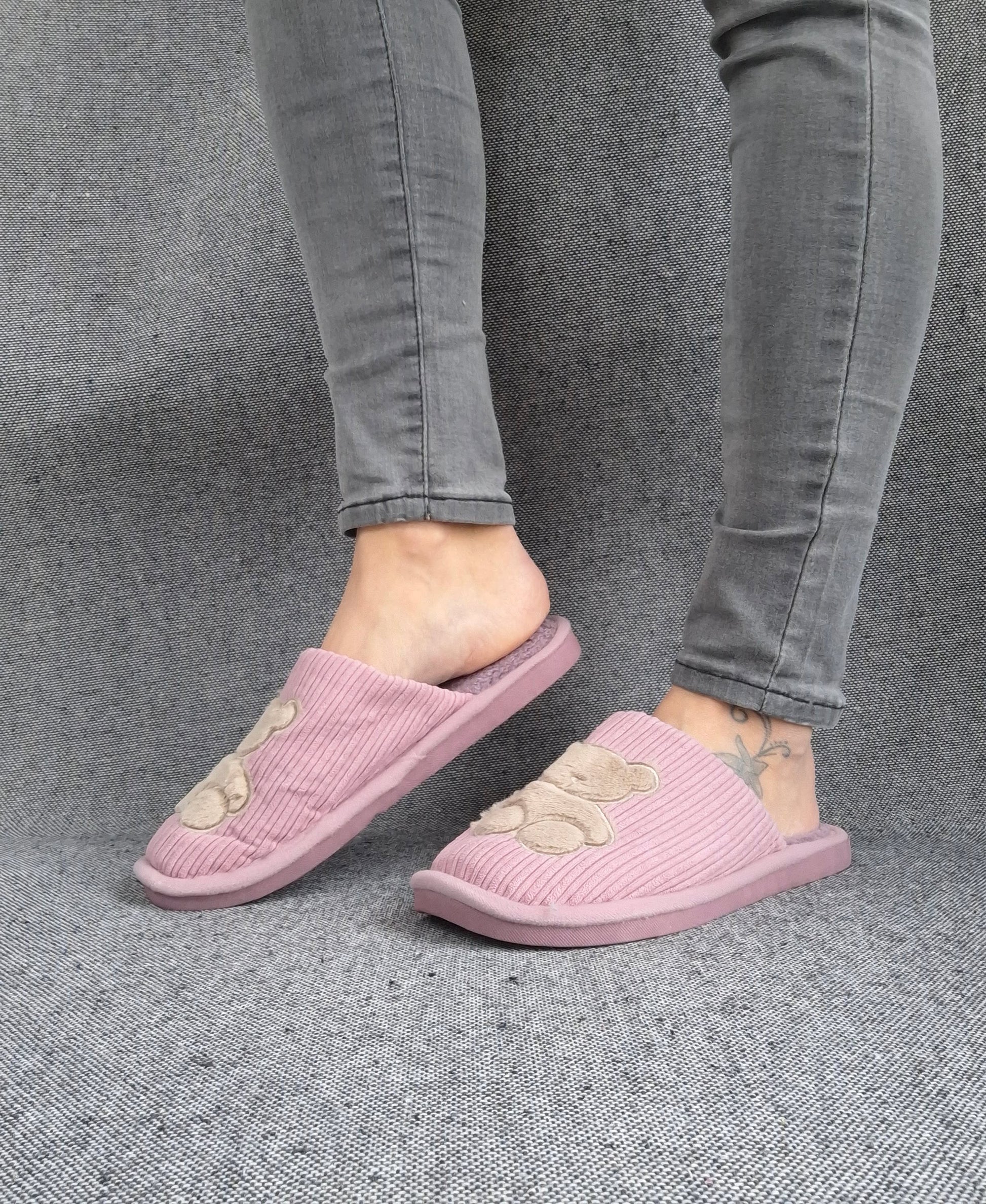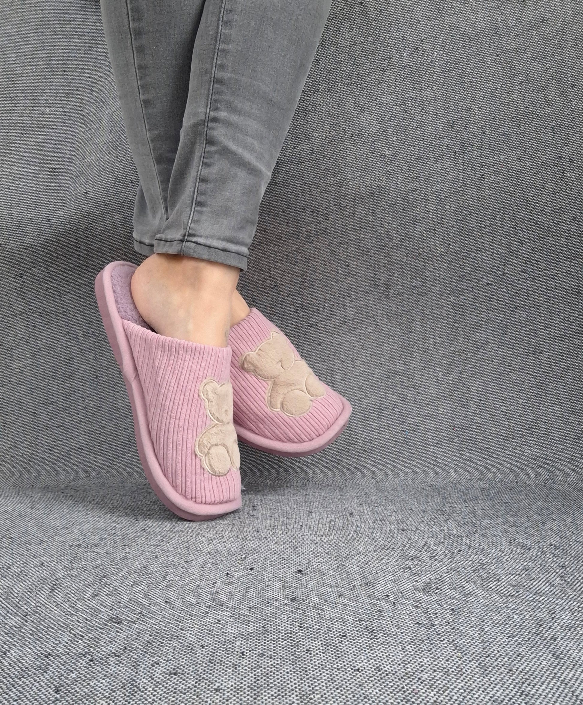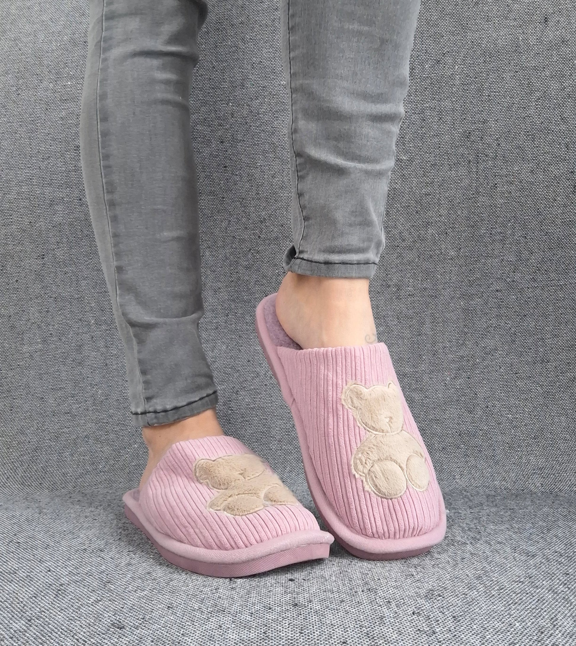 Les chaussons présentent un design mignon avec un ours brodé sur le devant. La texture du tissu est côtelée, offrant un look moderne. Ils sont disponibles en différentes couleurs.
