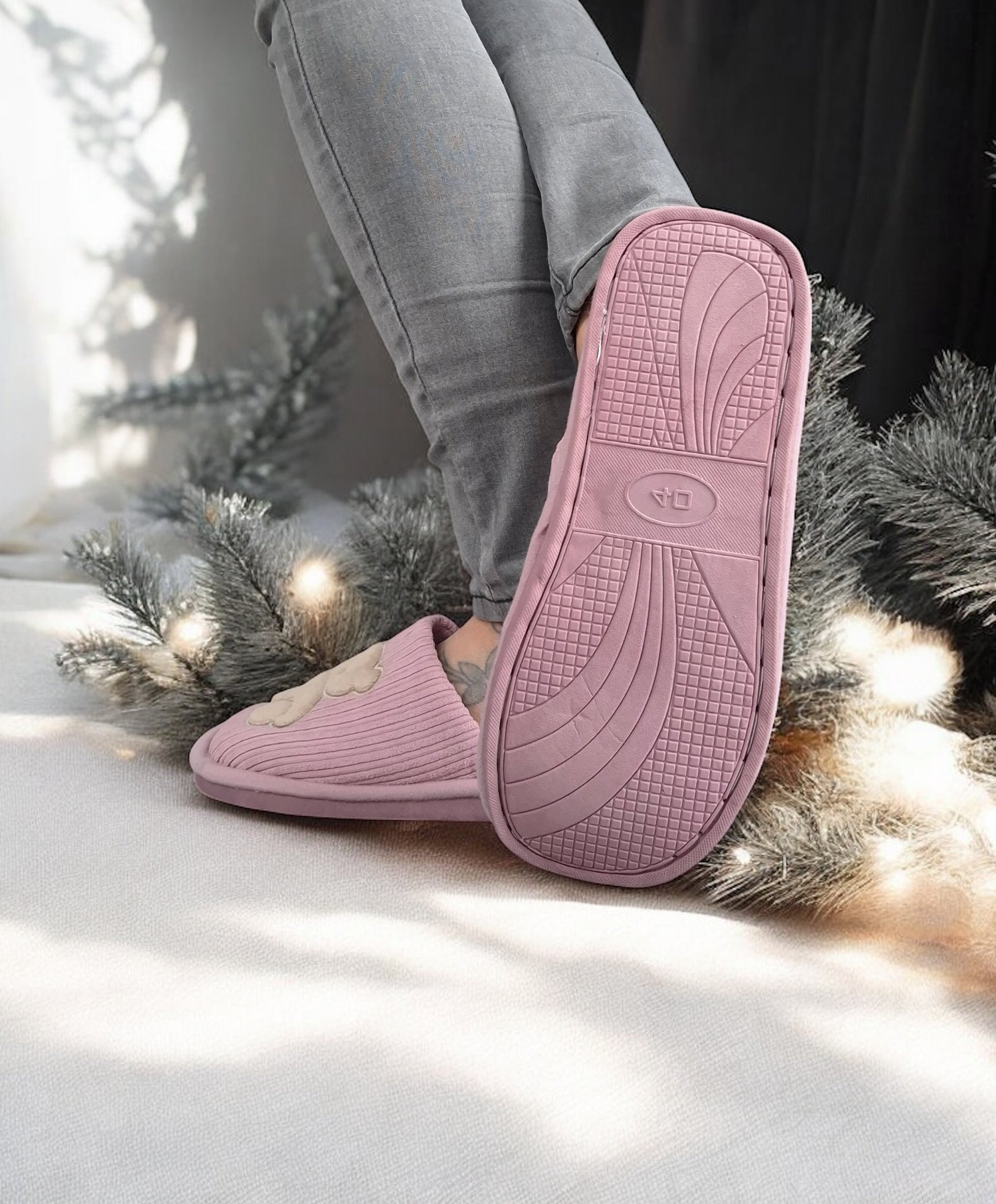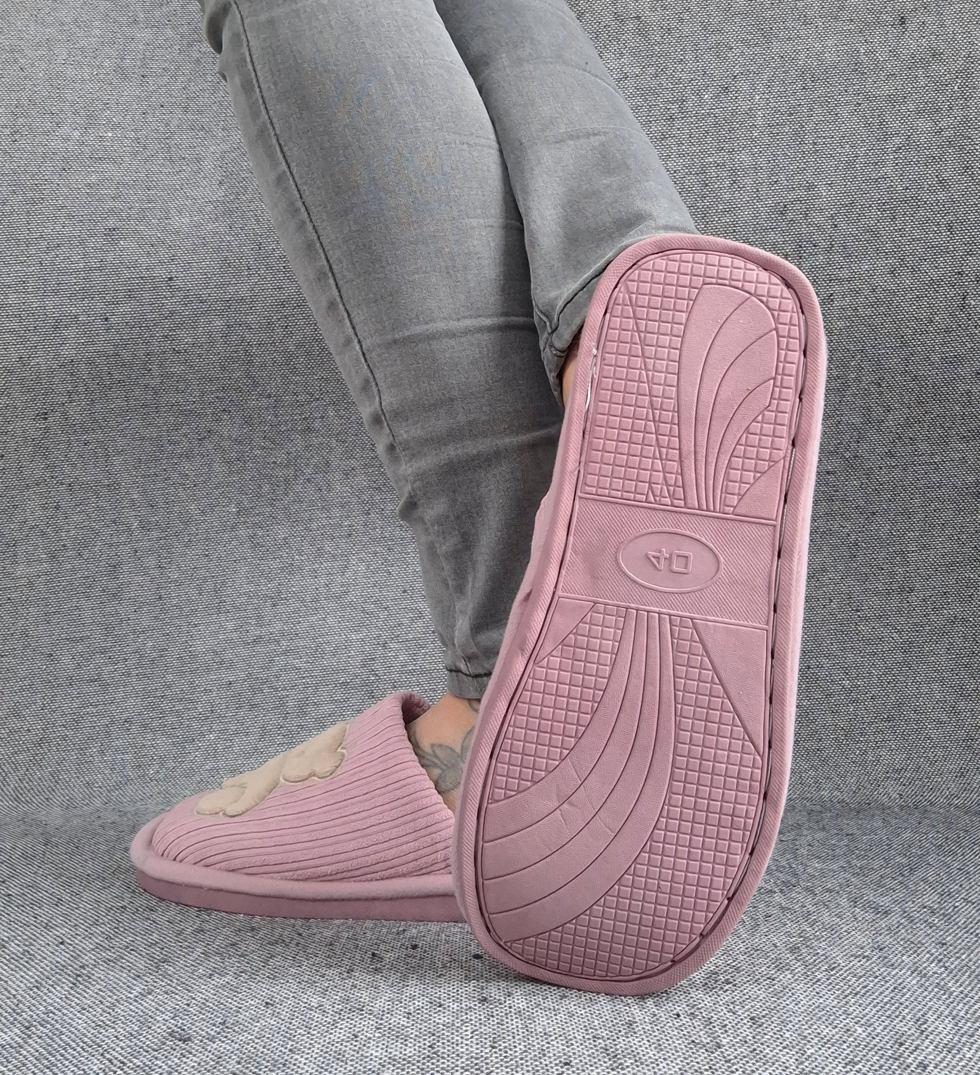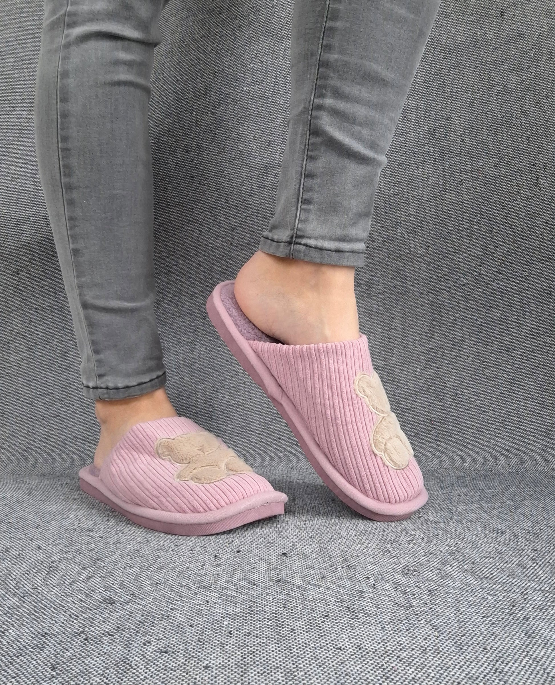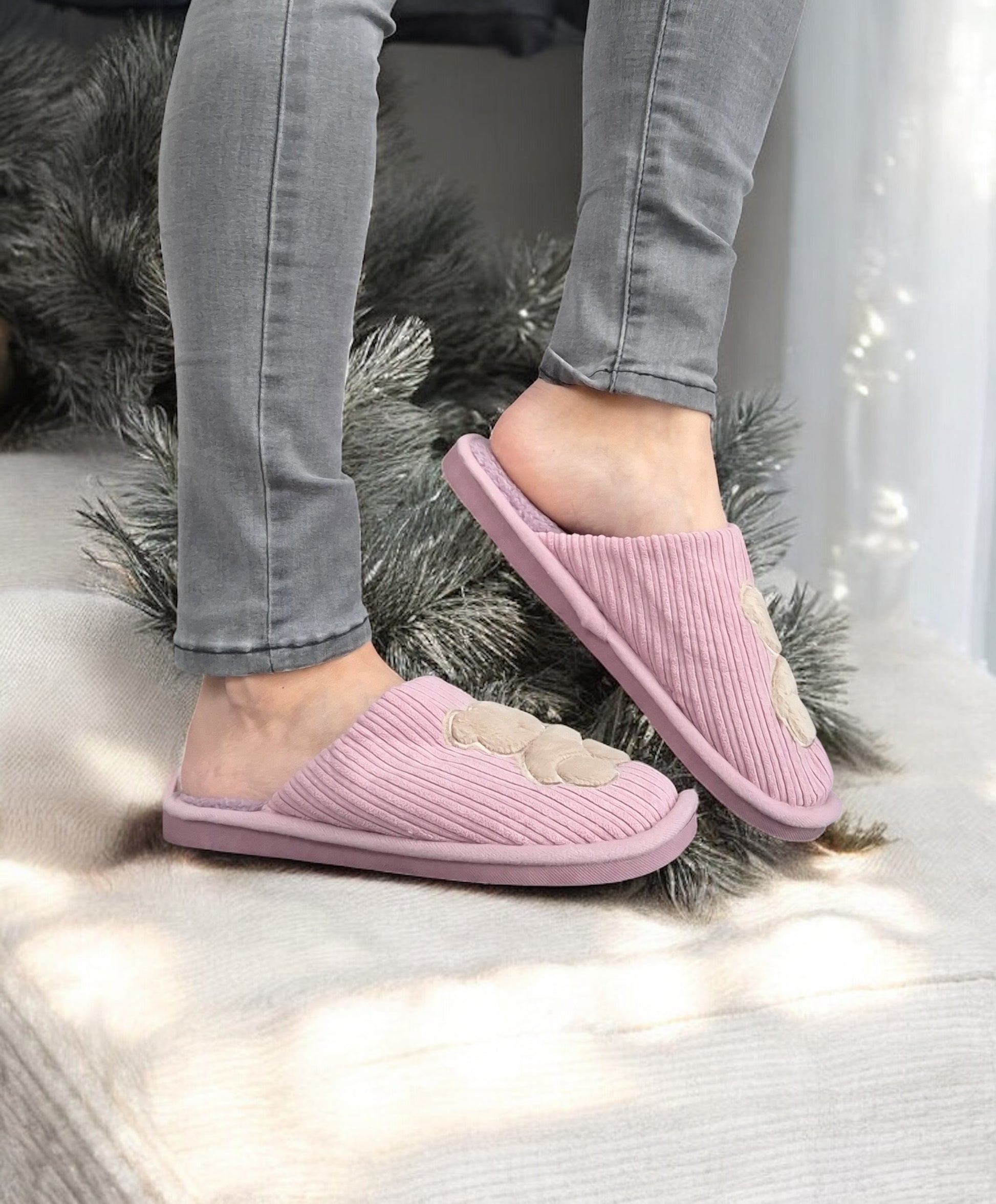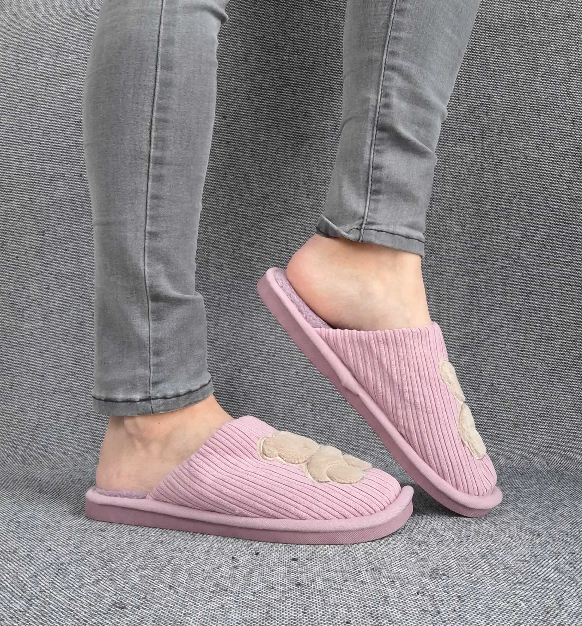 Les chaussons présentent un design mignon avec un ours brodé sur le devant. La texture du tissu est côtelée, offrant un look moderne. Ils sont disponibles en différentes couleurs.