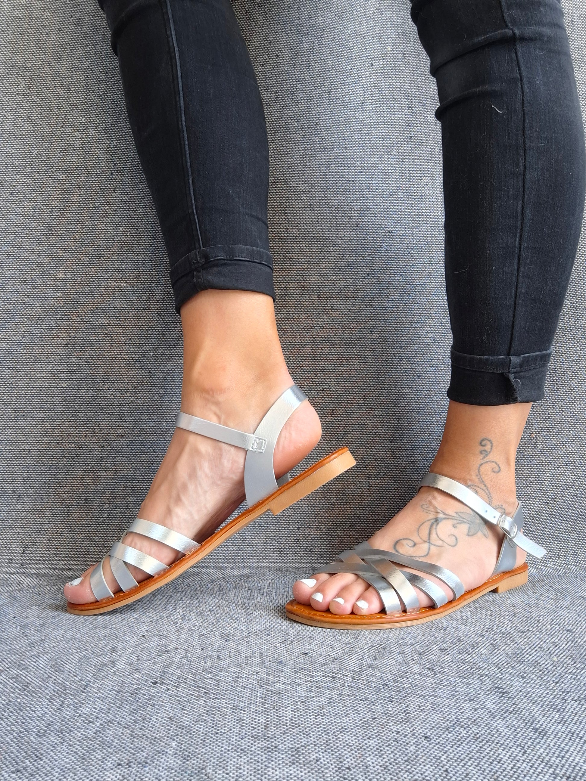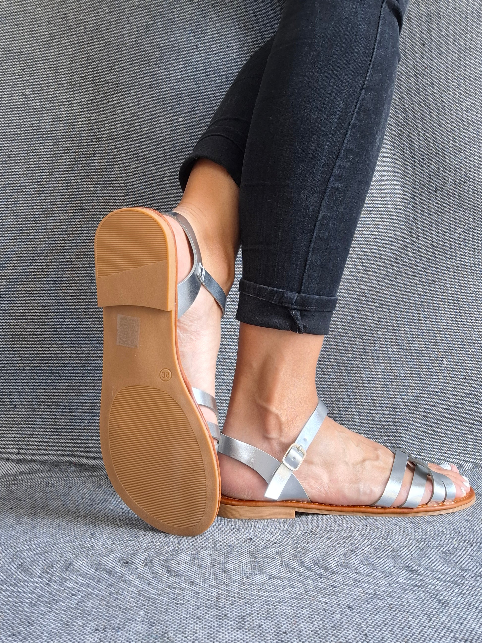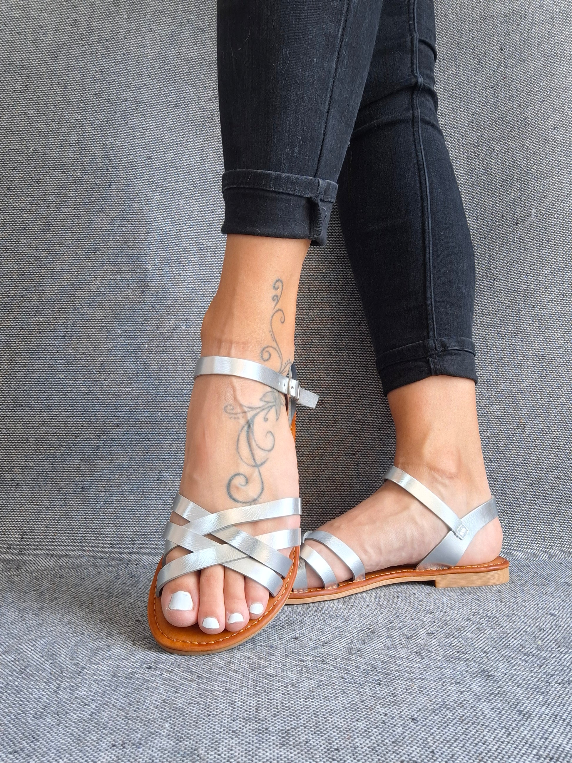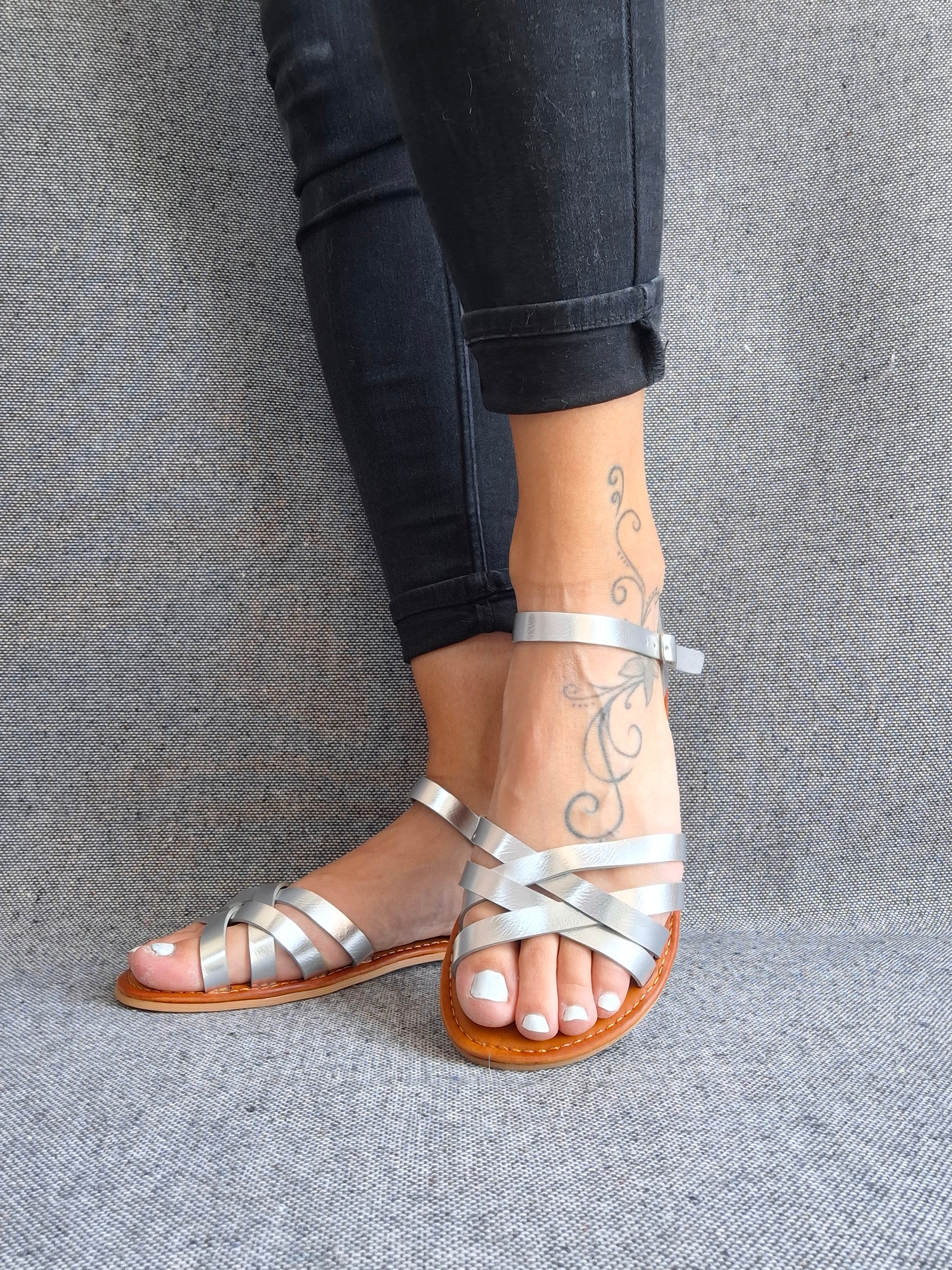 Les sandales présentées sont de couleur argentée avec un design minimaliste et élégant. Les lanières croisées à l'avant ajoutent une touche moderne et sophistiquée. La semelle est plate et de couleur brun clair, offrant un bon contraste avec les lanières argentées. Une petite boucle en métal à fermeture latérale permet d'ajuster les sandales pour un maintien optimal.