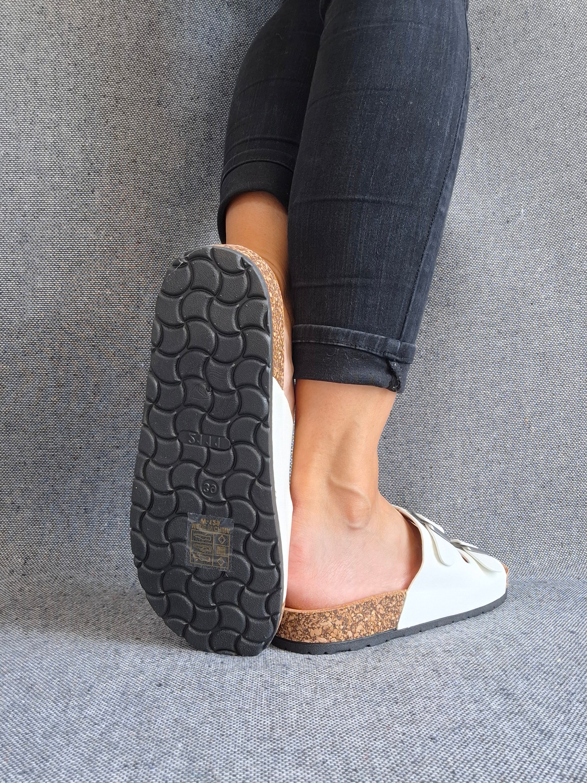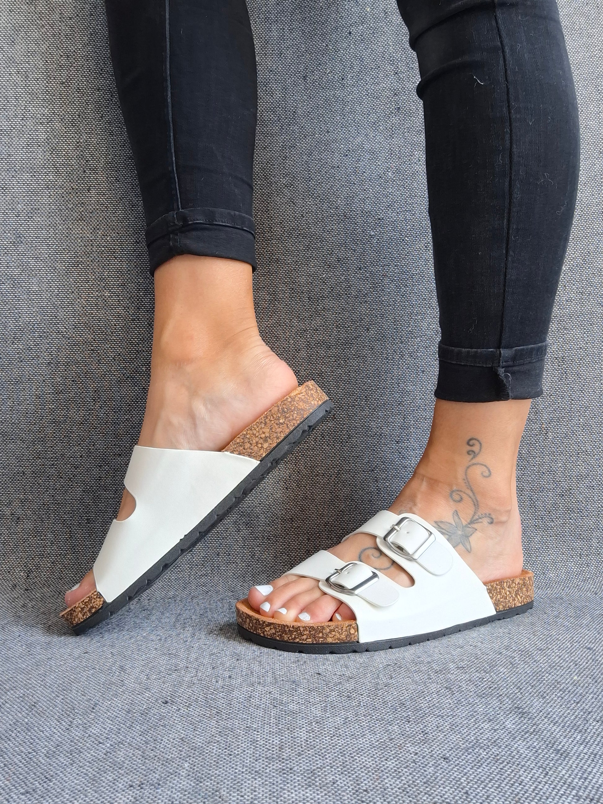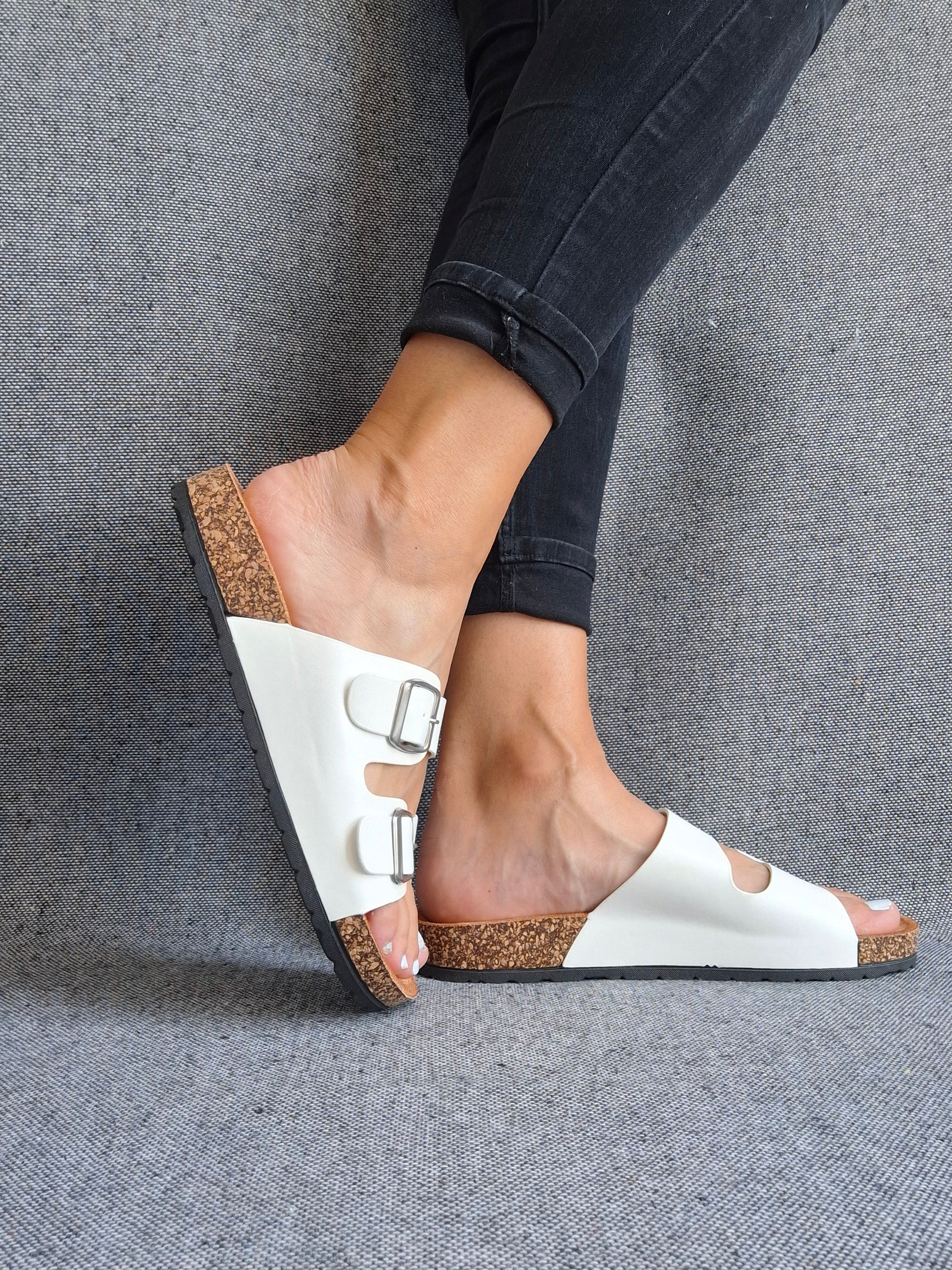 Les sandales sont de couleur blanches avec deux larges brides. Chaque bride est dotée d'une boucle argentée ajustable. La semelle présente une texture mouchetée, renforçant le design moderne de la chaussure. Le bout des sandales est ouvert, permettant une aération optimale.