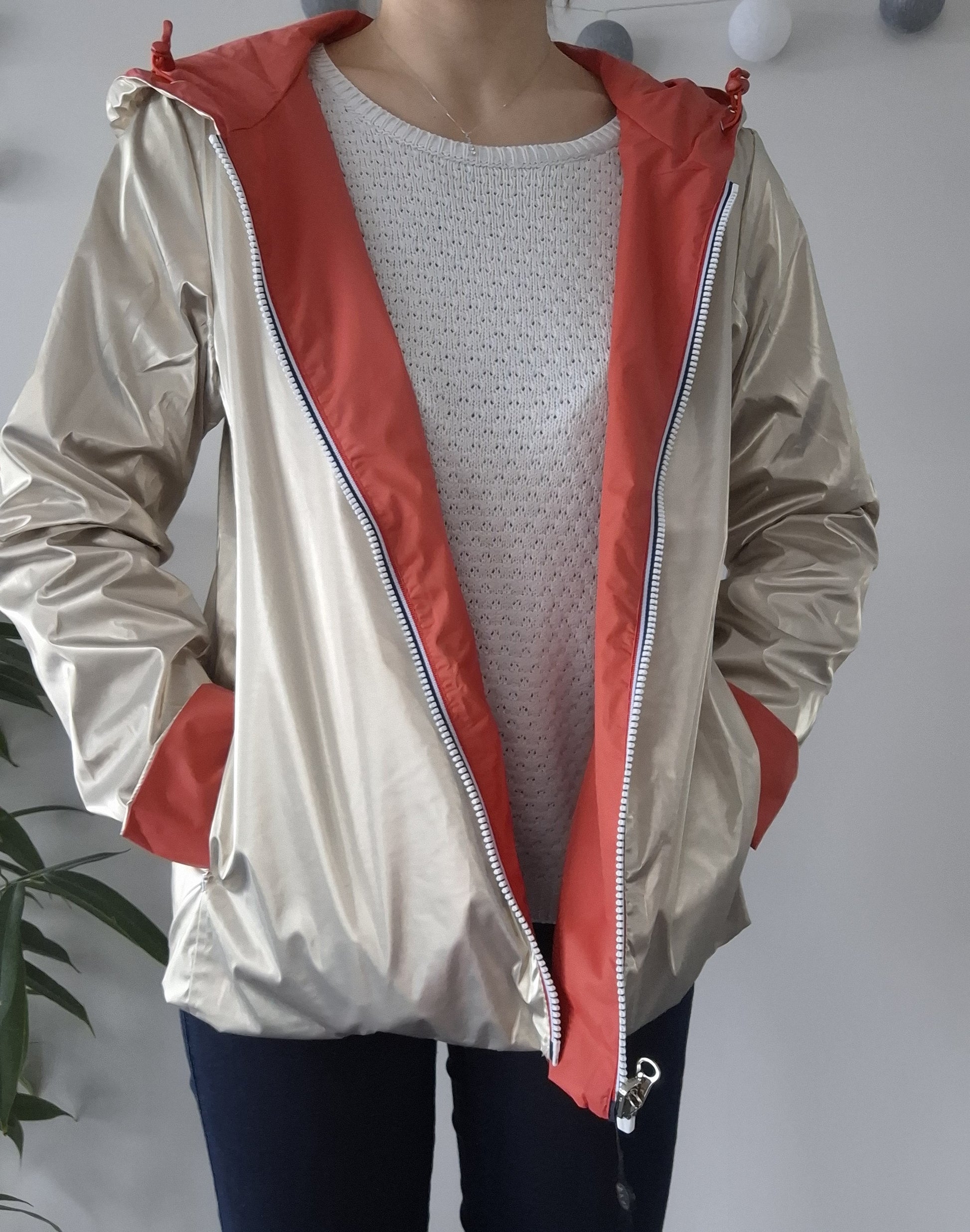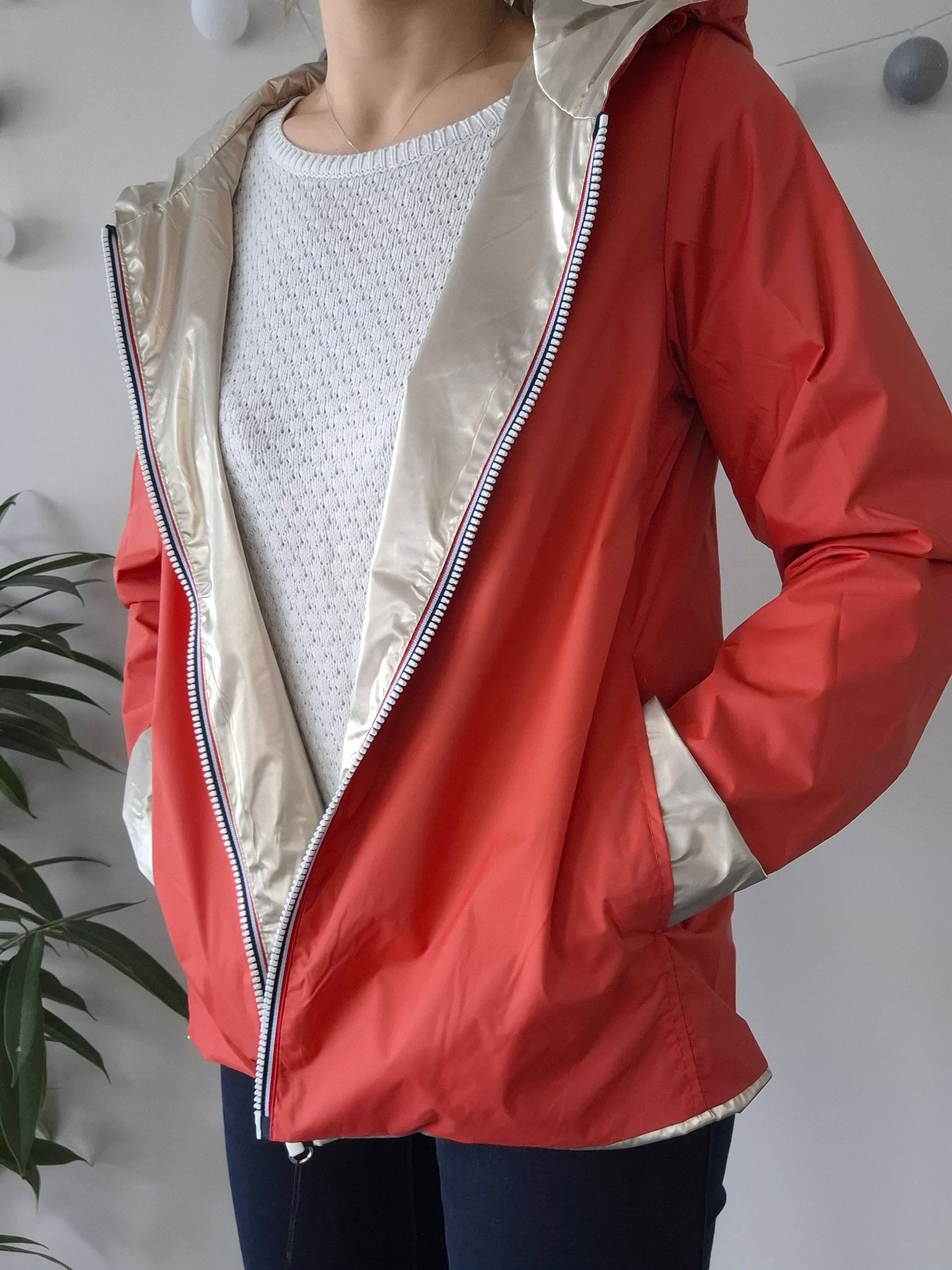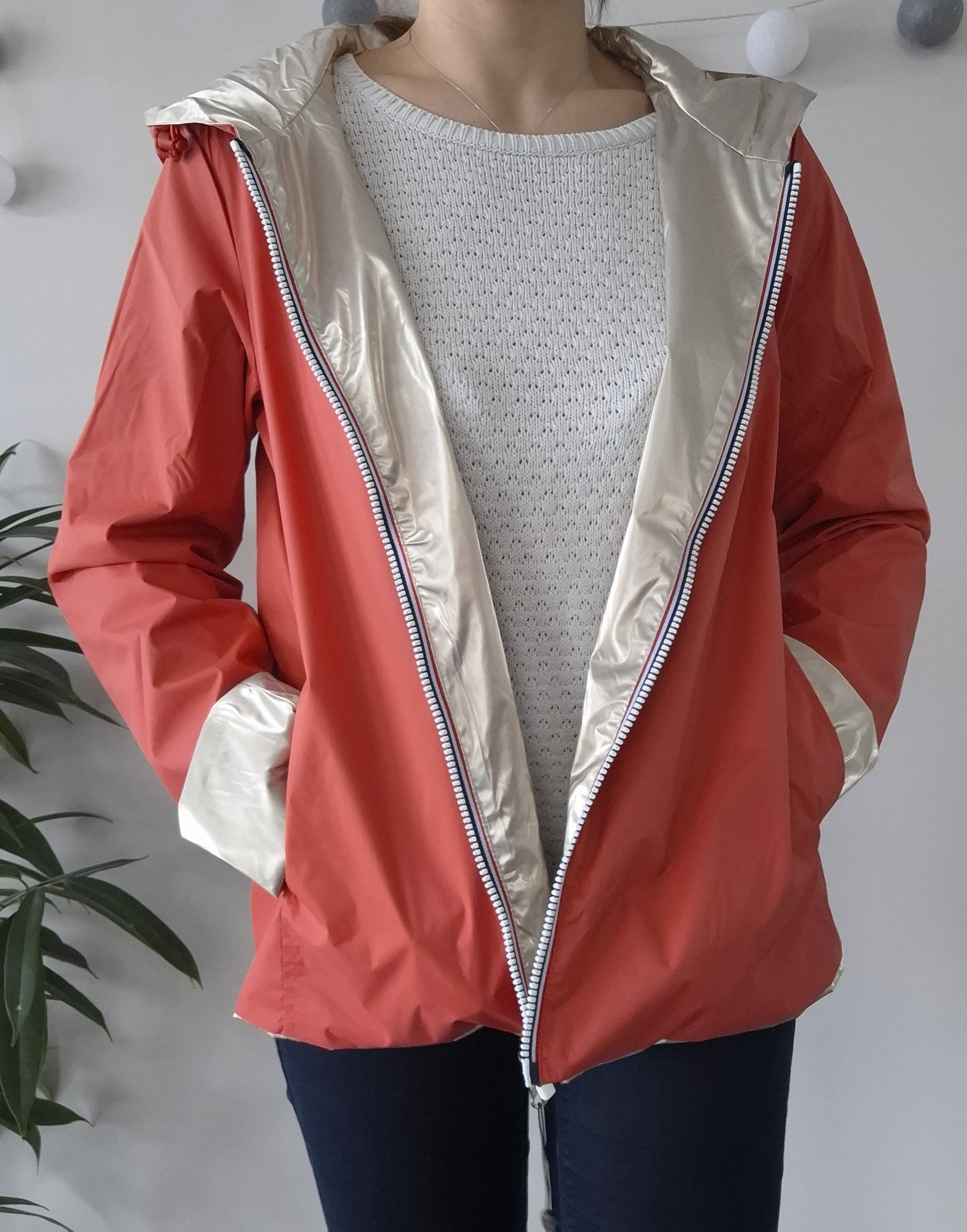 La veste est de couleur corail, offrant un look sobre et élégant. L'intérieur est doté d'une doublure doré, donnant une touche de contraste sophistiquée. Elle est équipée d'une fermeture éclair sur toute la longueur, ce qui la rend facile à mettre et à enlever.