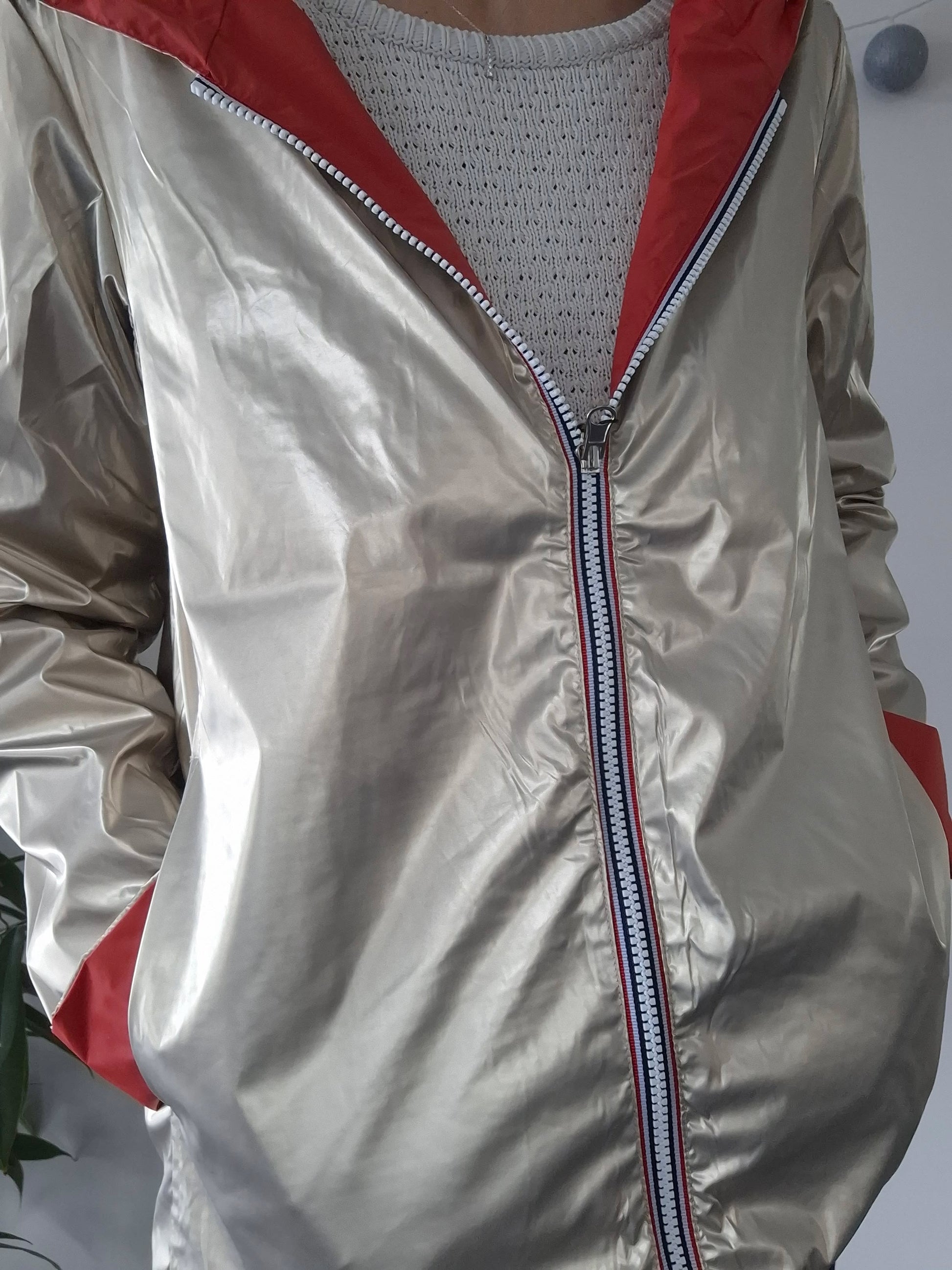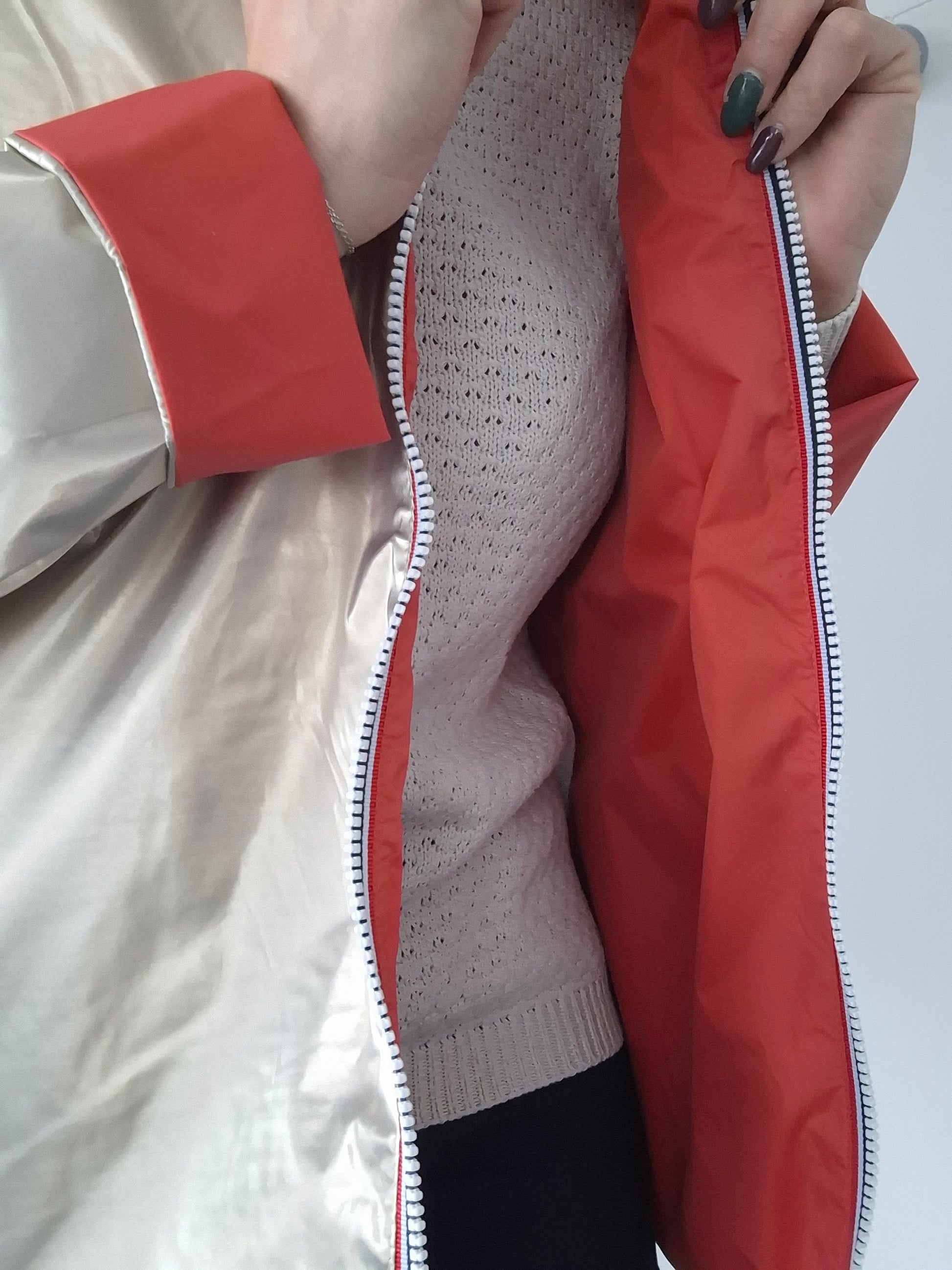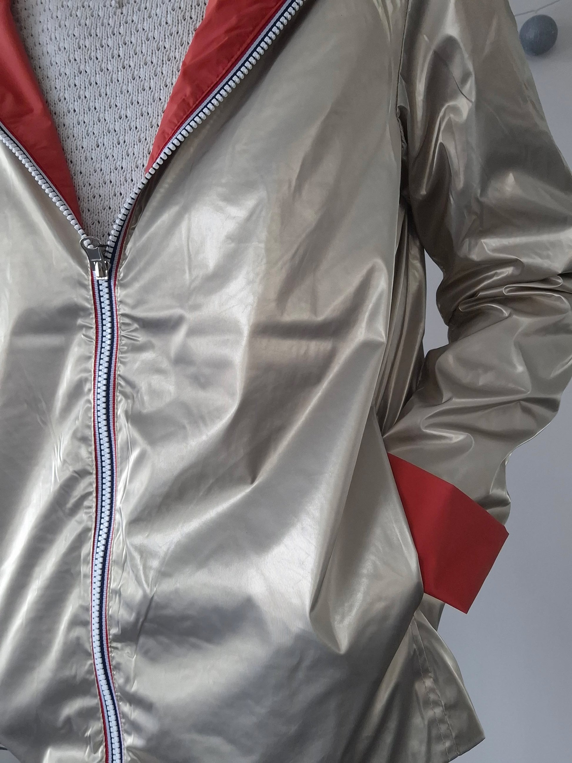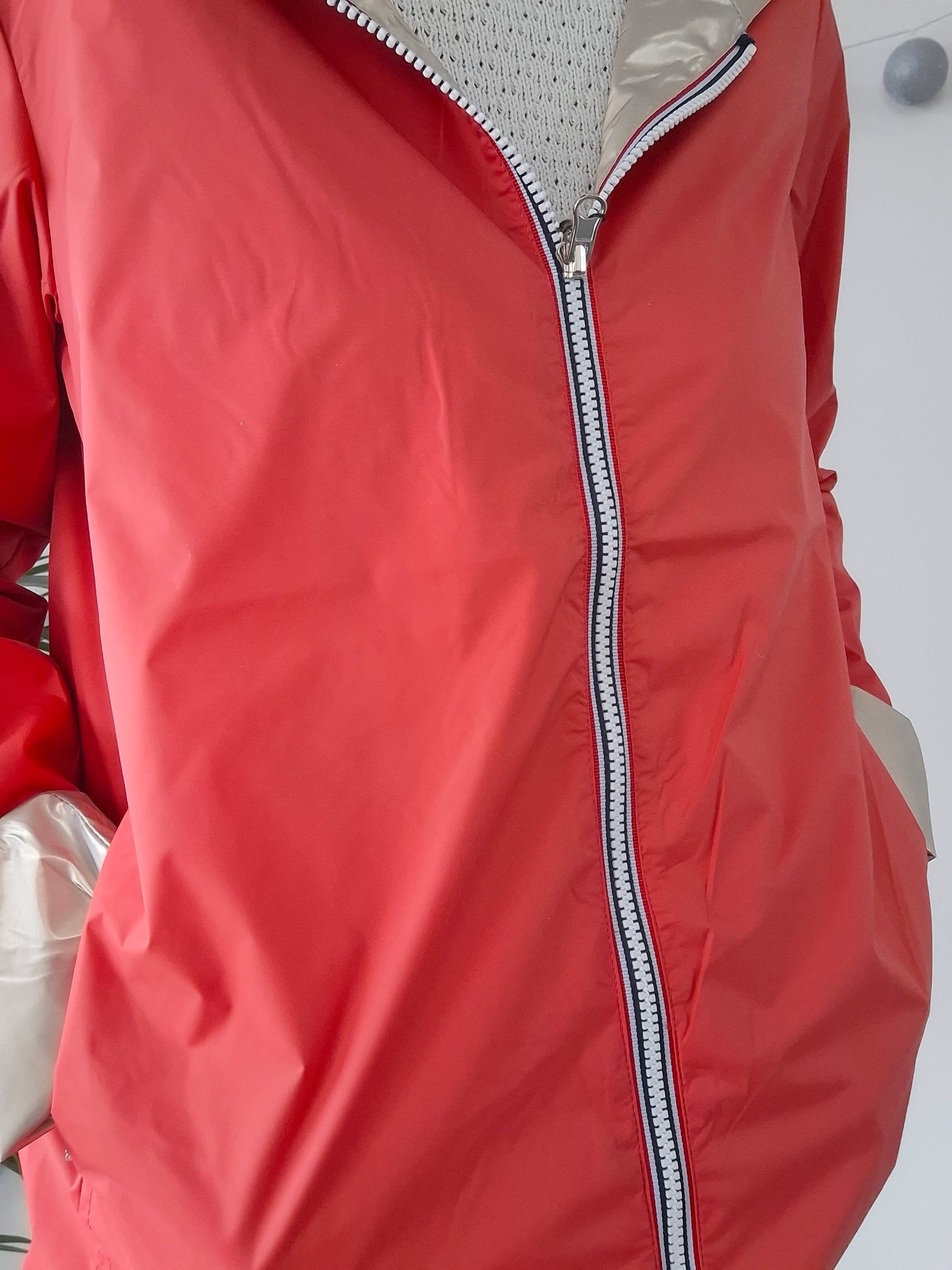 La veste est de couleur corail, offrant un look sobre et élégant. L'intérieur est doté d'une doublure doré, donnant une touche de contraste sophistiquée. Elle est équipée d'une fermeture éclair sur toute la longueur, ce qui la rend facile à mettre et à enlever.