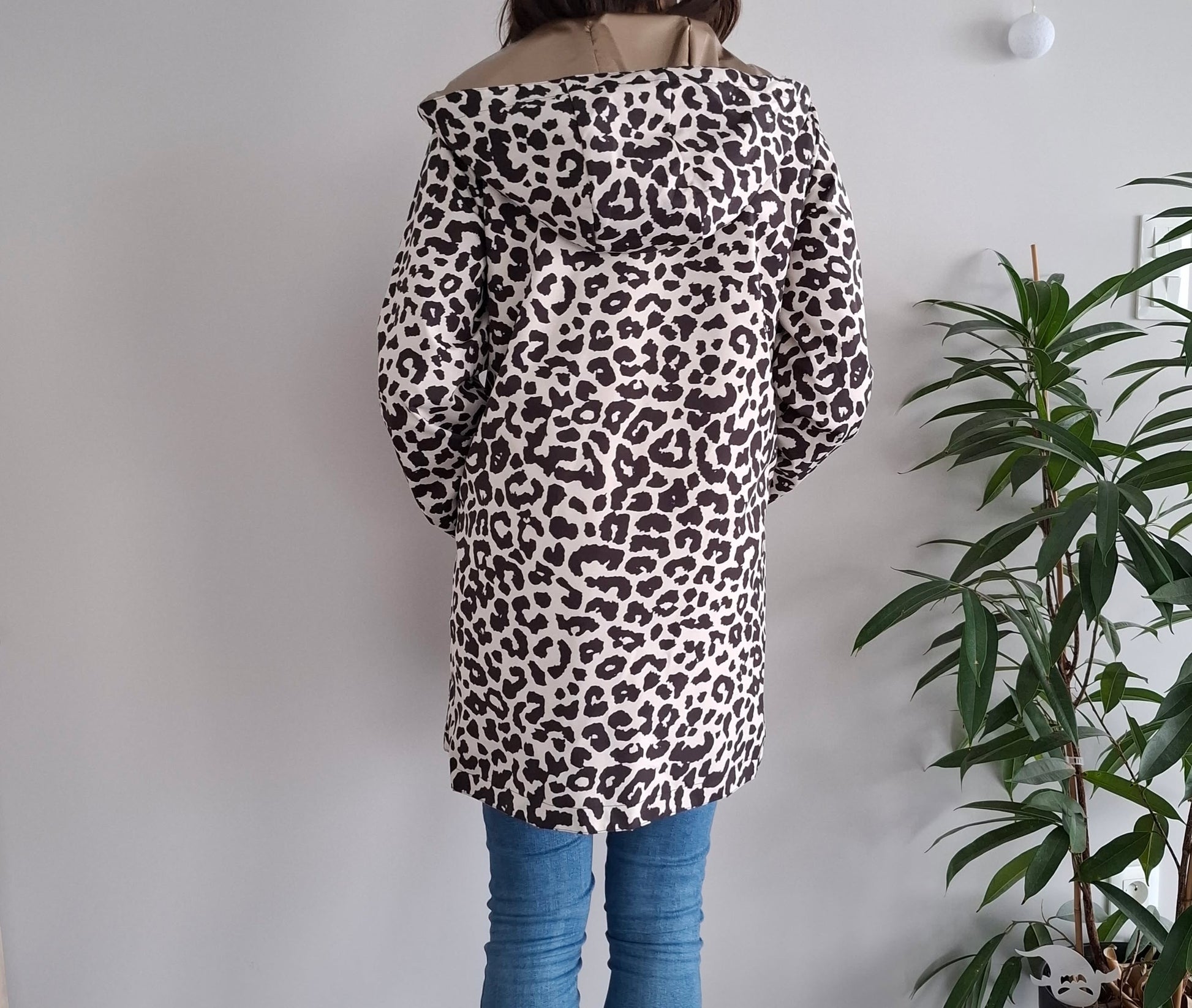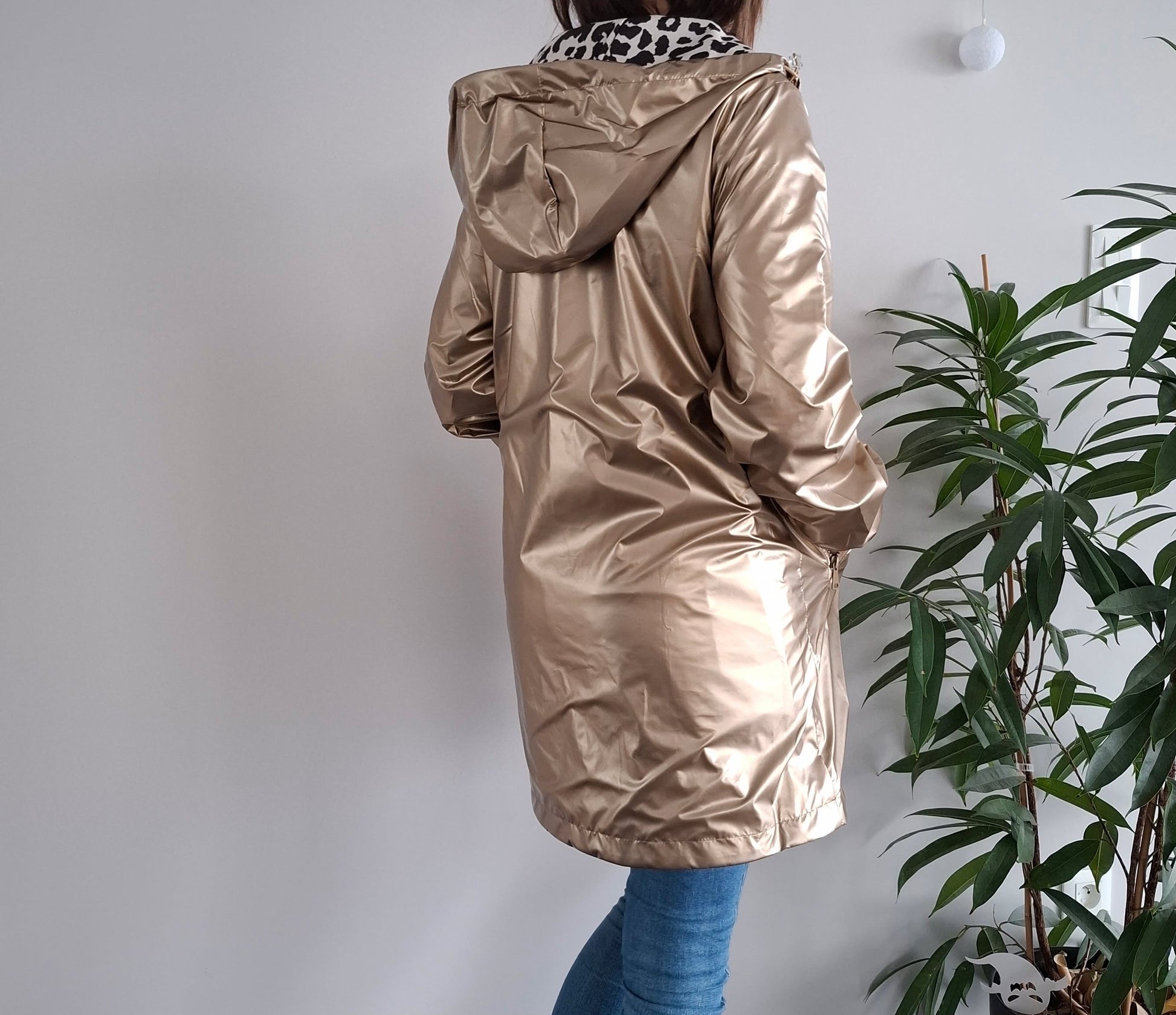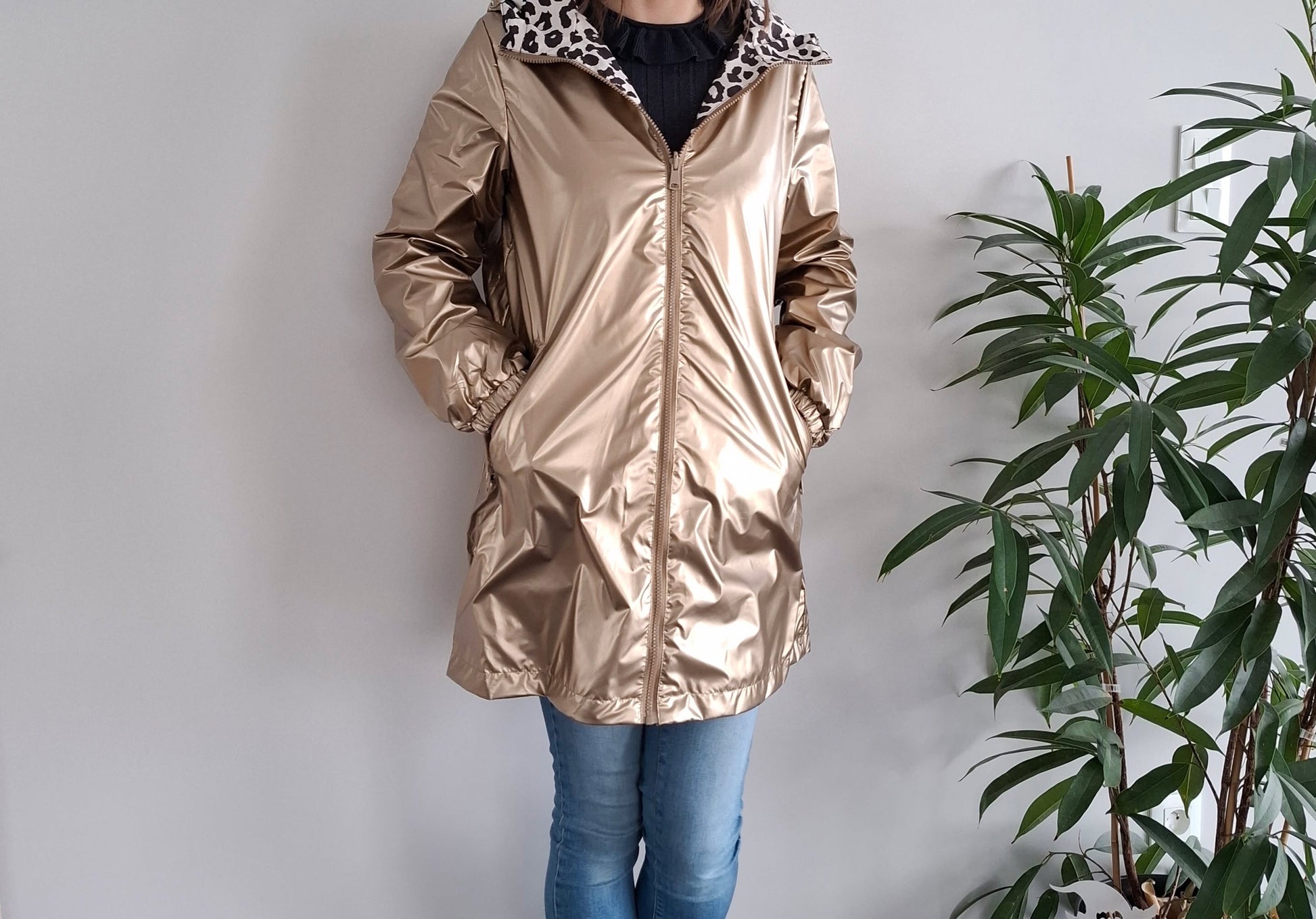 Le manteau est sans ouate, il présente un design réversible avec une face dorée brillante et une face avec un motif léopard distinctif. Il est doté d'une capuche pratique, idéale pour les jours de pluie. Les manches longues se terminent par des poignets élastiqués, offrant une bonne protection contre le vent. La fermeture zippée centrale permet de le mettre et de l'enlever facilement. Les poches latérales zippées sur le côté noir ajoutent à la fois style et fonctionnalité. Le côté léopard présente un look audacieux et tendance, parfait pour faire une déclaration de mode.