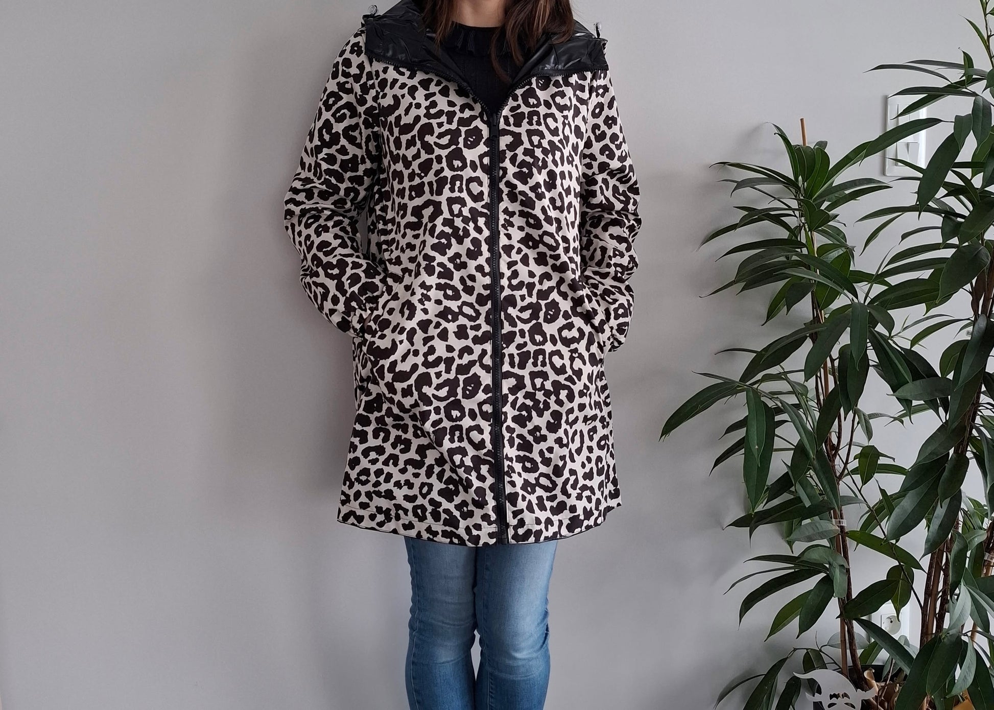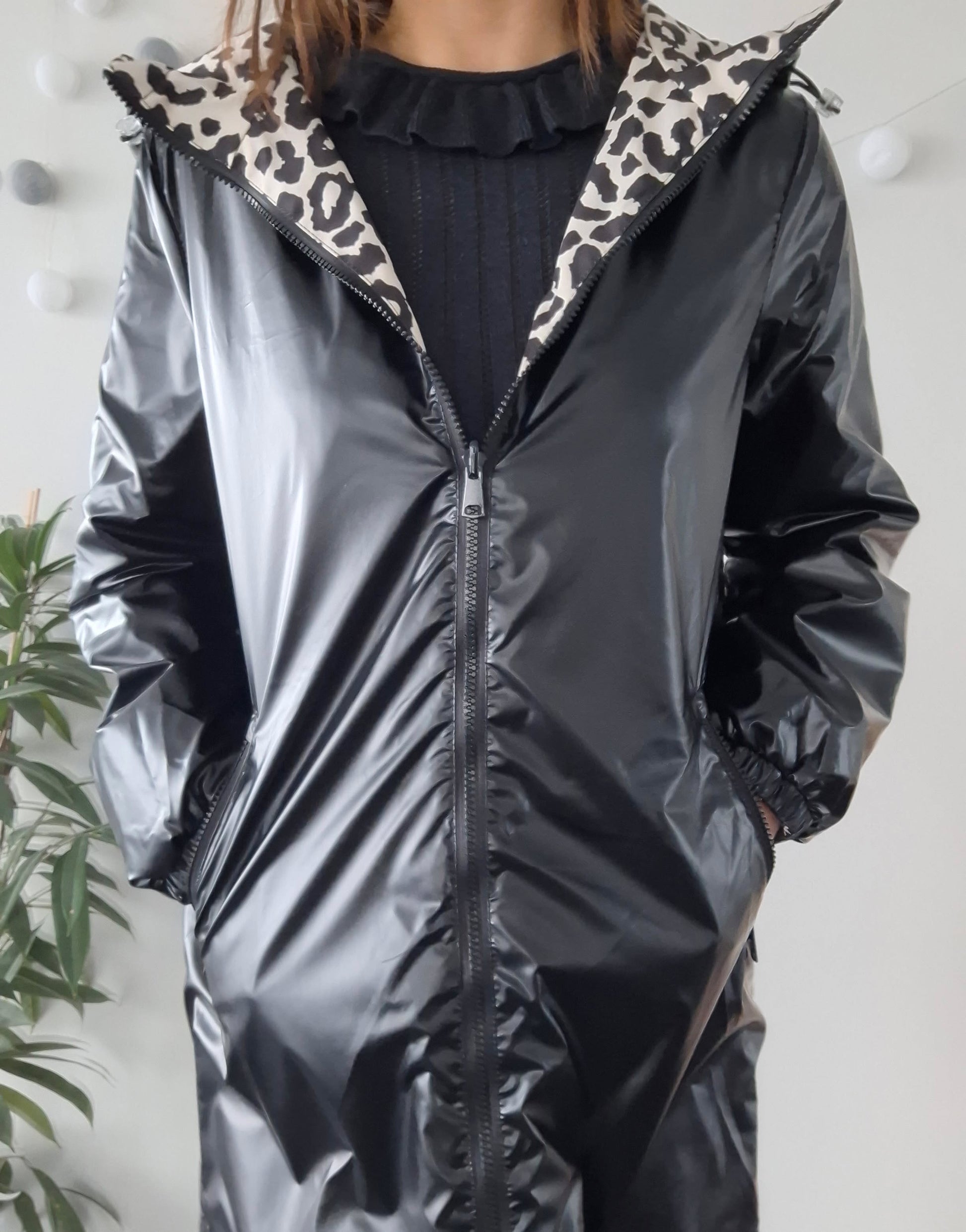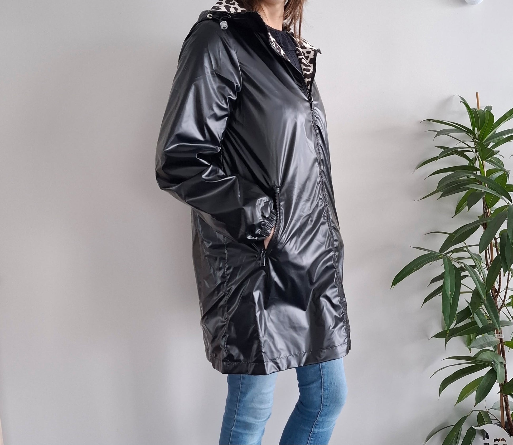 Le manteau est sans ouate, il présente un design réversible avec une face noire brillante et une face avec un motif léopard distinctif. Il est doté d'une capuche pratique, idéale pour les jours de pluie. Les manches longues se terminent par des poignets élastiqués, offrant une bonne protection contre le vent. La fermeture zippée centrale permet de le mettre et de l'enlever facilement. Les poches latérales zippées sur le côté noir ajoutent à la fois style et fonctionnalité. Le côté léopard présente un look audacieux et tendance, parfait pour faire une déclaration de mode.