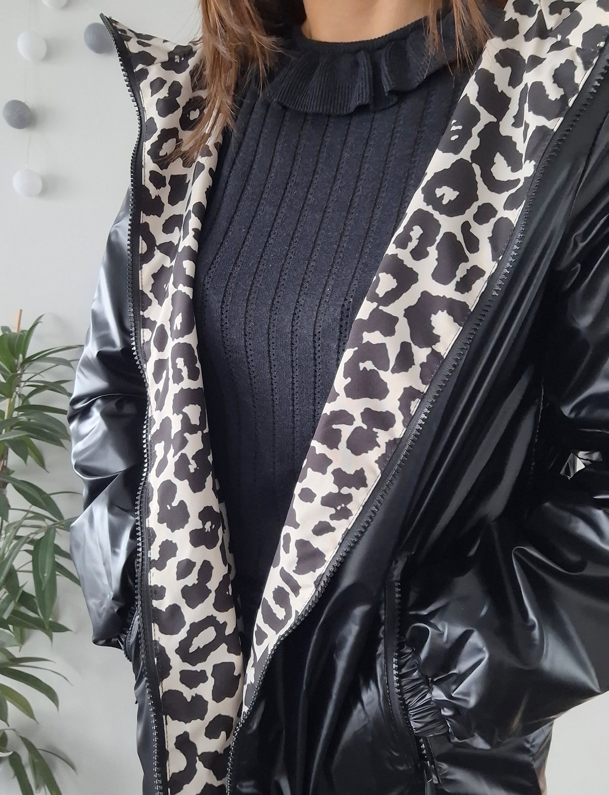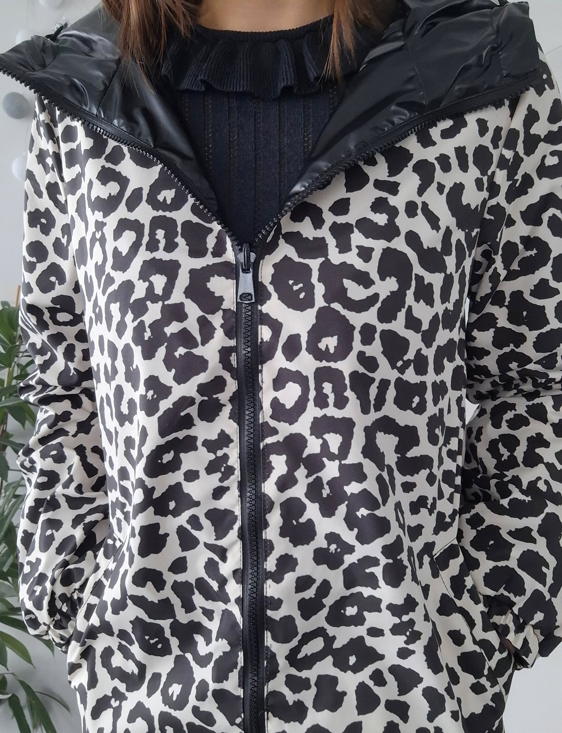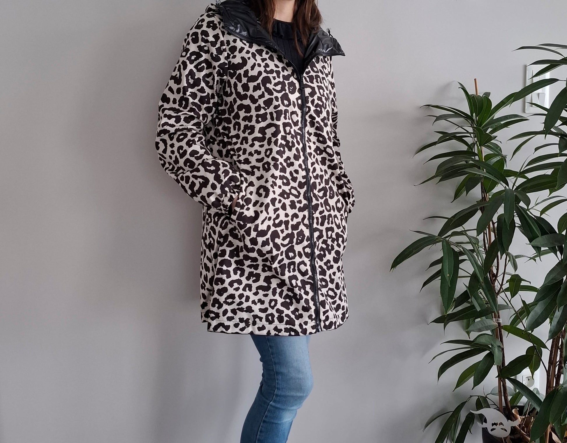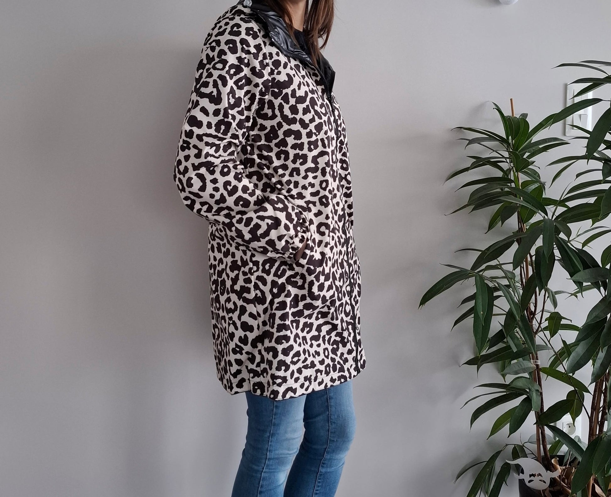 Le manteau est sans ouate, il présente un design réversible avec une face noire brillante et une face avec un motif léopard distinctif. Il est doté d'une capuche pratique, idéale pour les jours de pluie. Les manches longues se terminent par des poignets élastiqués, offrant une bonne protection contre le vent. La fermeture zippée centrale permet de le mettre et de l'enlever facilement. Les poches latérales zippées sur le côté noir ajoutent à la fois style et fonctionnalité. Le côté léopard présente un look audacieux et tendance, parfait pour faire une déclaration de mode.