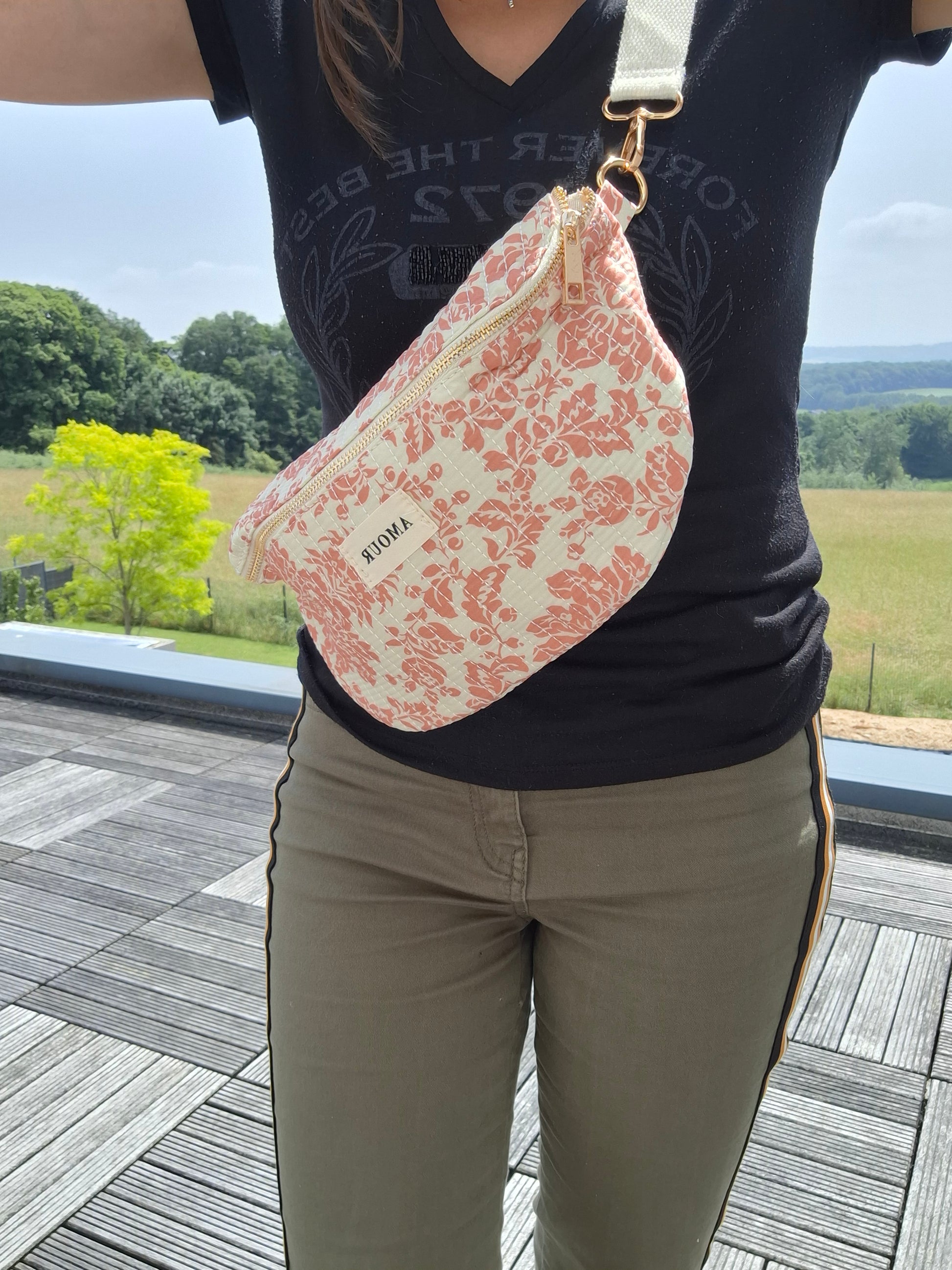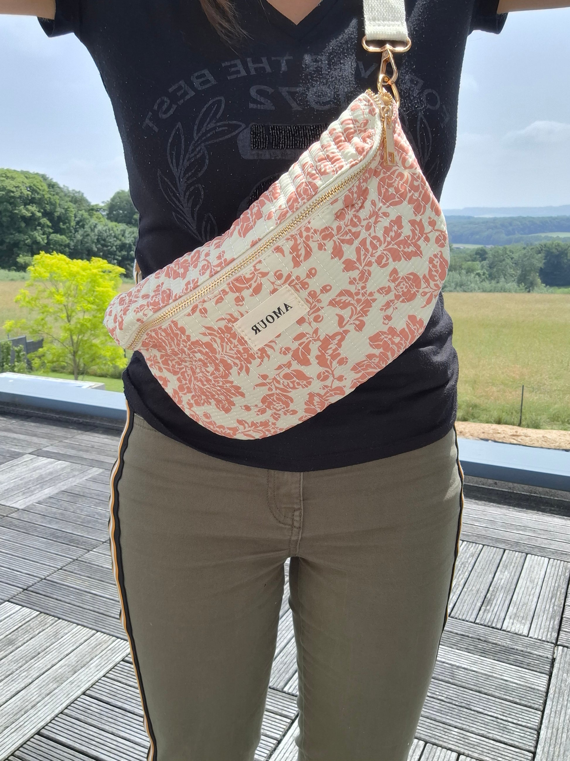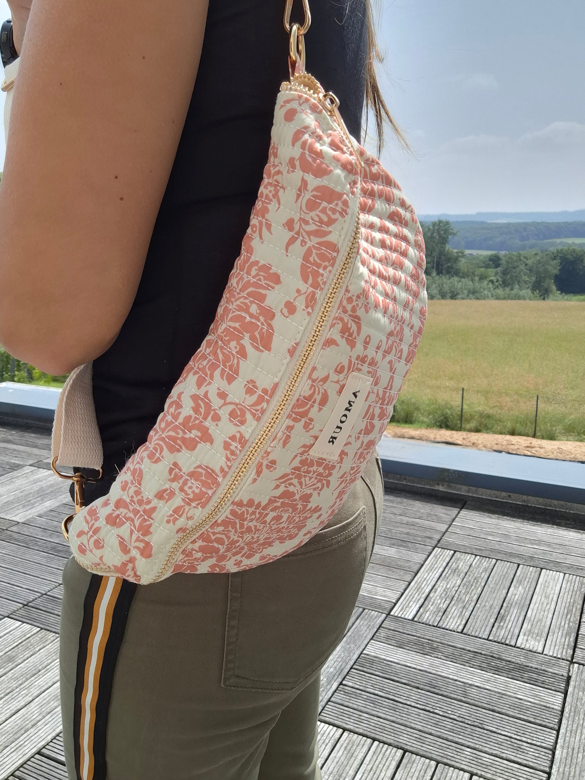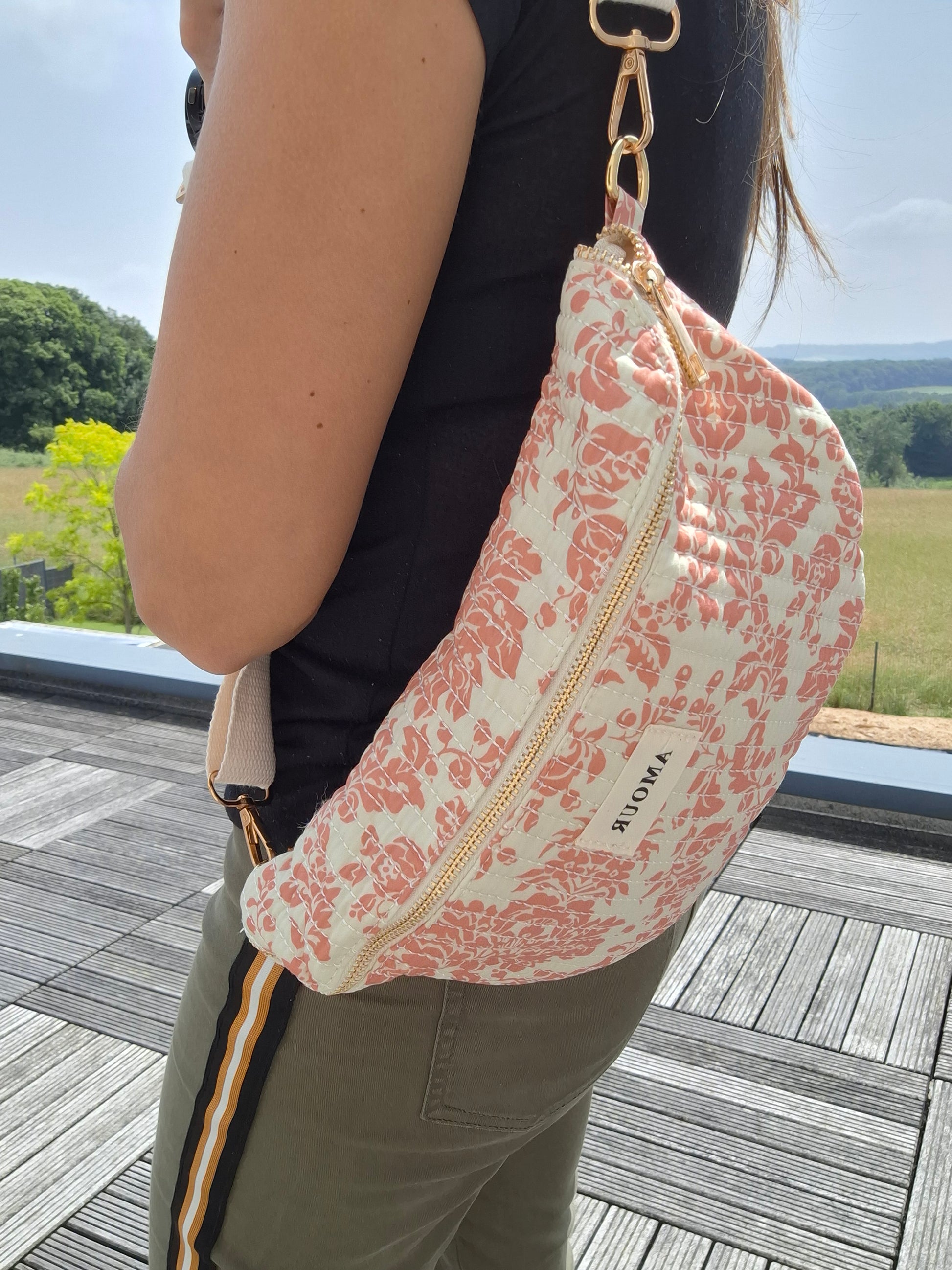 Sac banane coton matelassé blanc liberty fleuri corail creme