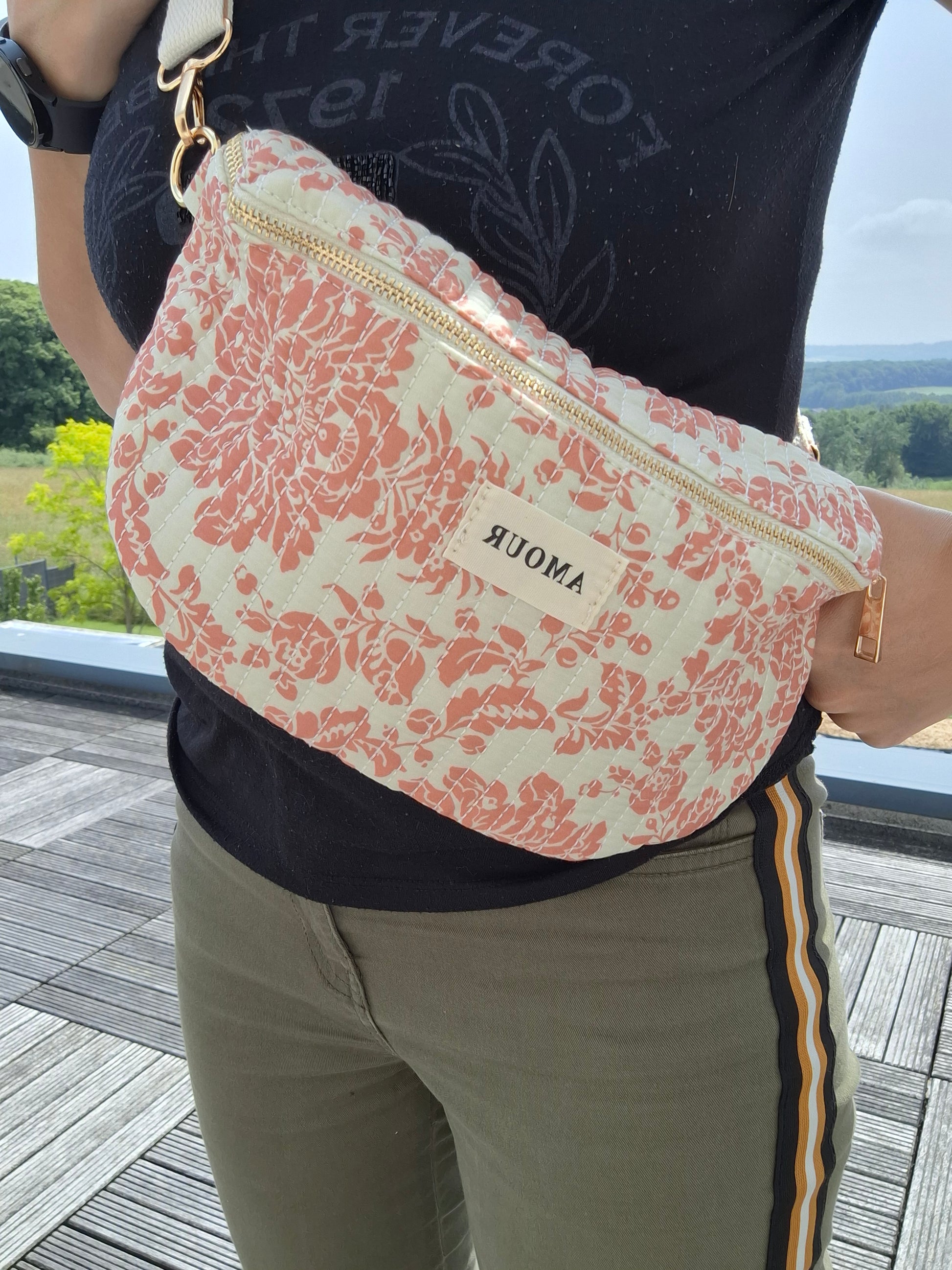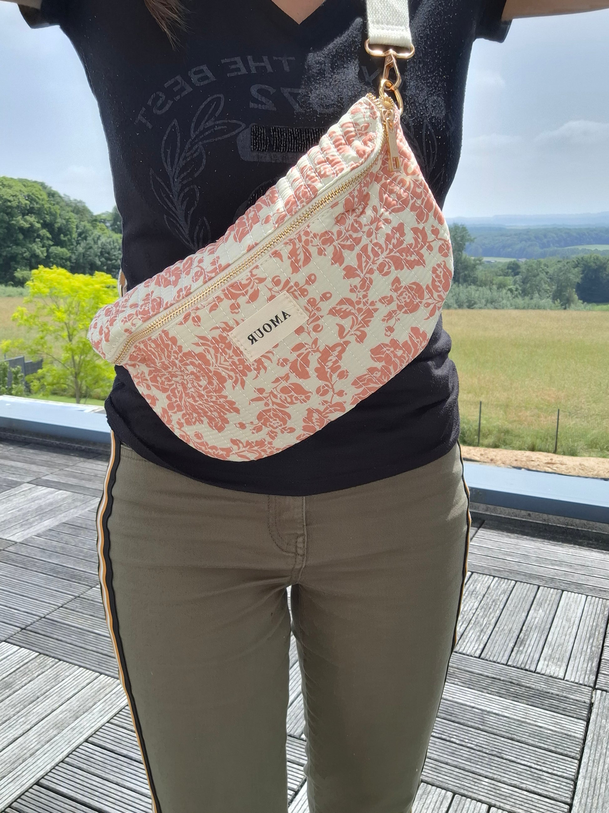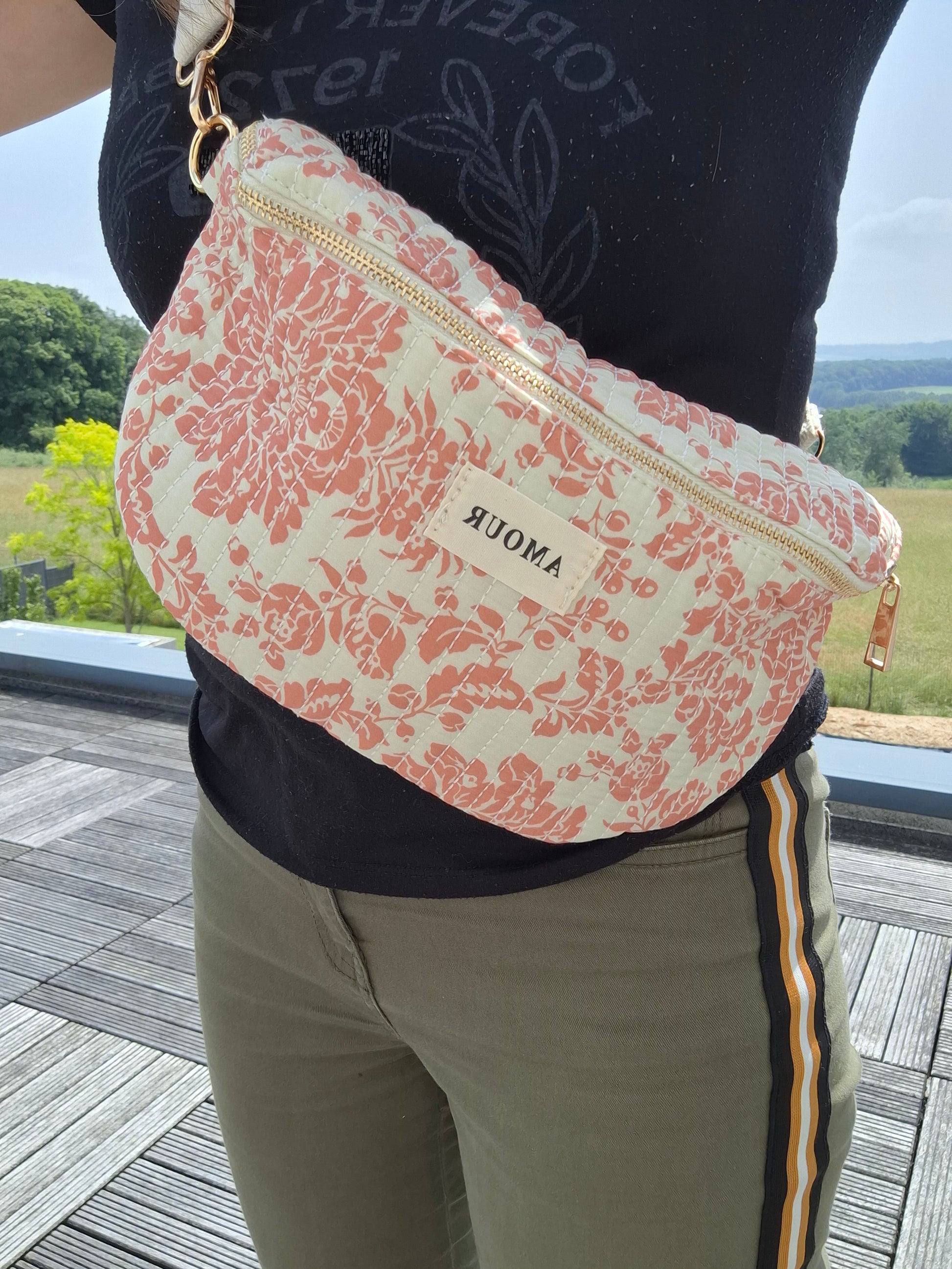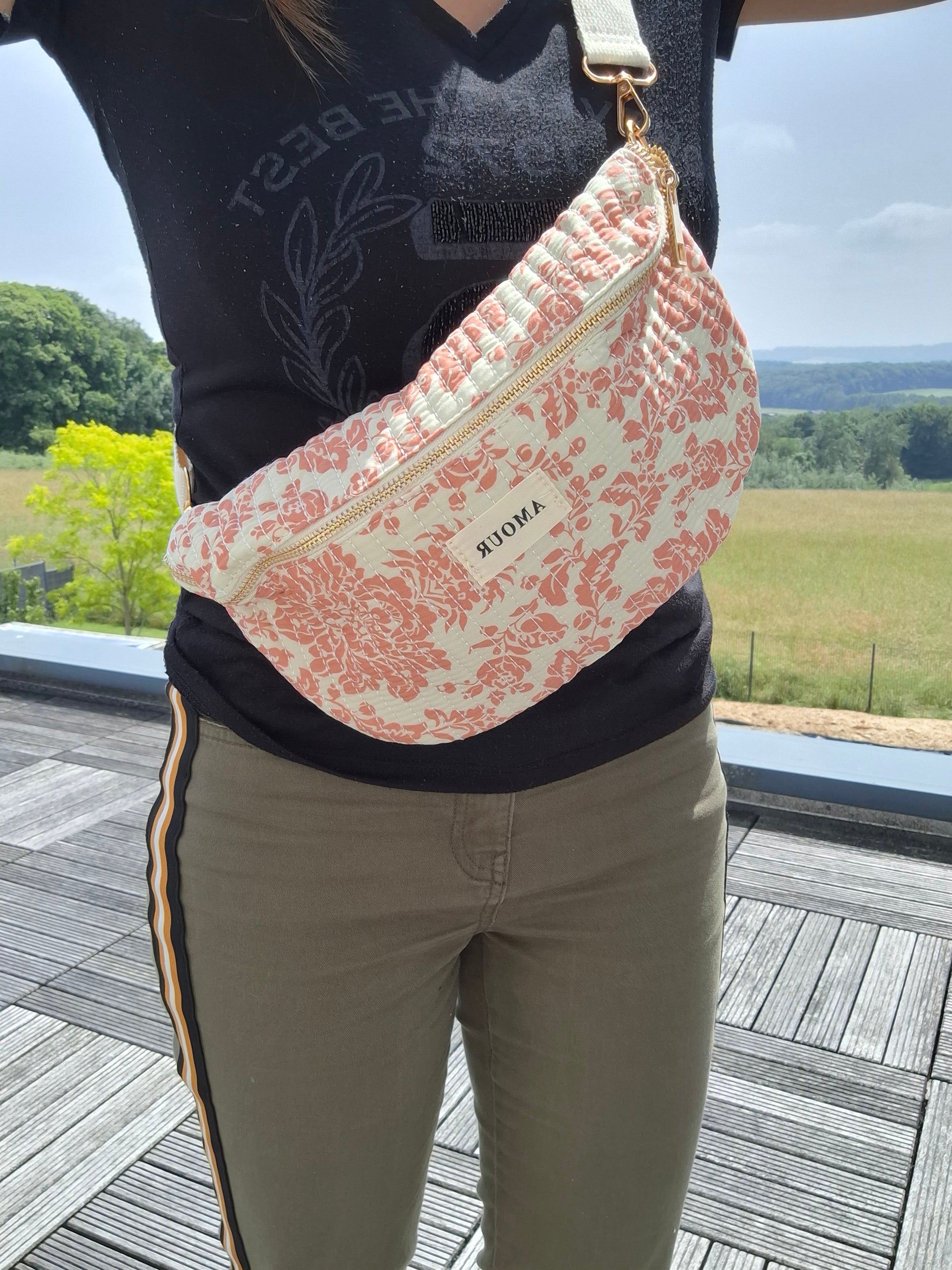 Sac banane coton matelassé blanc liberty fleuri corail creme