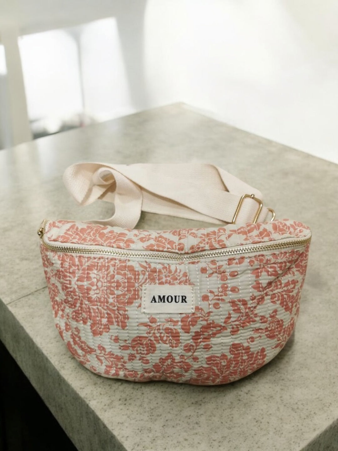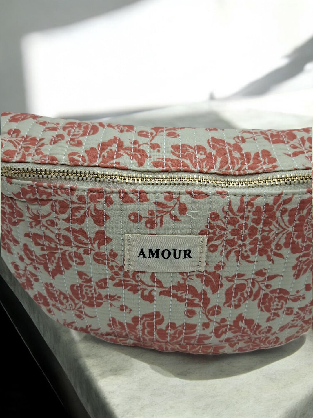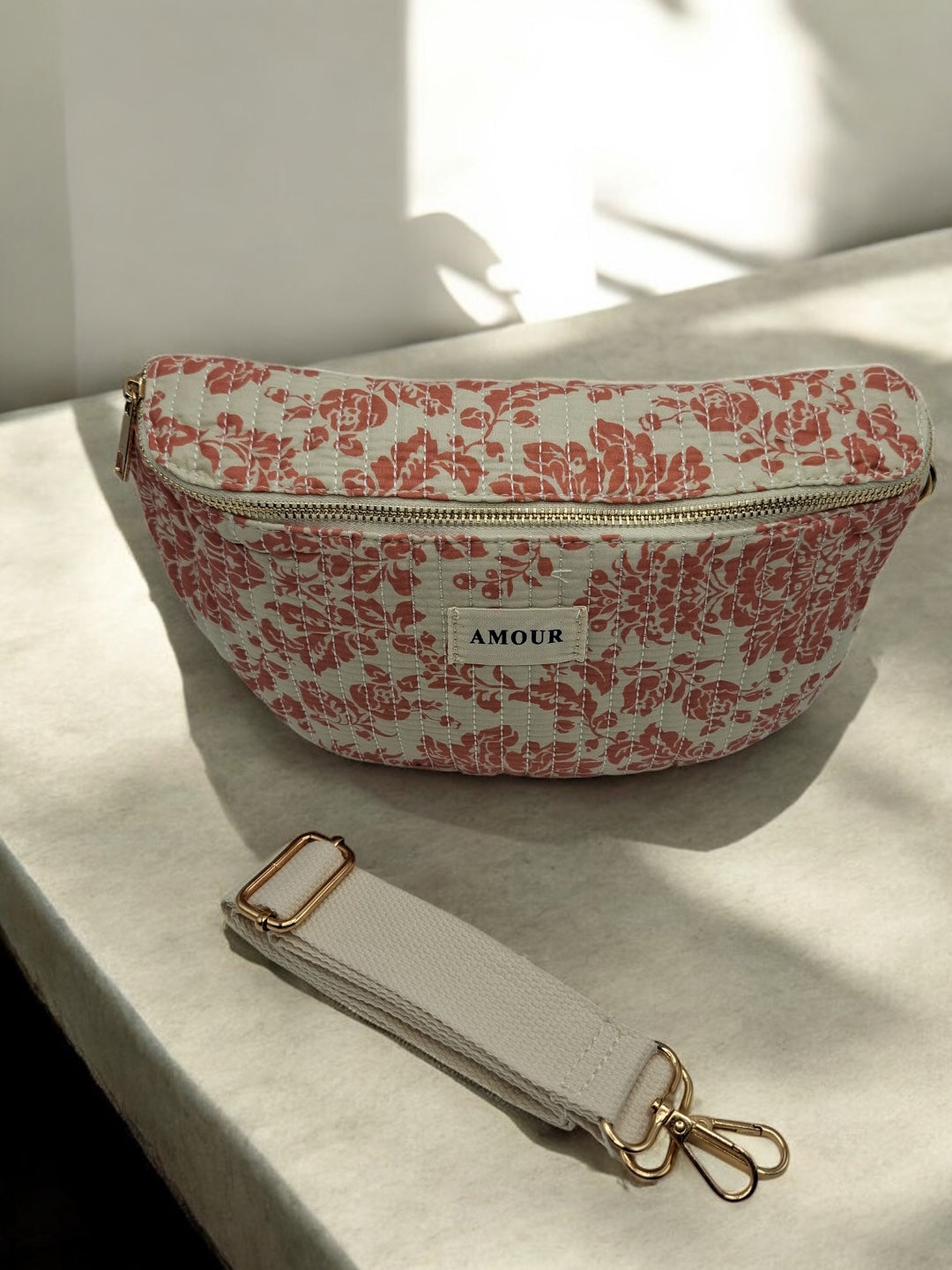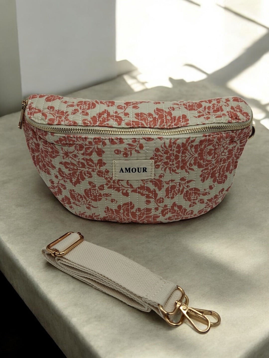 Ce sac banane présente un motif floral délicat en corail sur un fond blanc. Il est équipé d'une fermeture éclair dorée qui ajoute une touche élégante. Une étiquette centrale avec le mot "Amour" est cousue à l'avant.