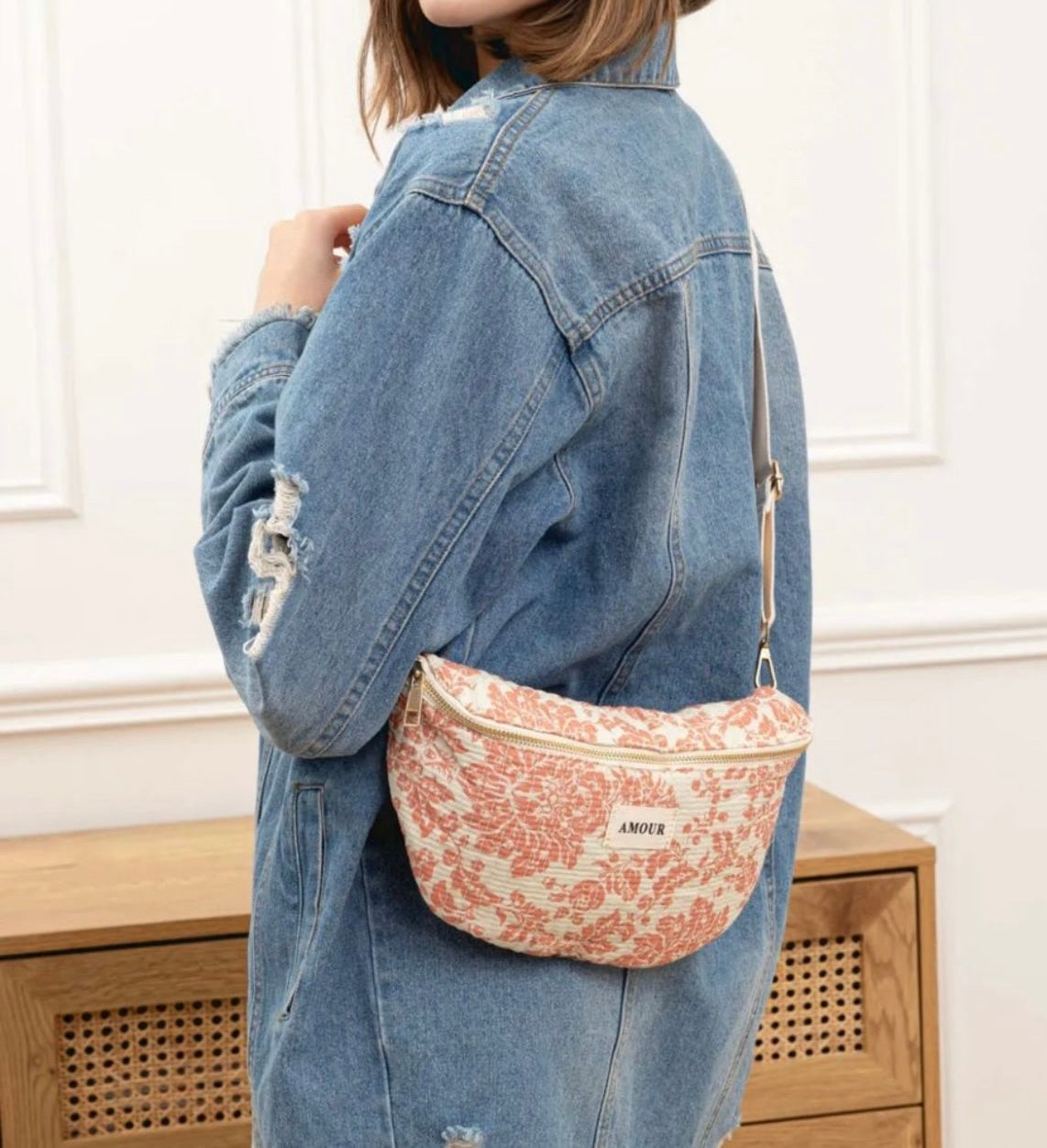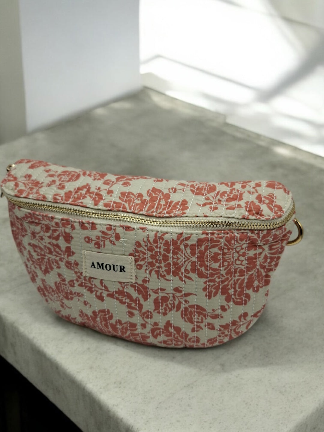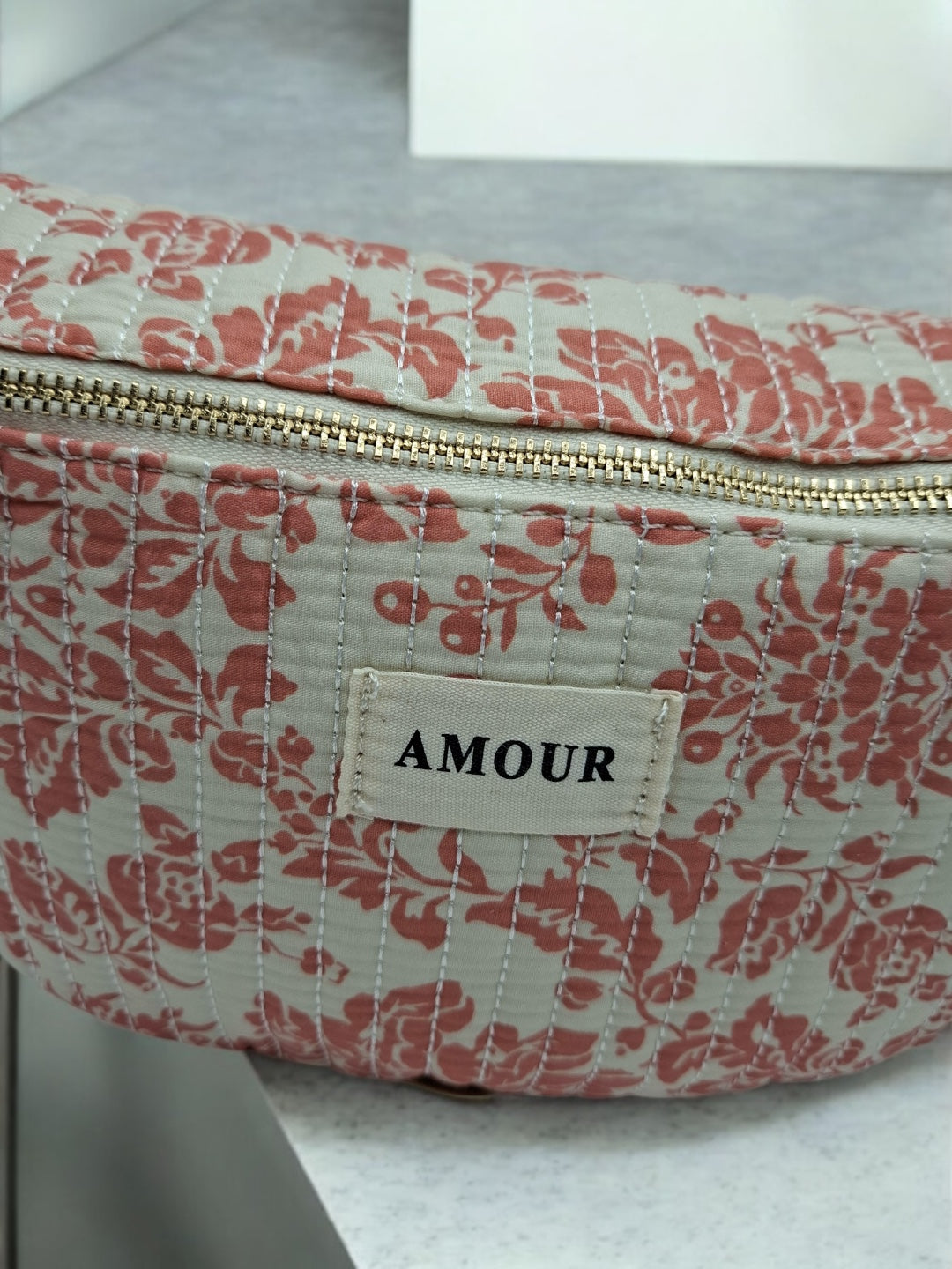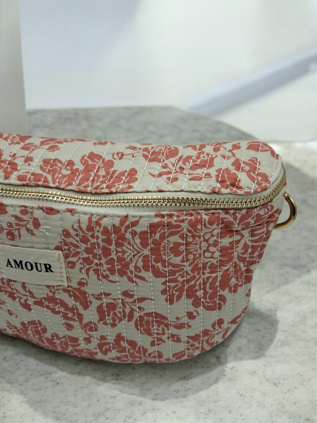 Ce sac banane présente un motif floral délicat en corail sur un fond blanc. Il est équipé d'une fermeture éclair dorée qui ajoute une touche élégante. Une étiquette centrale avec le mot "Amour" est cousue à l'avant.