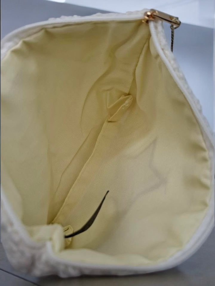 Cette pochette arbore une couleur blanche texturée, ajoutant une dimension tactile et esthétique. Au centre, une étoile marron contraste merveilleusement, servant de point focal. La pochette est accompagnée d'une fermeture éclair ornée de deux glands dorés pour un détail raffiné.