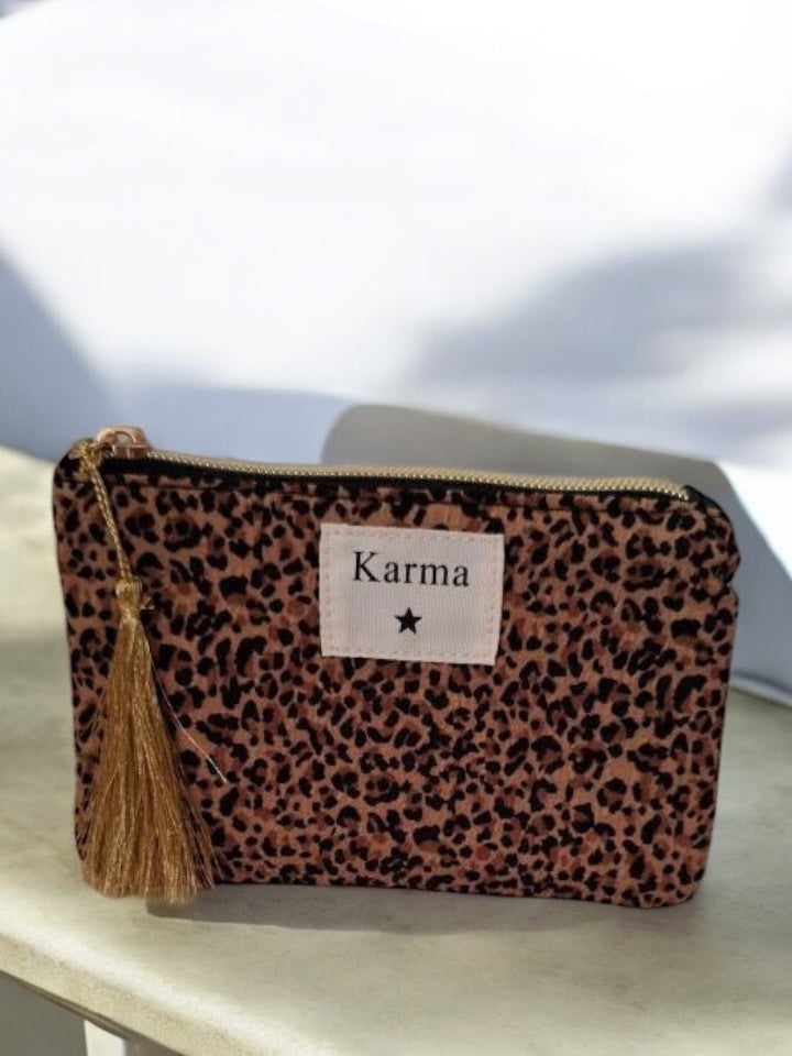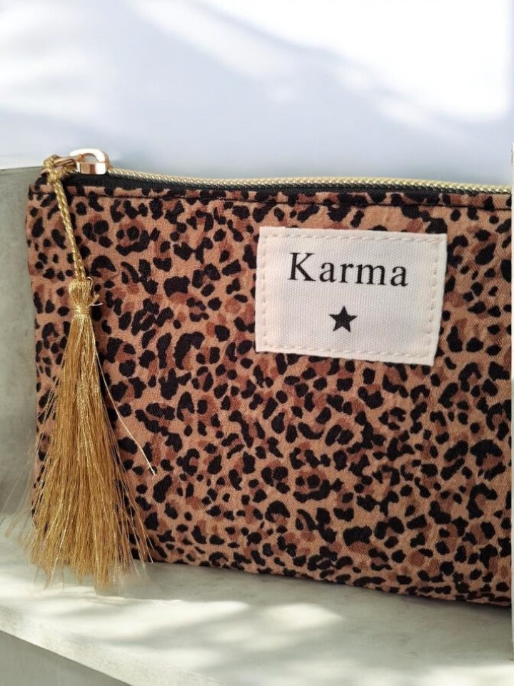 La pochette présente un motif léopard camel distinctif qui ajoute une touche audacieuse. Le fermoir est en métal doré, offrant une touche d'élégance et de solidité. Un pompon doré pend élégamment du côté, ajoutant un flair supplémentaire au design. L'étiquette "Karma" est cousue sur le devant, accompagnée d'une petite étoile noire qui complète le look.