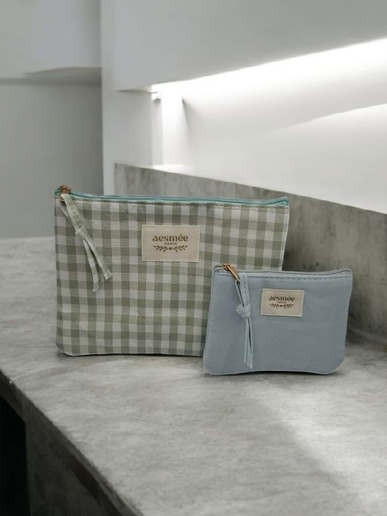 Pochette et trousse en coton vichy motifs à carreaux vert d'eau beige