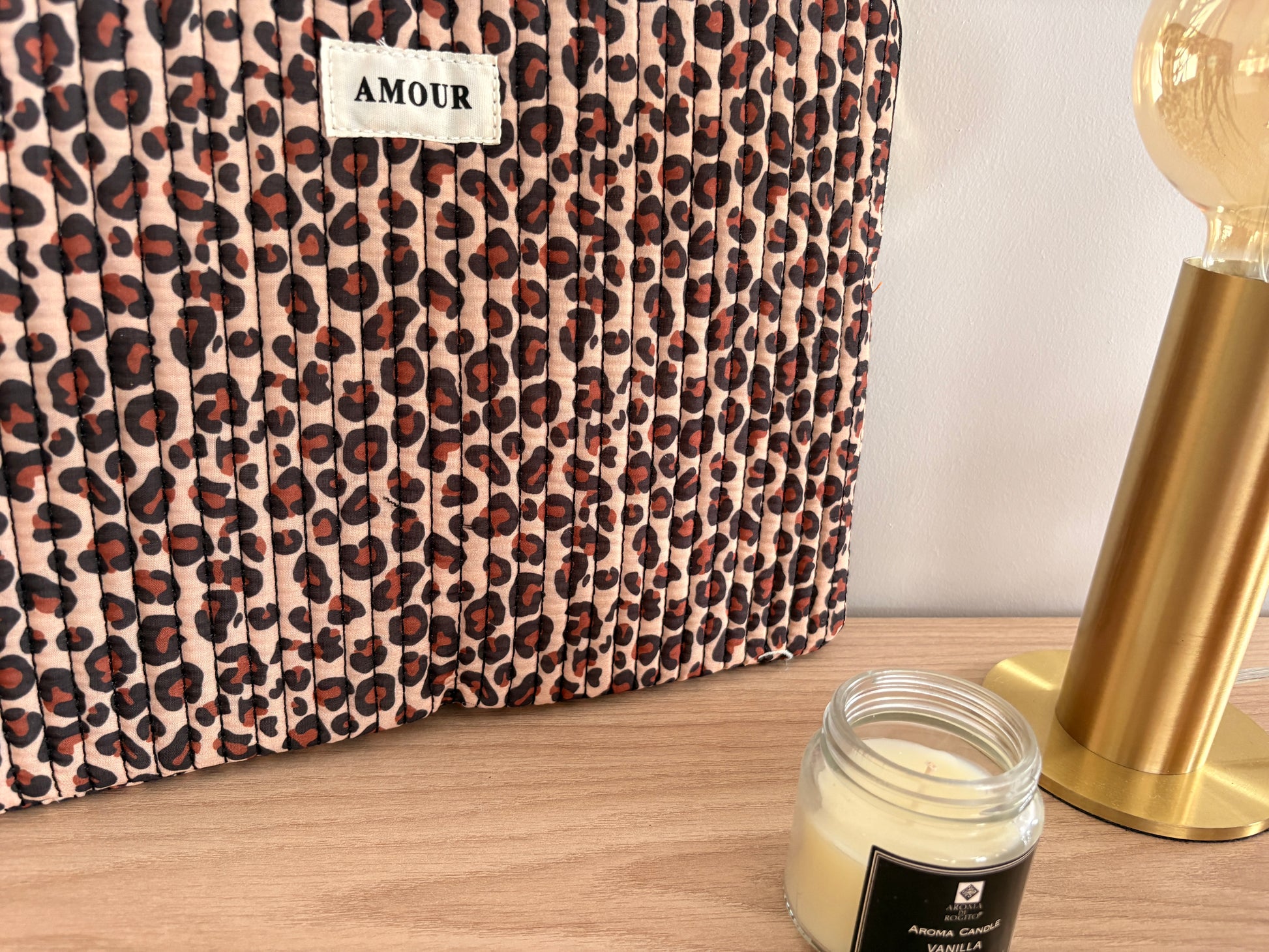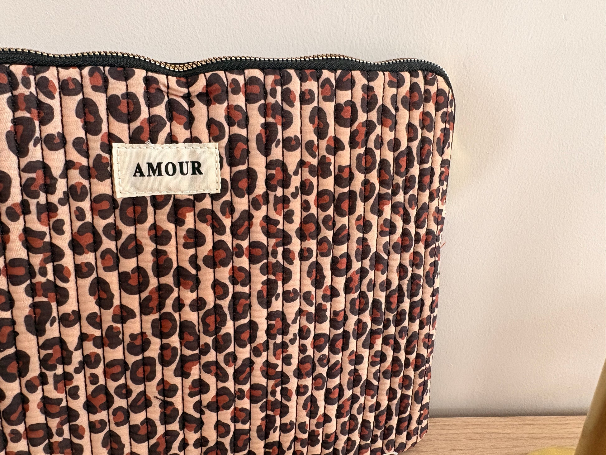 Pochette housse pour ordinateur en coton matelassé beige taupe motifs léopard couleur Noir et marron