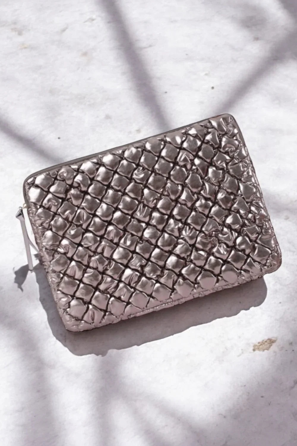 La pochette est de couleur argentée avec un design matelassé distinctif.