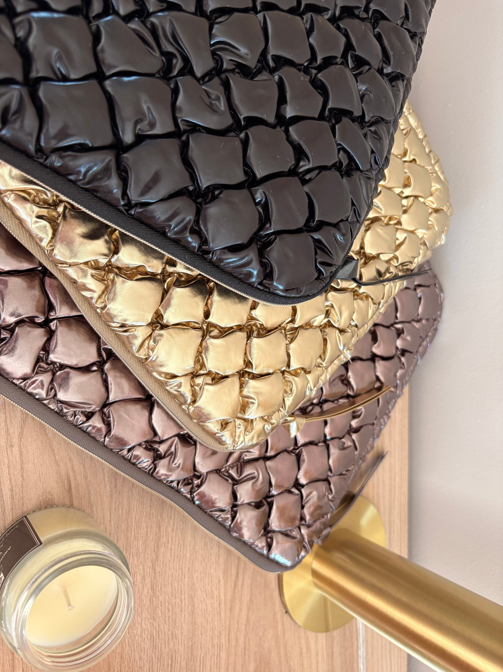 La texture du matelassage crée un motif en relief accrocheur qui se répète sur toute la surface de la pochette.