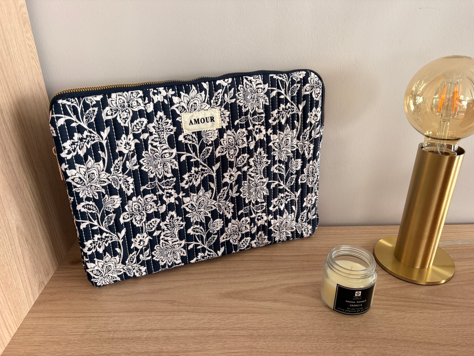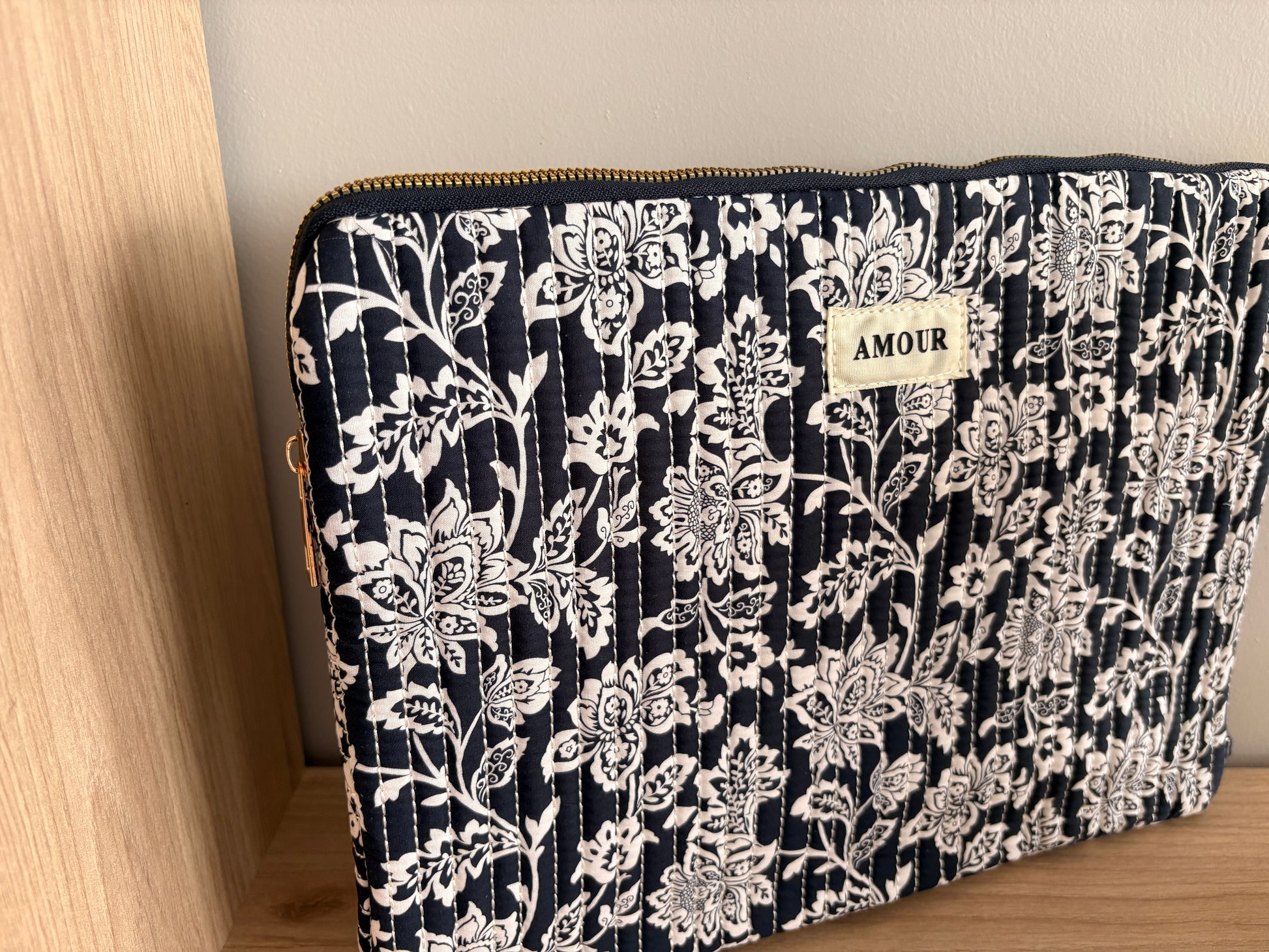 La pochette présente un motif floral d'un blanc élégant sur un fond bleu profond. La marque "Amour" est imprimée sur une étiquette au centre. Les fleurs sont délicatement dessinées, offrant un aspect raffiné à l'ensemble. La forme rectangulaire assure une protection pratique et stylée pour votre ordinateur ou documents.