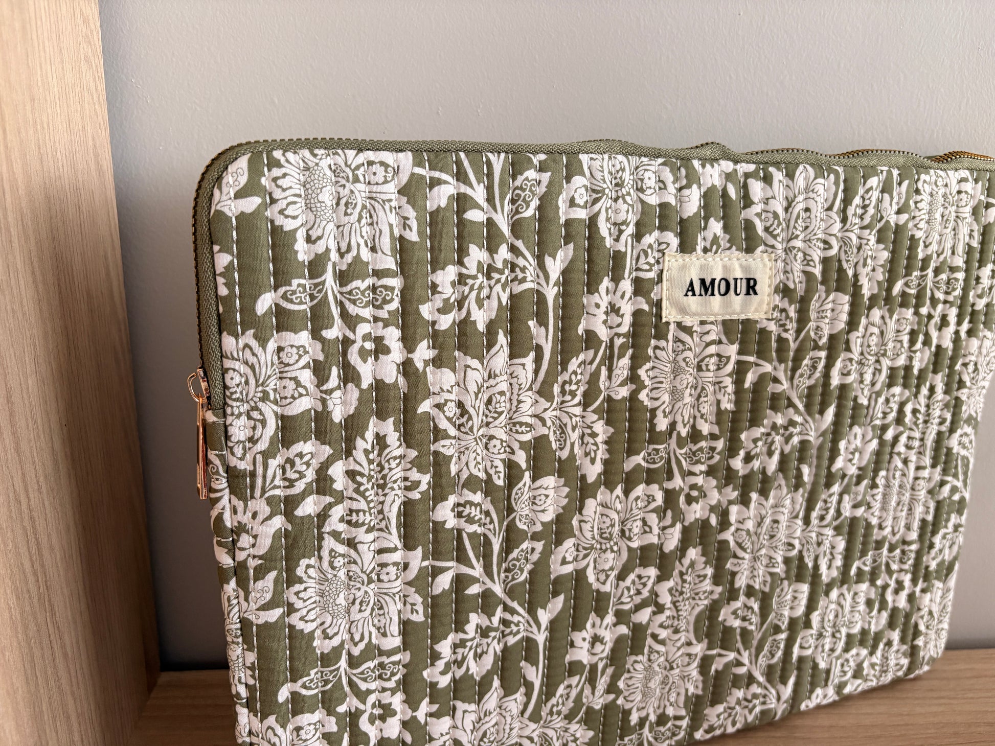 La pochette présente un motif floral d'un blanc élégant sur un fond kaki profond. La marque "Amour" est imprimée sur une étiquette au centre. Les fleurs sont délicatement dessinées, offrant un aspect raffiné à l'ensemble. La forme rectangulaire assure une protection pratique et stylée pour votre ordinateur ou documents.