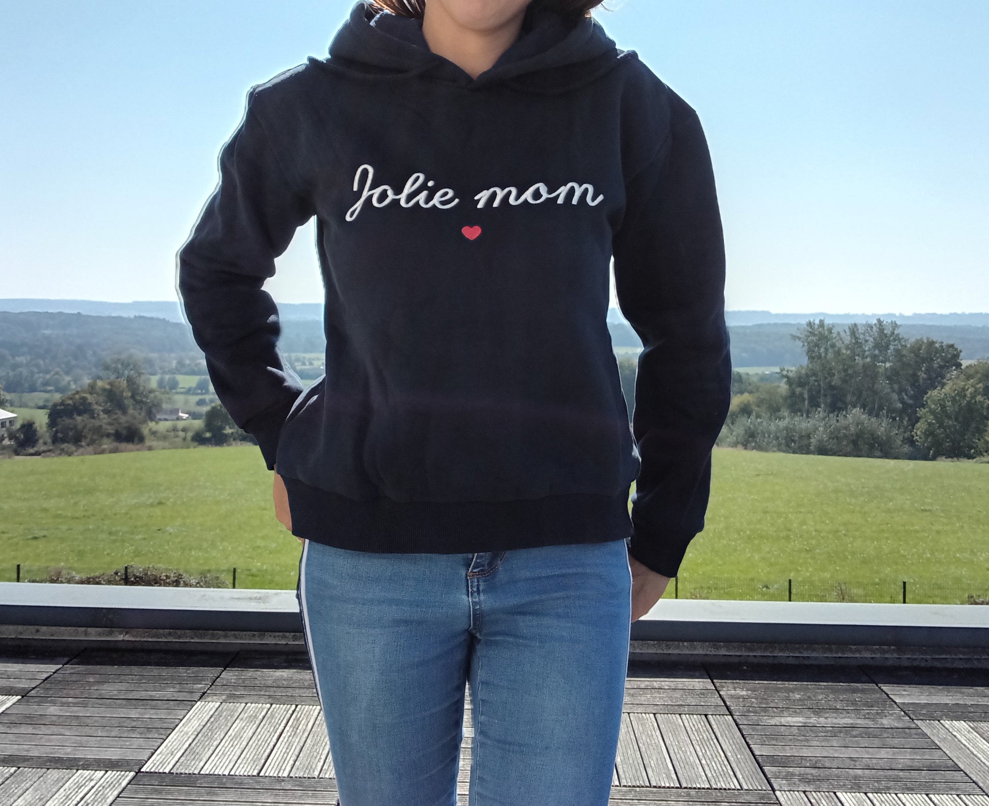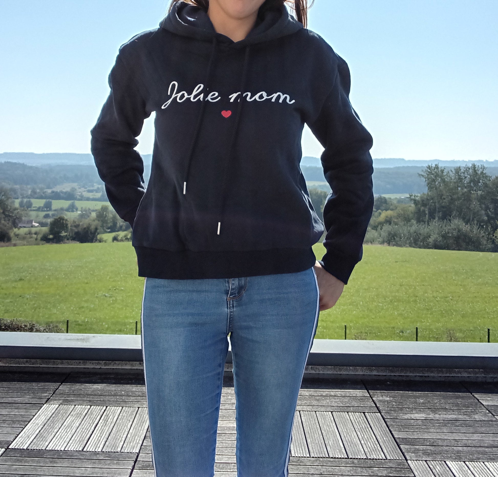 Pull sweat chaud inscription « Jolie Mom » bleu marine