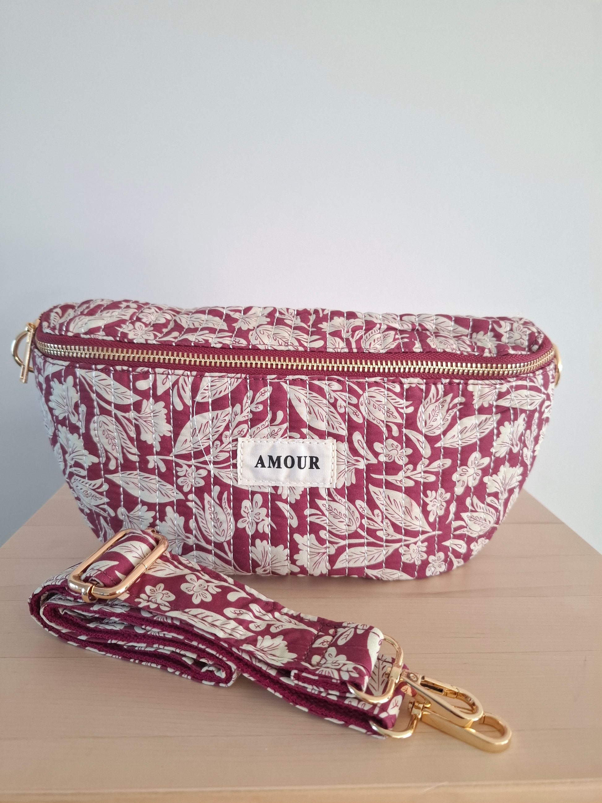 Sac banane coton matelassé liberty floral toile de jouy rouge bordeaux et blanc
