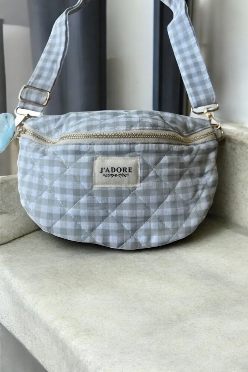 Le sac banane est matelassé avec un motif quadrillé vert d’eau et blanc qui lui confère un aspect sophistiqué. Une fermeture éclair dorée traverse le dessus du sac, ajoutant une touche d'élégance. Le logo "J'ADORE" est visible à l'avant, donnant une identité forte à l'article. La sangle est assortie, avec un design quadrillé vert d’eau et blanc similaire, et est attachée par des boucles métalliques robustes.