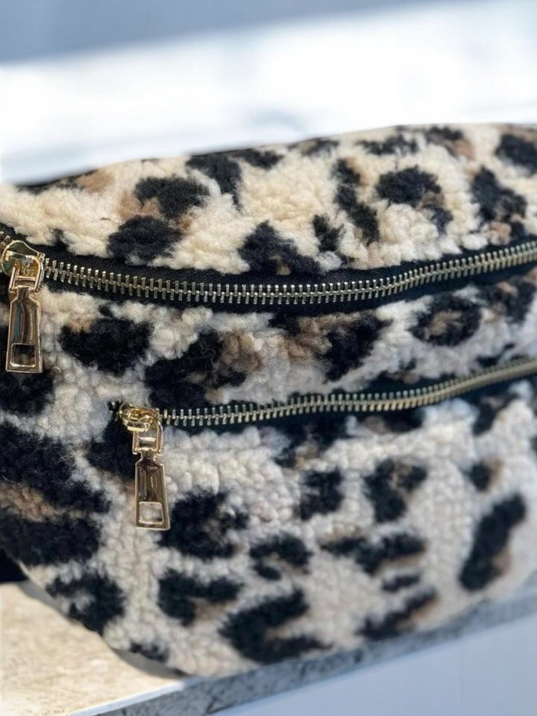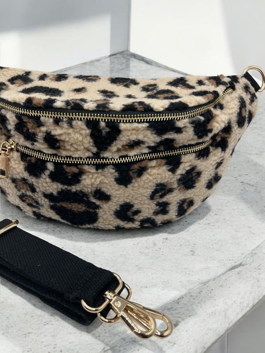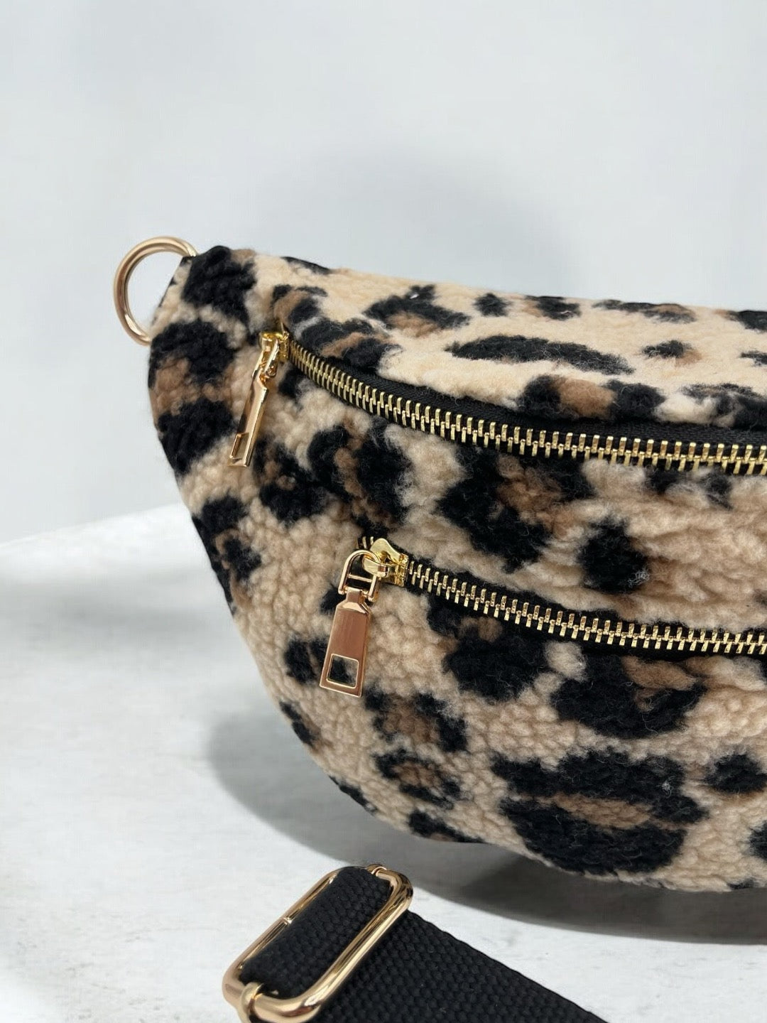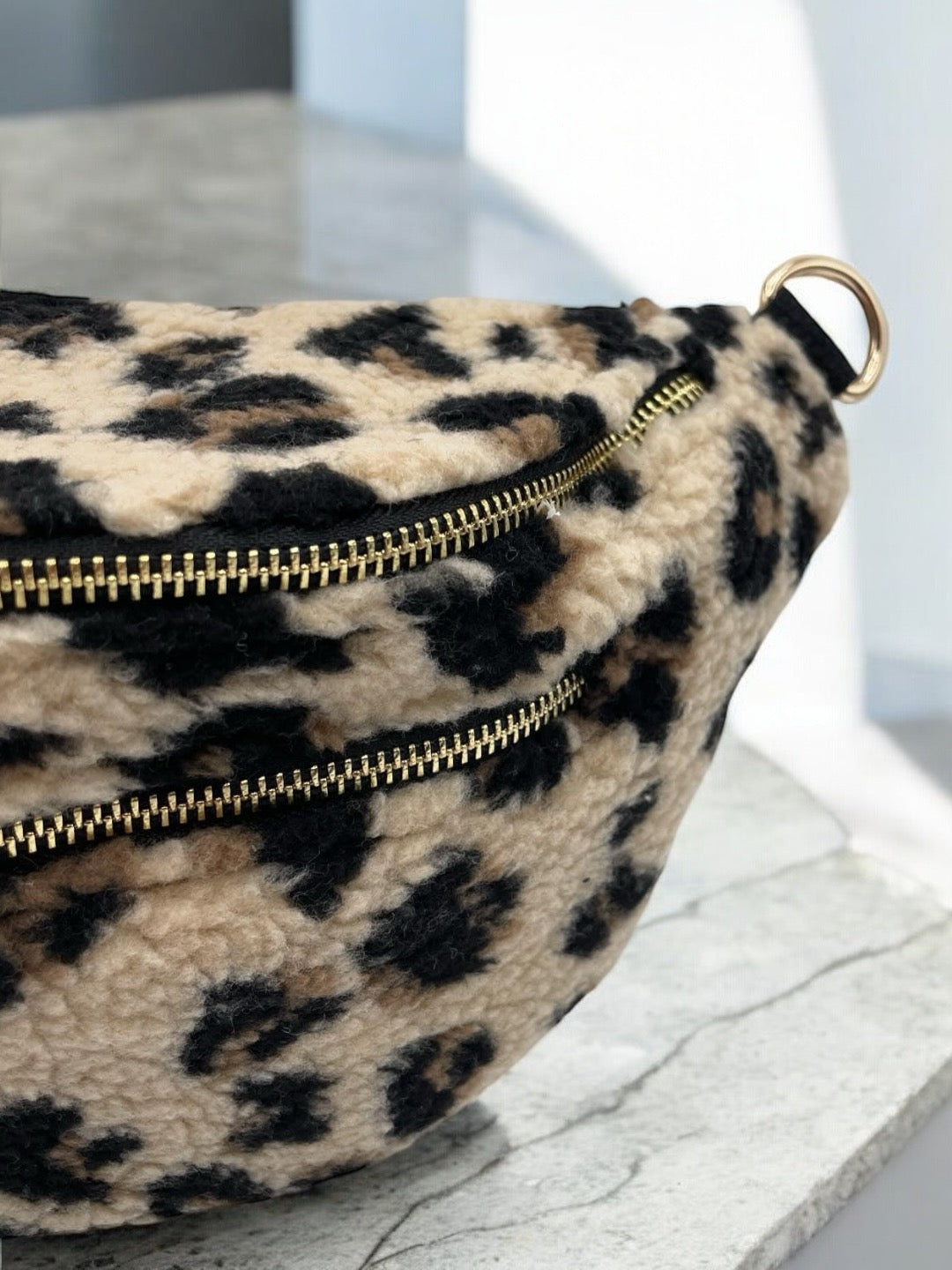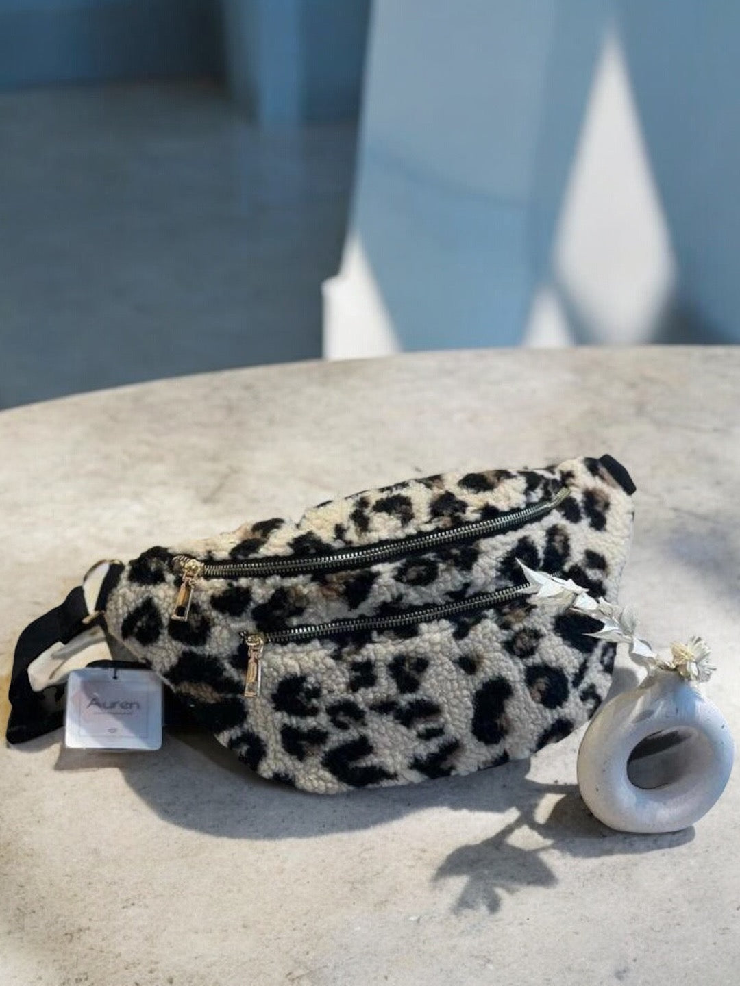 Sac banane XL peluche moumoute 2 poches léopard beige marron