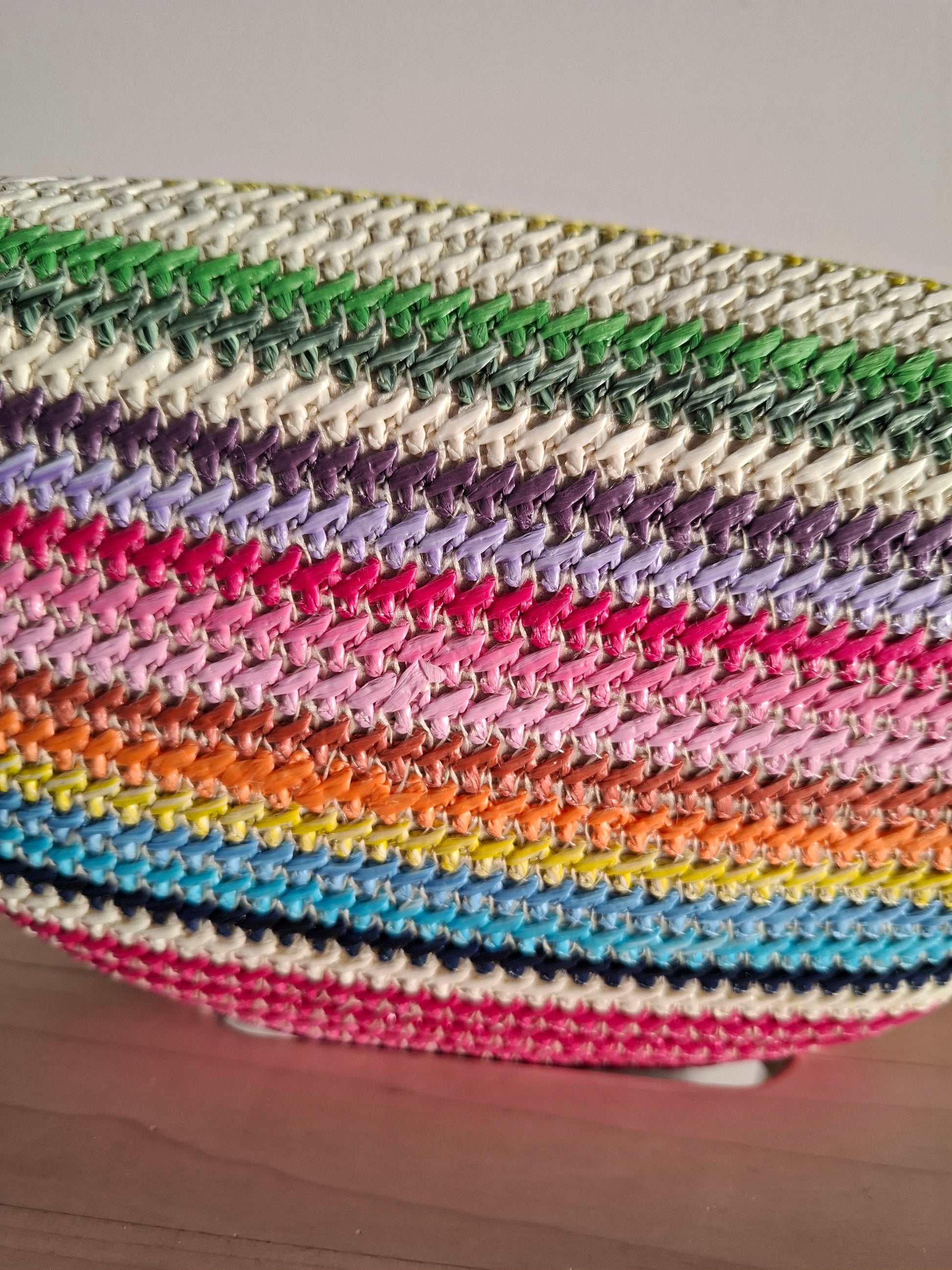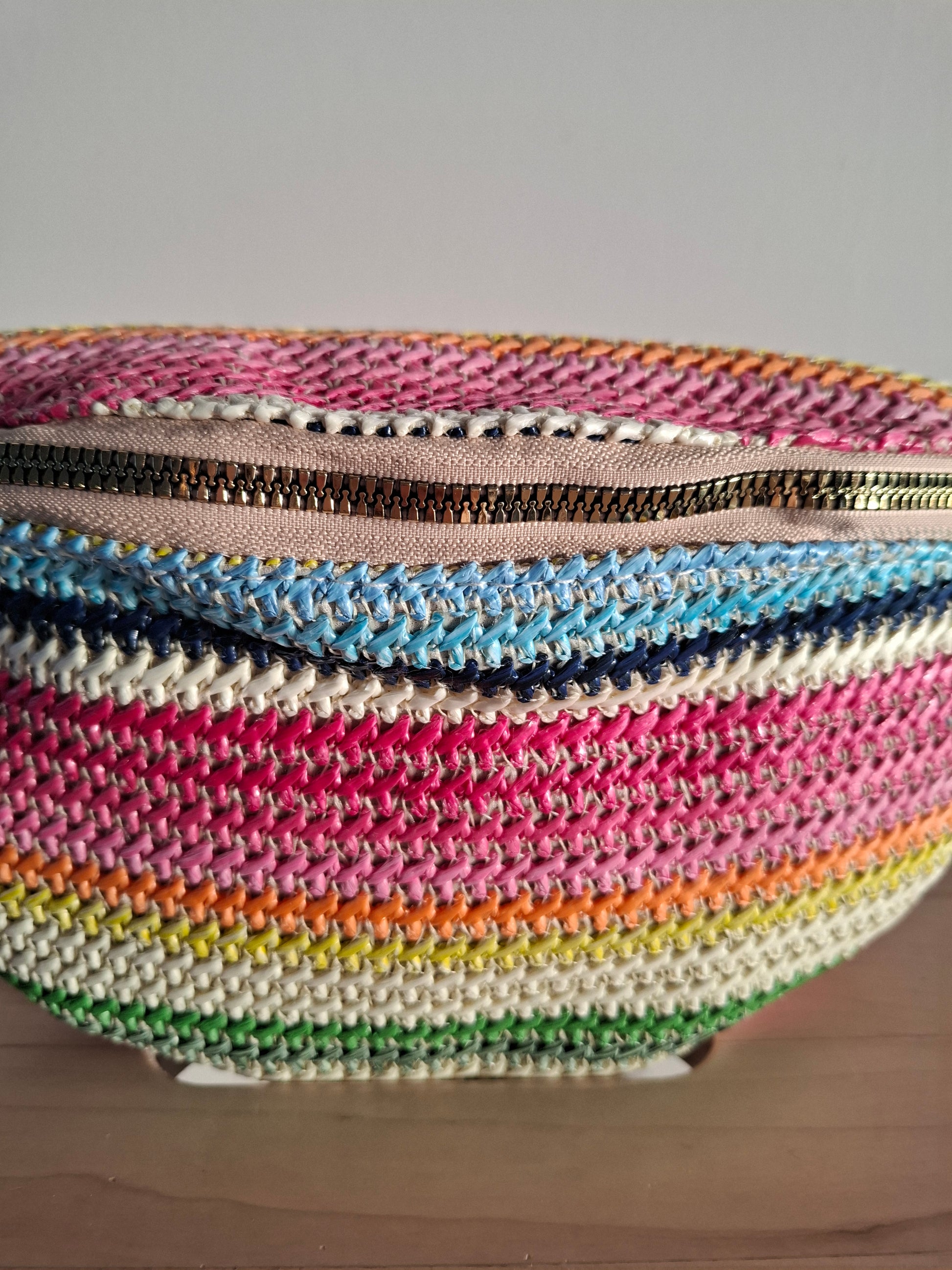 Le sac banane est en tissu avec un éventail de couleurs vives incluant du rose, bleu, vert, jaune et orange. Il est doté d'une fermeture éclair argentée sur le dessus. Le design présente des lignes horizontales colorées qui apportent un style unique et estival. Il possède une sangle détachable de couleur rose pâle avec des attaches dorées.