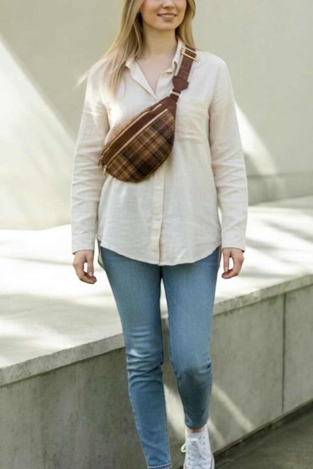 Sac banane en tissu motif écossais tons marrons sangle fantaisie