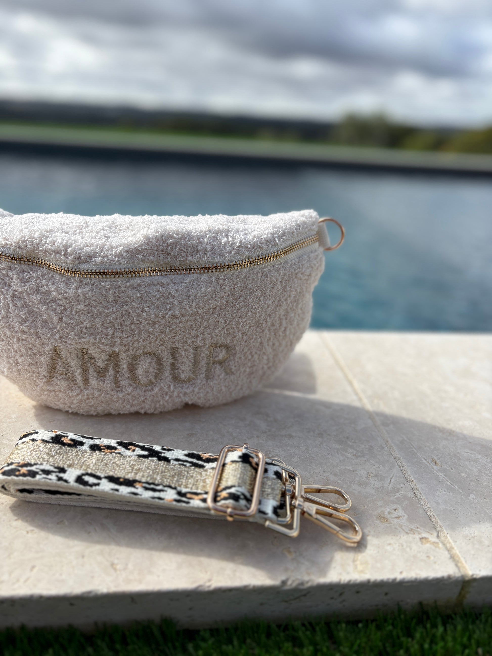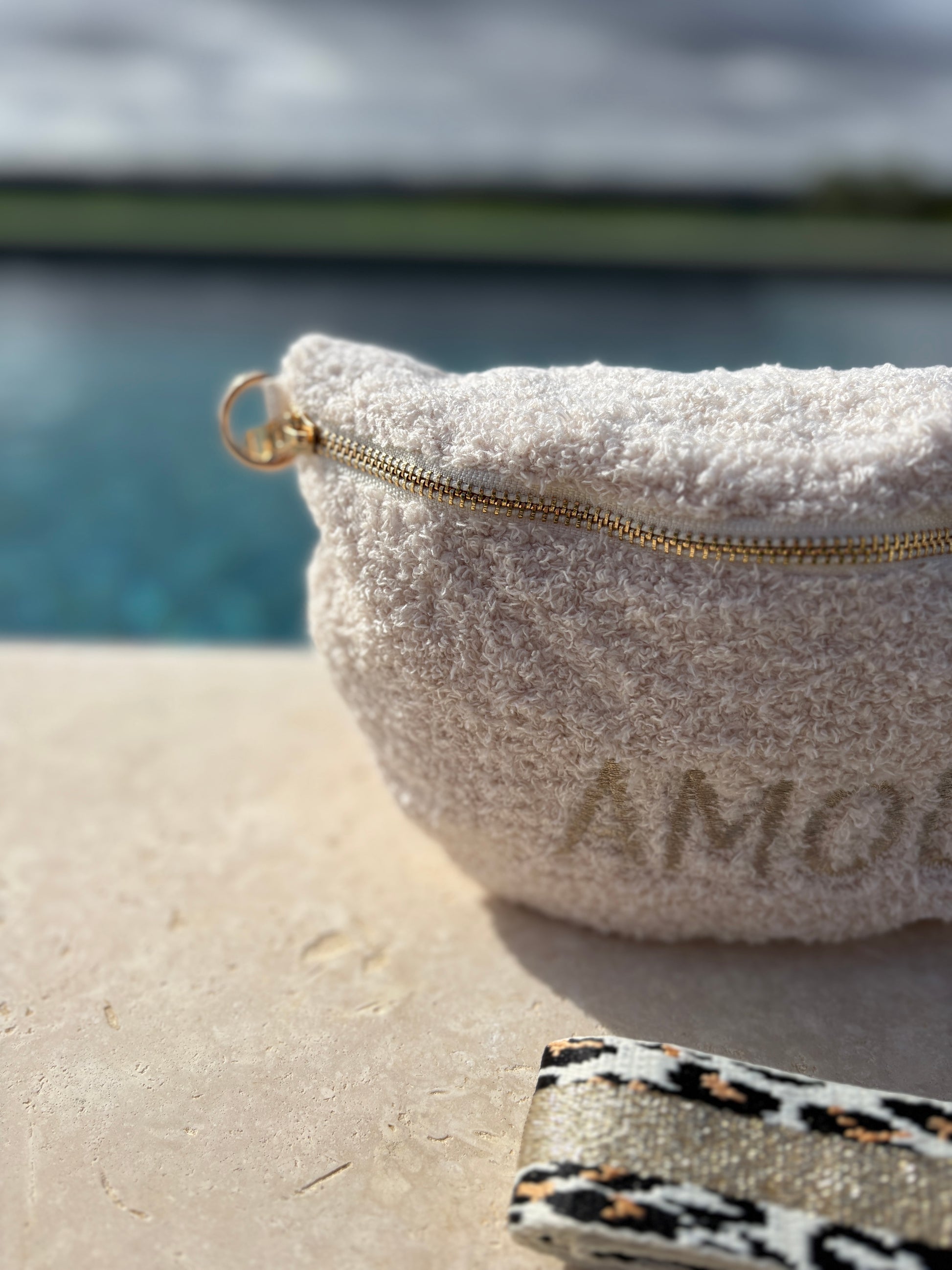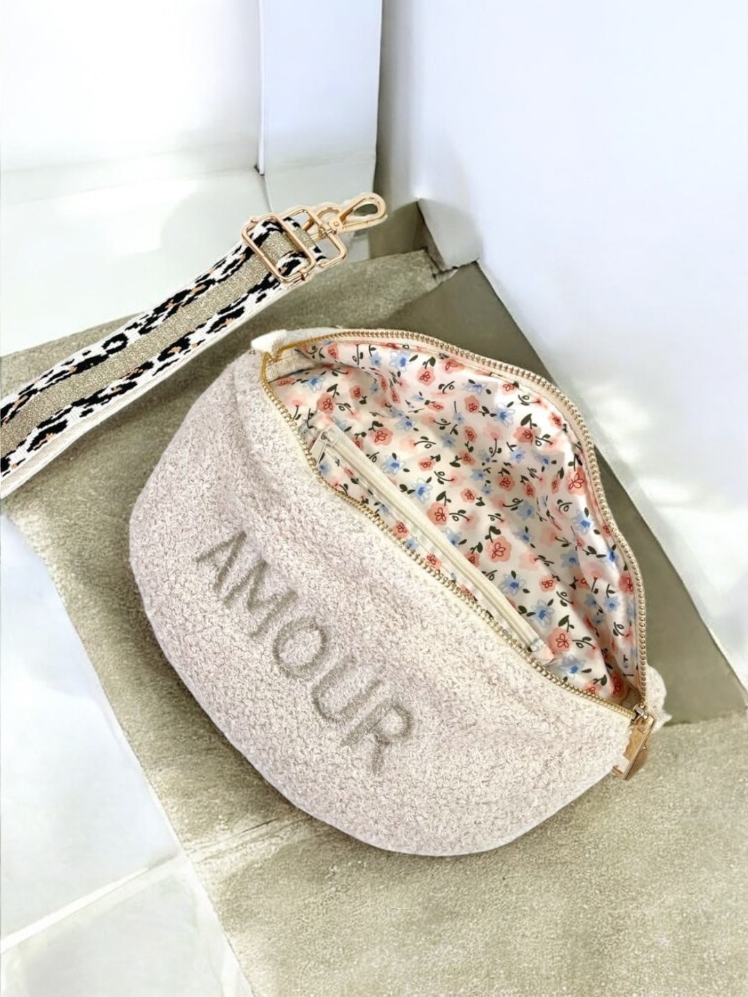 Sac banane en tissu moumoute douce bouclette beige inscription "AMOUR" sangle fantaisie léopard